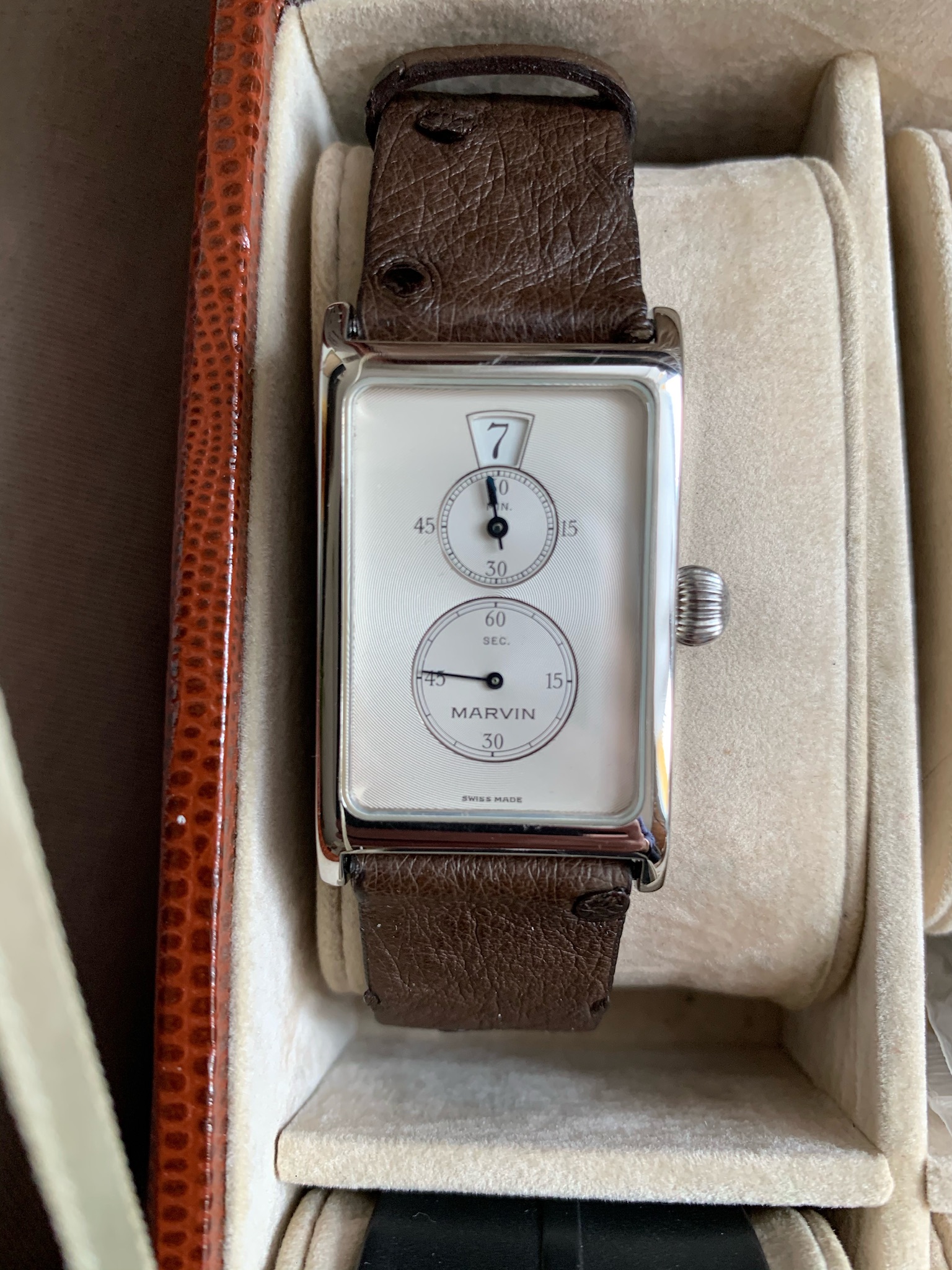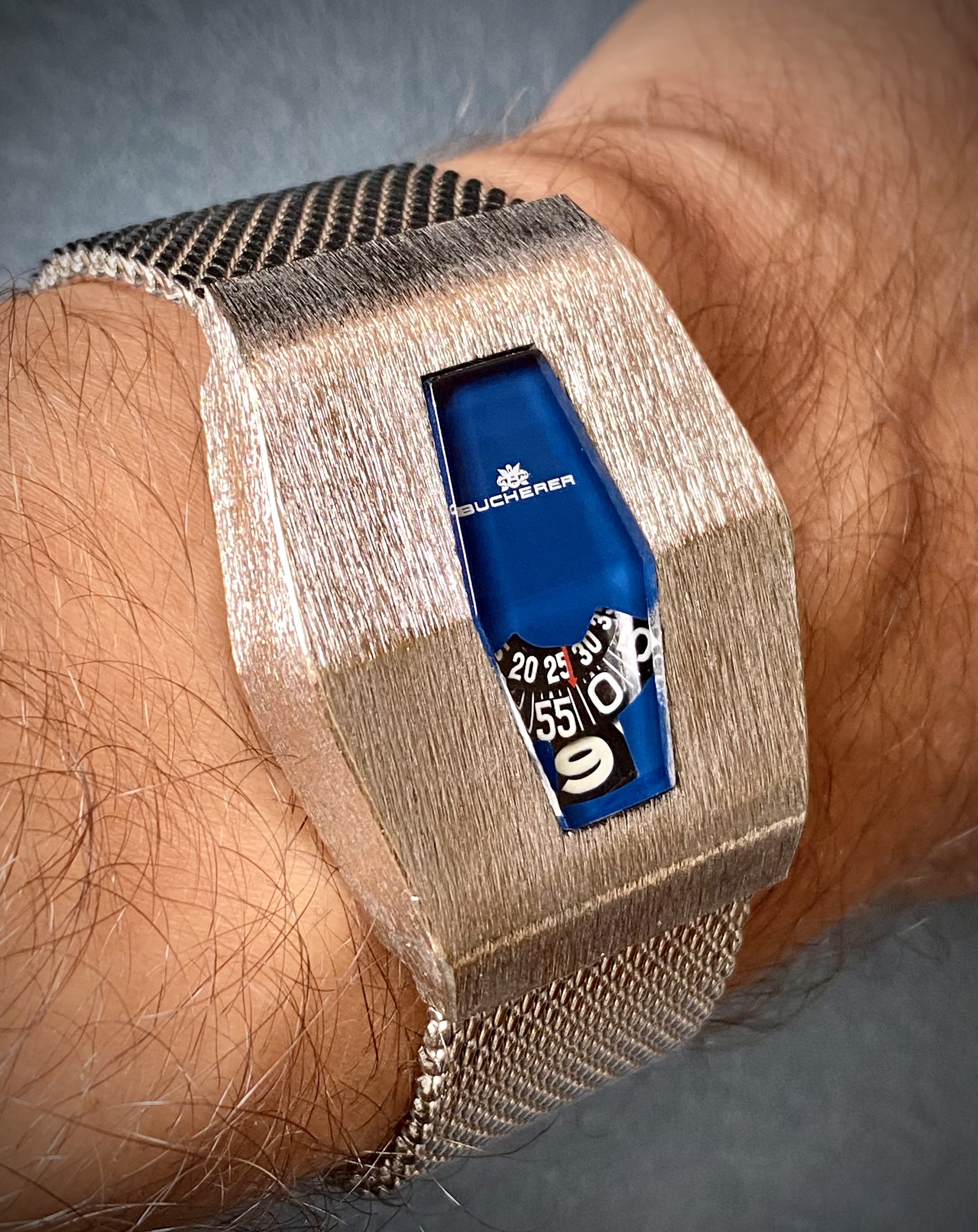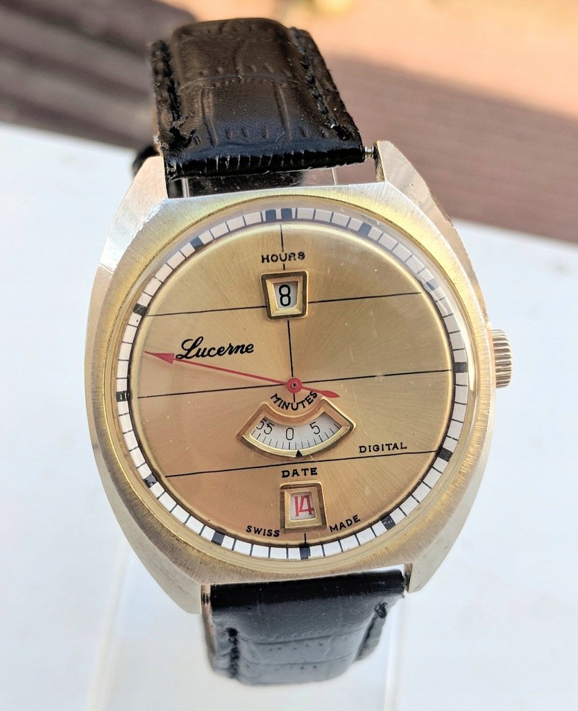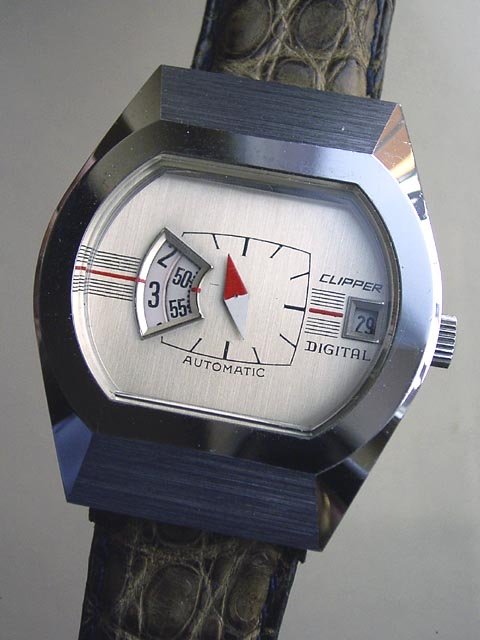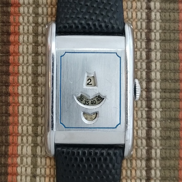 So regarding the Sky Raker, it is indeed quite rare. I've barely found a few photos of it. No video yet to see it functioning, and certainly no images showing the movement to see the H/M/S components. I'm having a tough time reconciling/figuring the hours disk versus the day-of-month disk. Looking the the photos, the hours disk is below the minutes and seconds disks. Next, the DOM disk is deeper down below the hours disk, through which we're somehow able to see DOM. My only guess so far is that the hours are split between two separate half-disks designed in such a way that they never block the DOM window. I hope this makes sense.