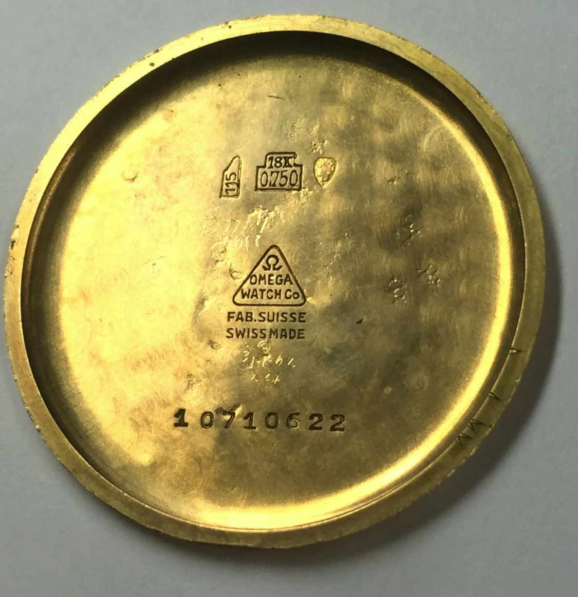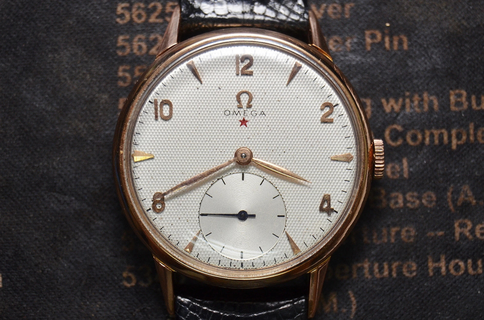 It is an Omega 18k rose gold, metal indices, honeycomb dial with 30T2 movement from 1944 (it also got the red star)