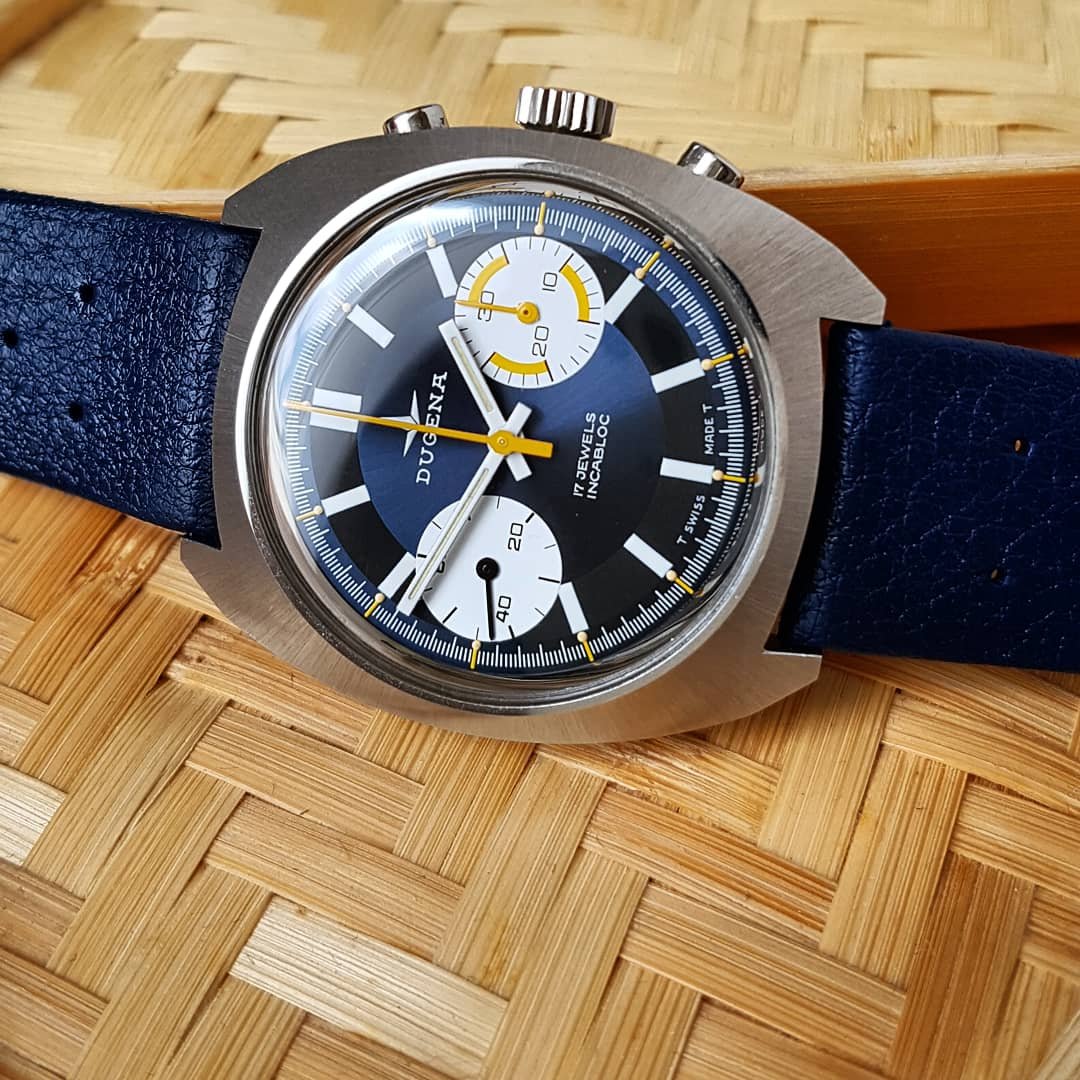 Another Dugena powered by the Valjoux 7733 workhorse, showing some resemblances to serious racing chronographs - poor man's Autavia anyone?