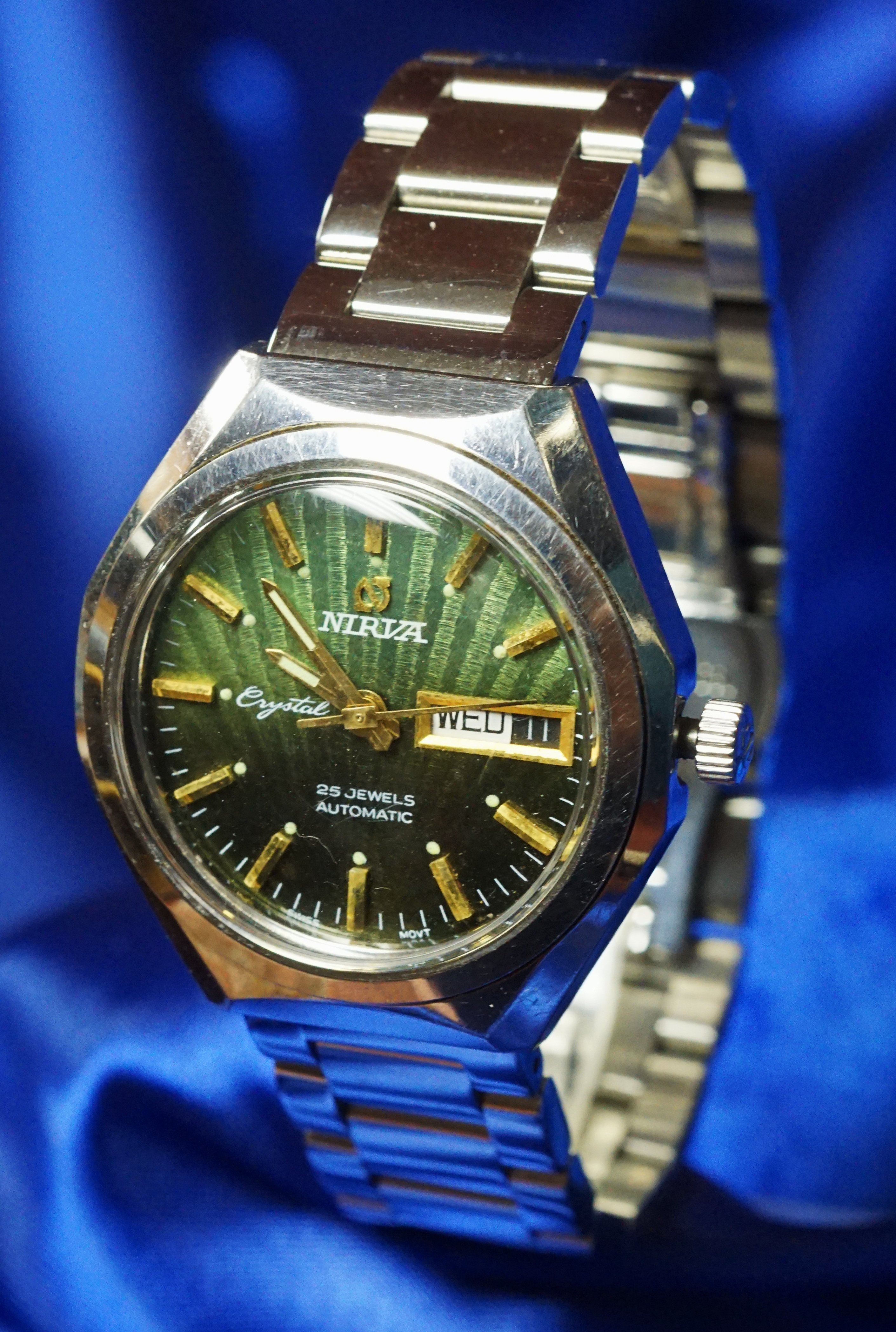 Engraving on outside case back: embossed Nirva “N” in center; Automatic; All Stainless Steel; Antimagnetic; Waterproof
