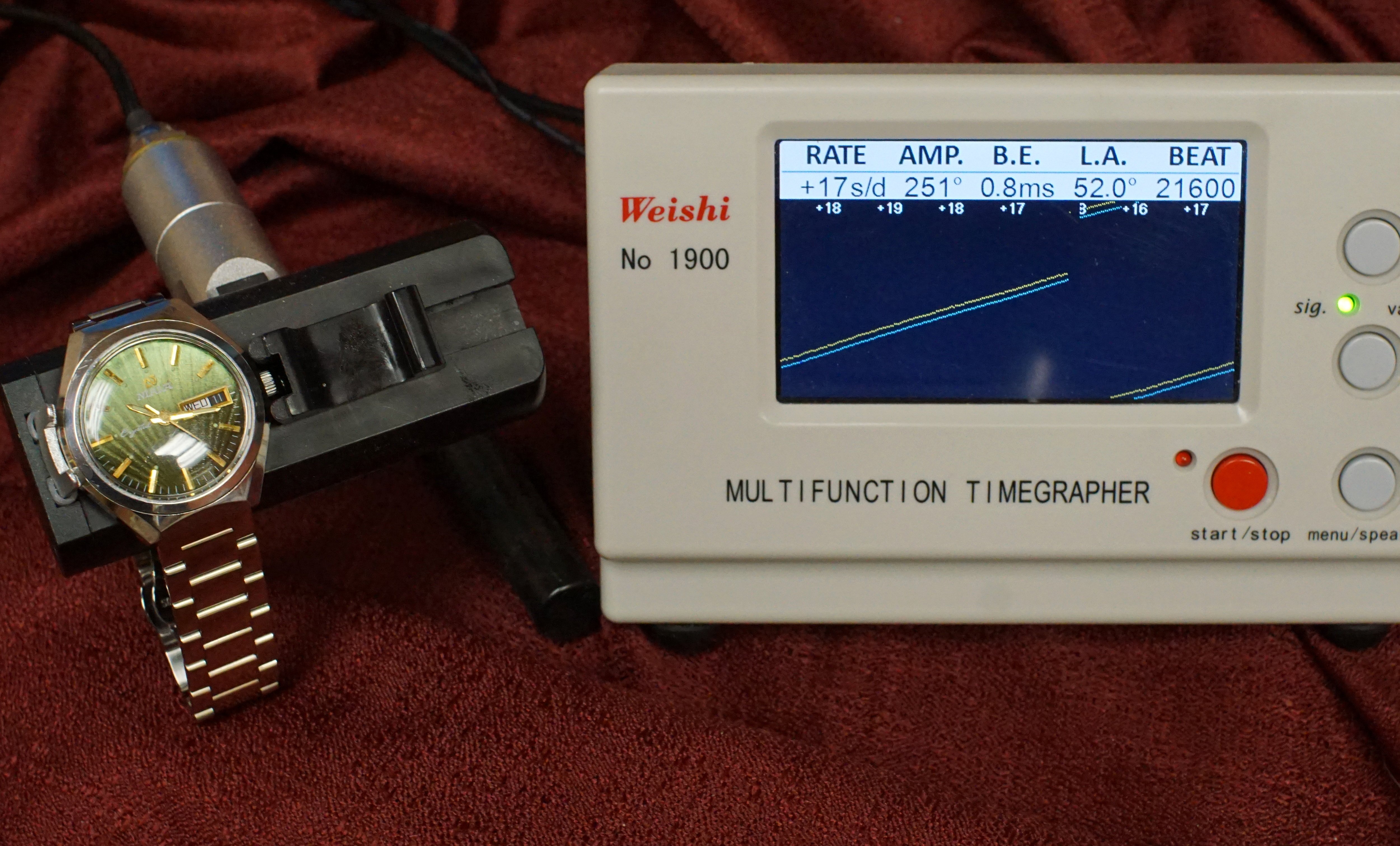 Timegrapher readings in dial up position: +16-19 seconds a day; 251 degrees of amplitude; 0.8 milliseconds of beat error
