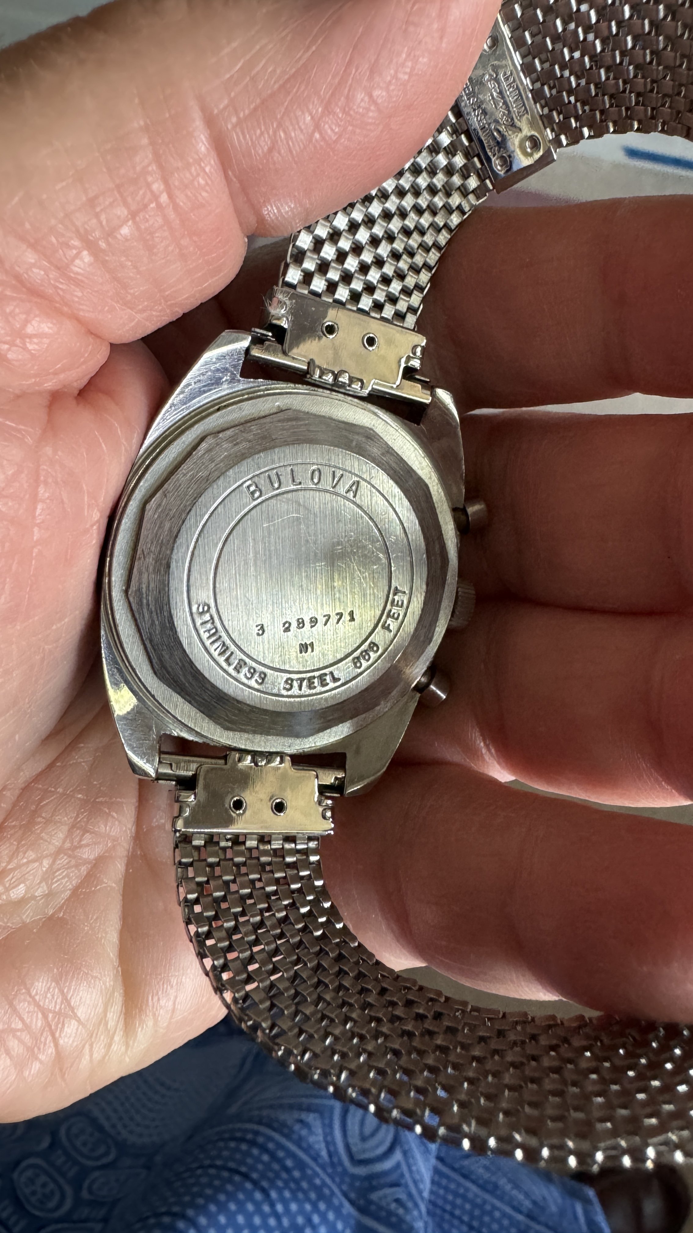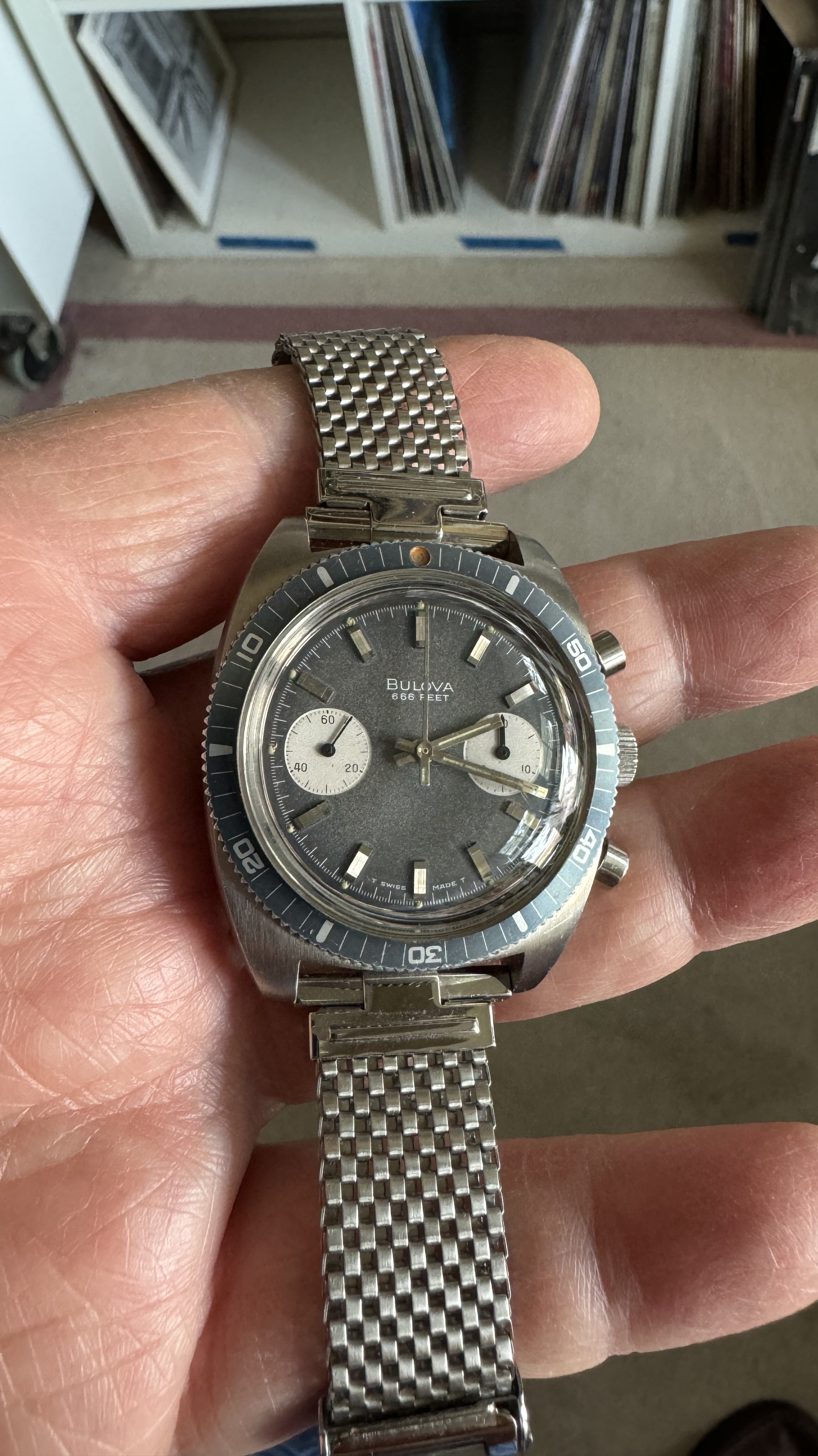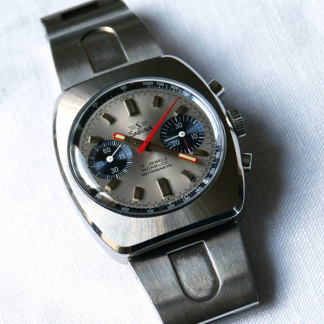 I’m starting it off with a Sabina 7733 chronograph in a tonneau case on what is believed to be its original (signed) stainless steel bracelet.