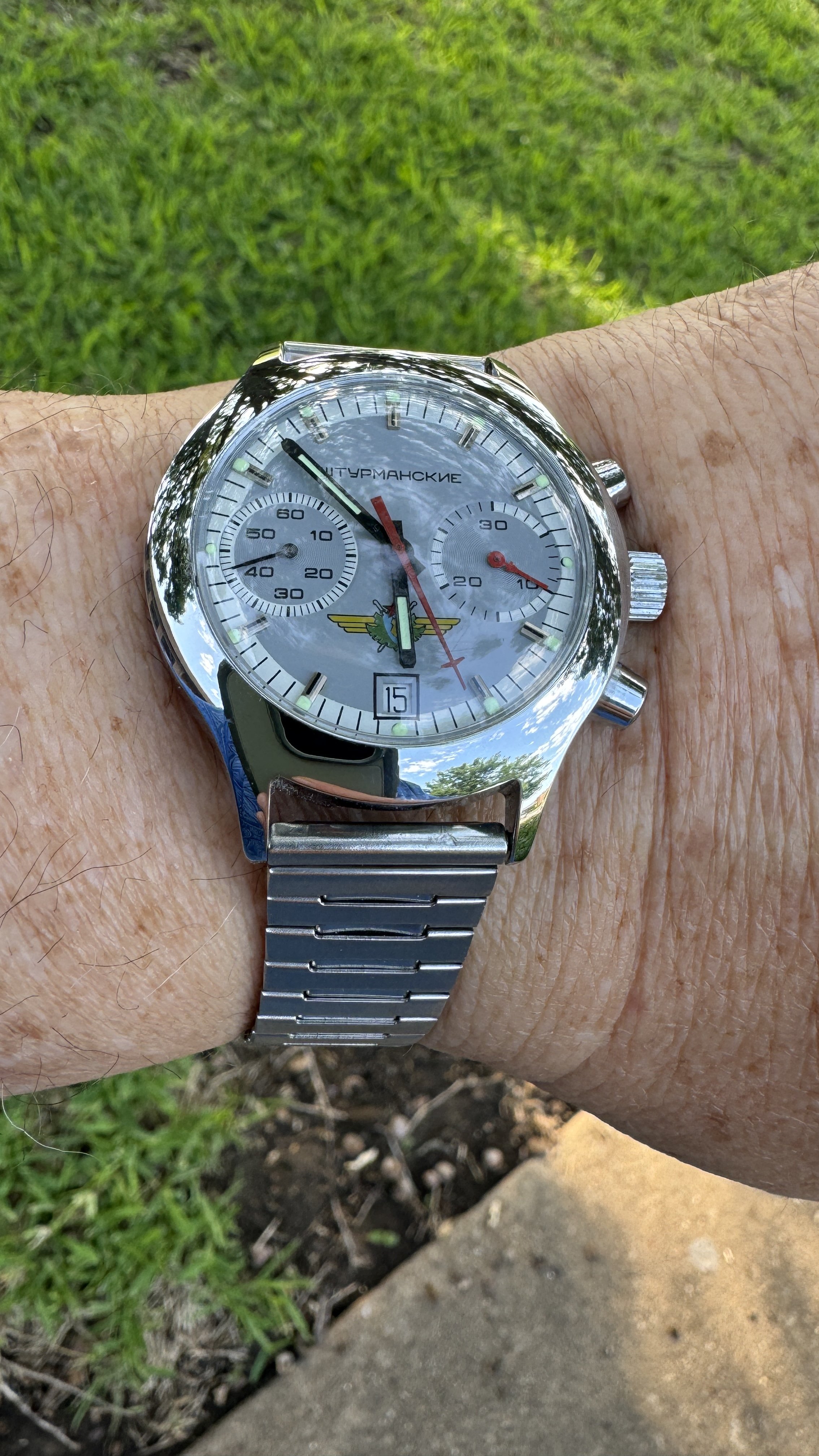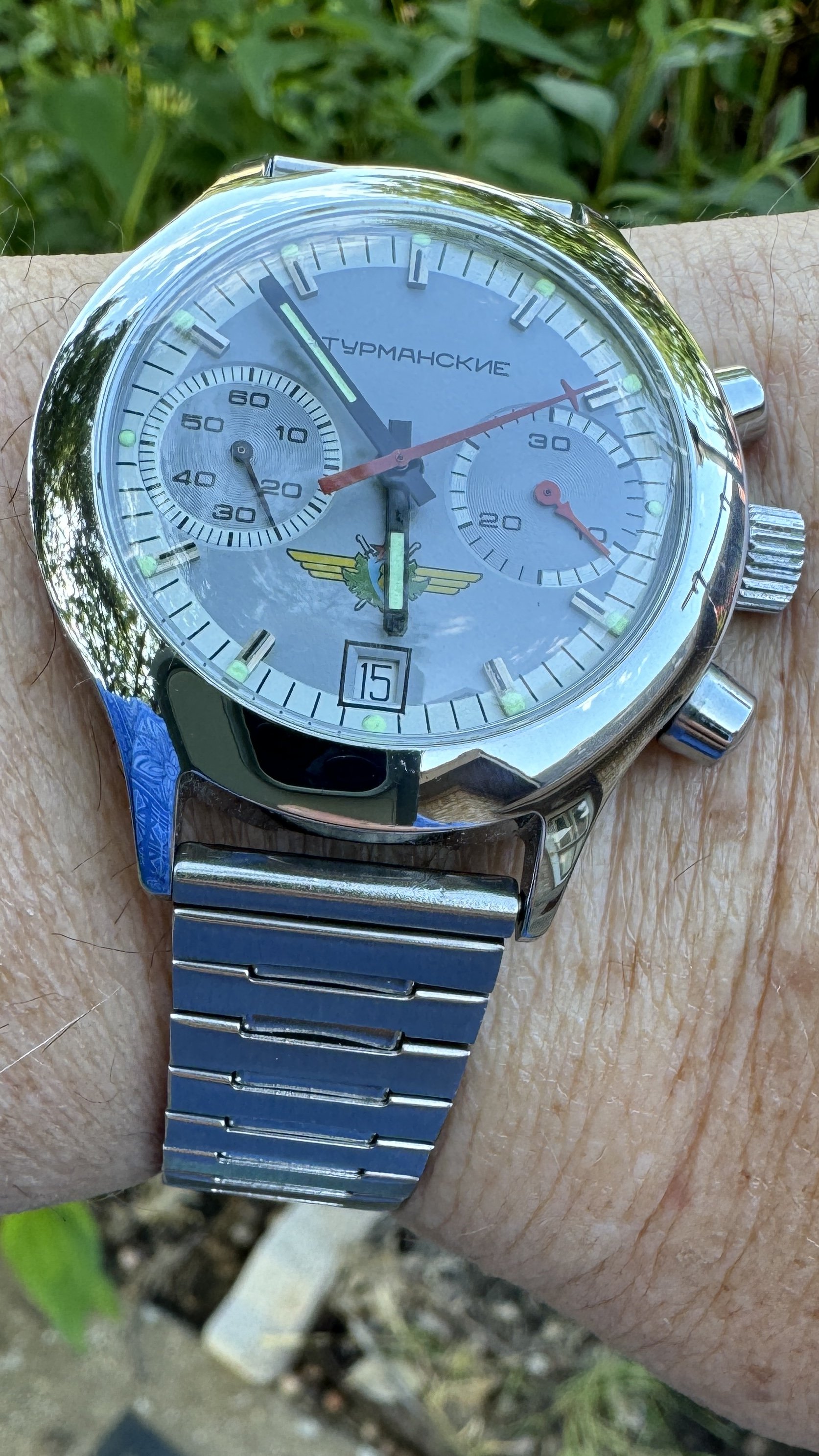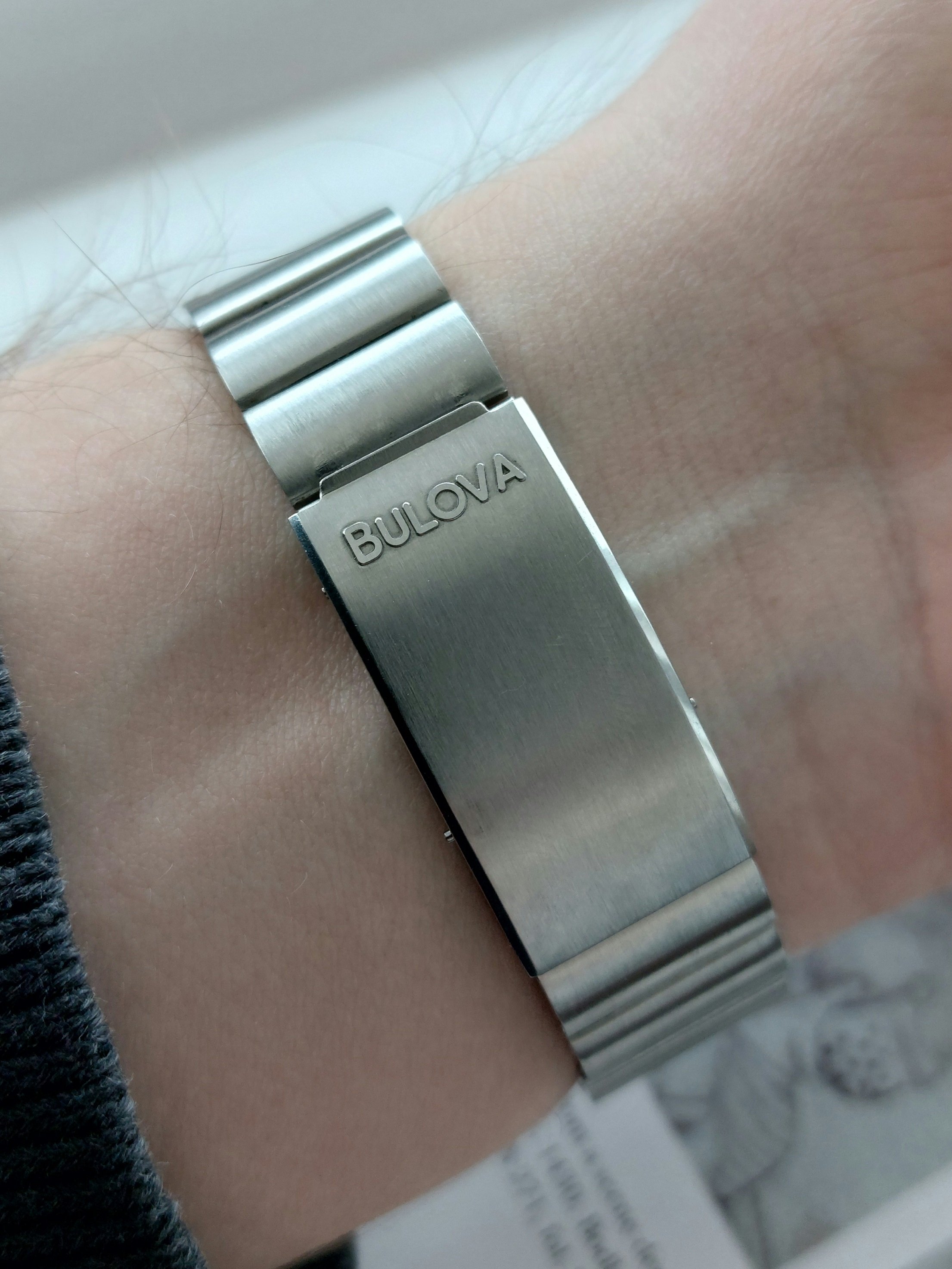 I’m starting it off with a Sabina 7733 chronograph in a tonneau case on what is believed to be its original (signed) stainless steel bracelet.
