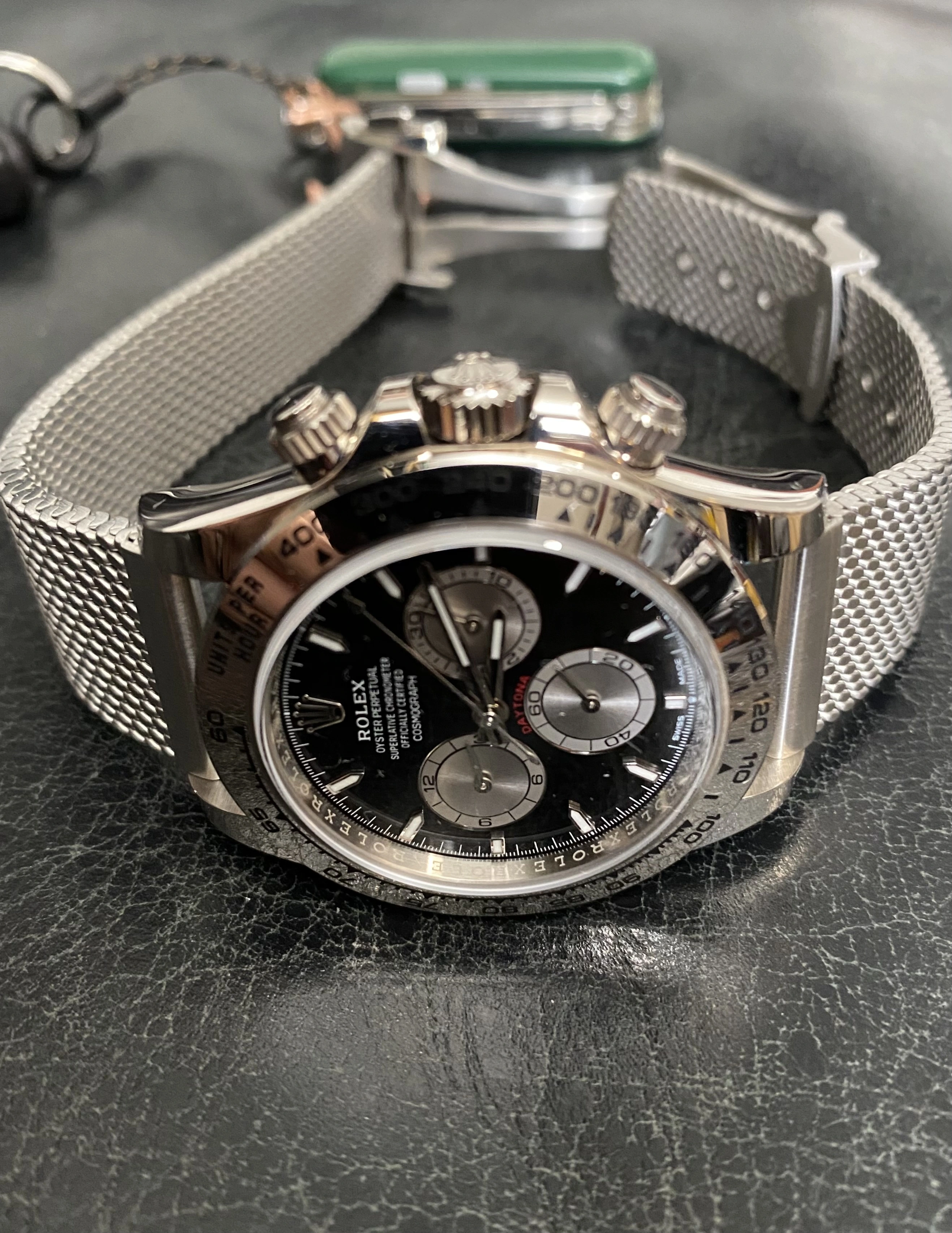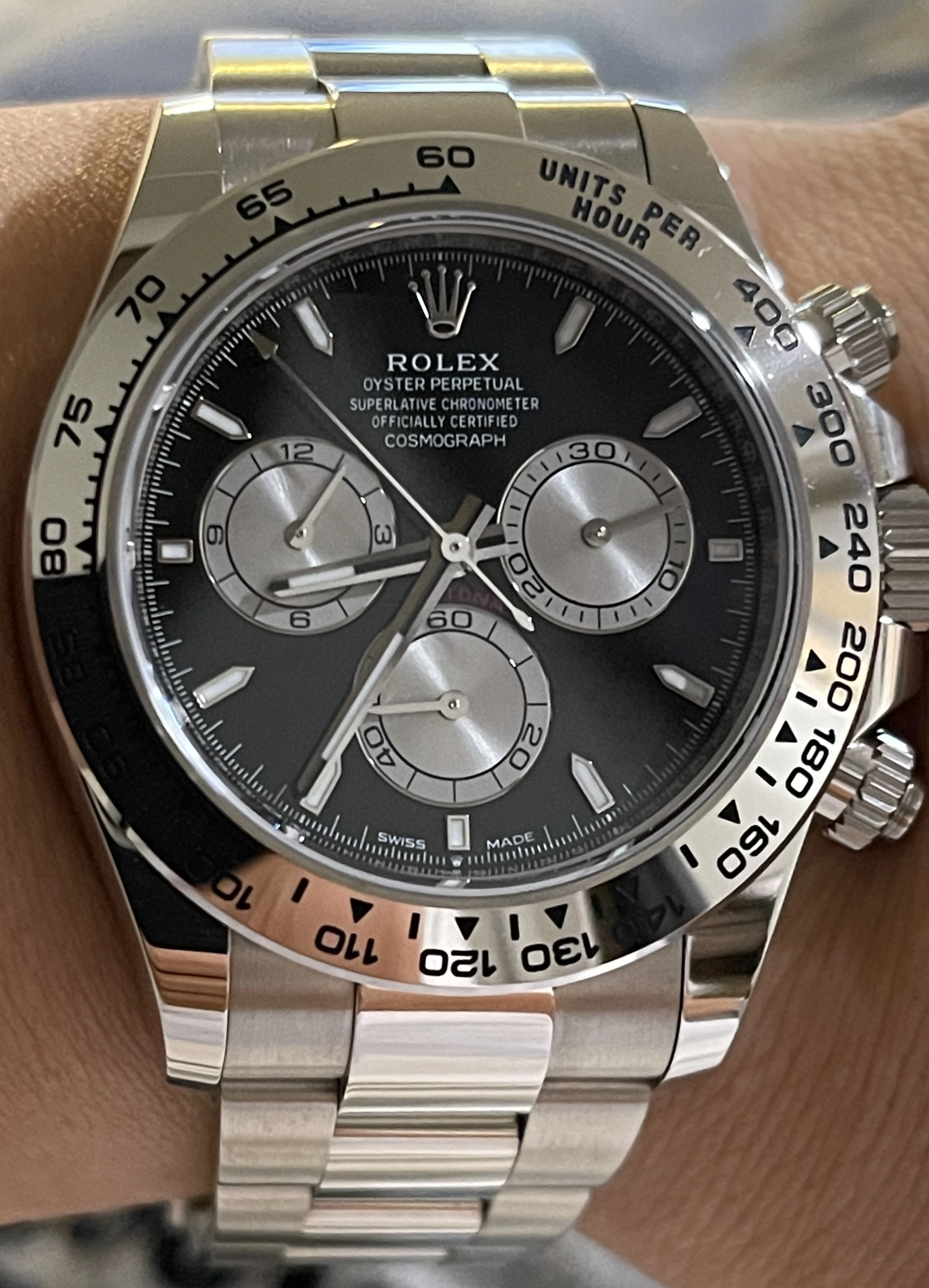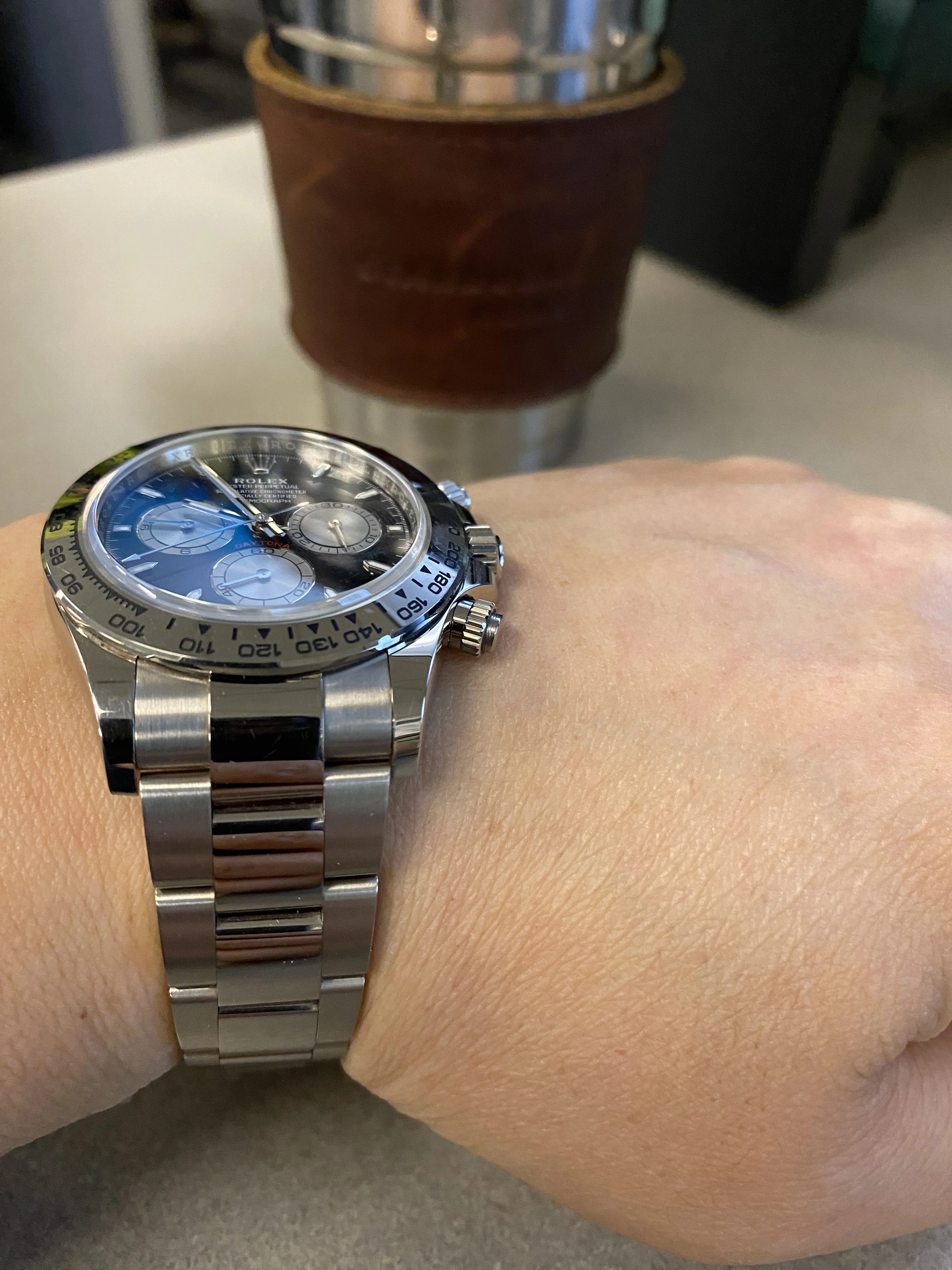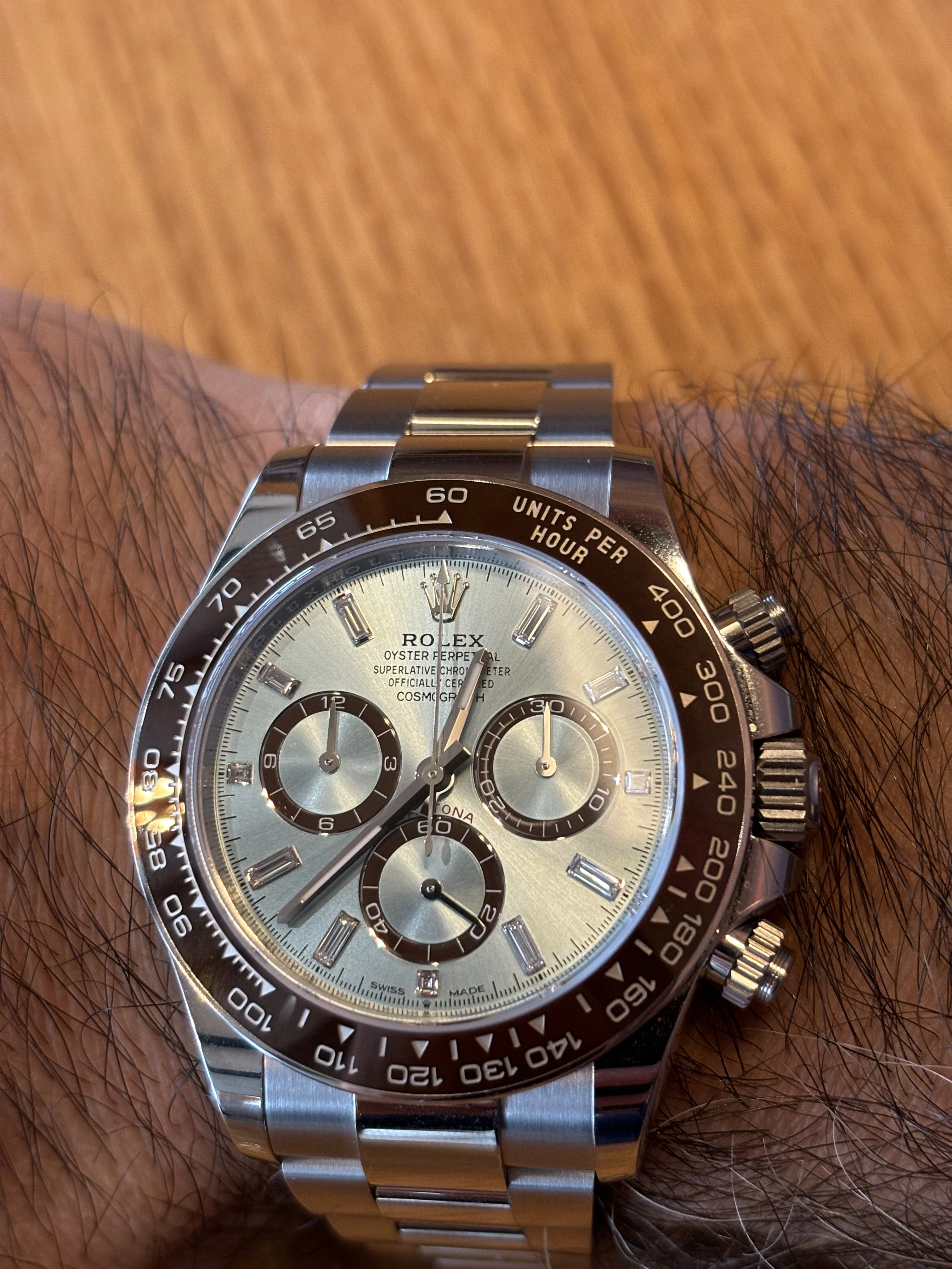 That's a beautiful Daytona - seriously stunning. Got any more shots of it? I'd love to see how it looks in different lighting, maybe outdoors in natural light or on the wrist in a more casual setting. Always cool seeing how a piece like that wears in real life.