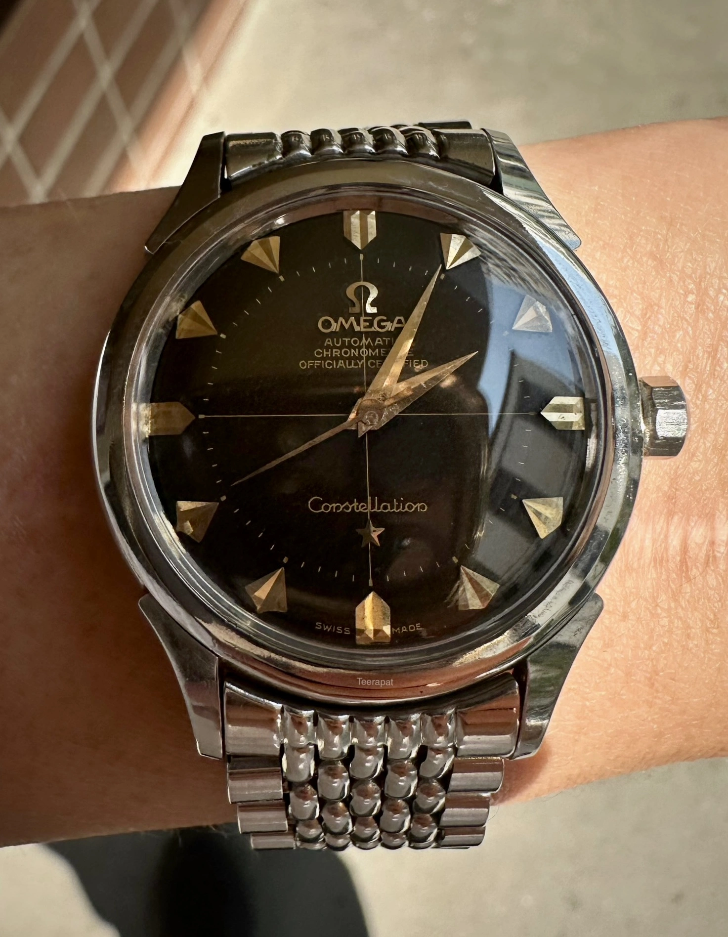 My steel case with yellow gold hardware comes with the black pie-pan dial.