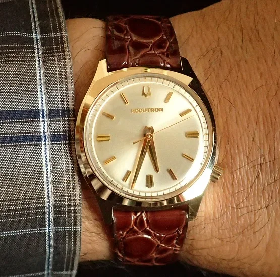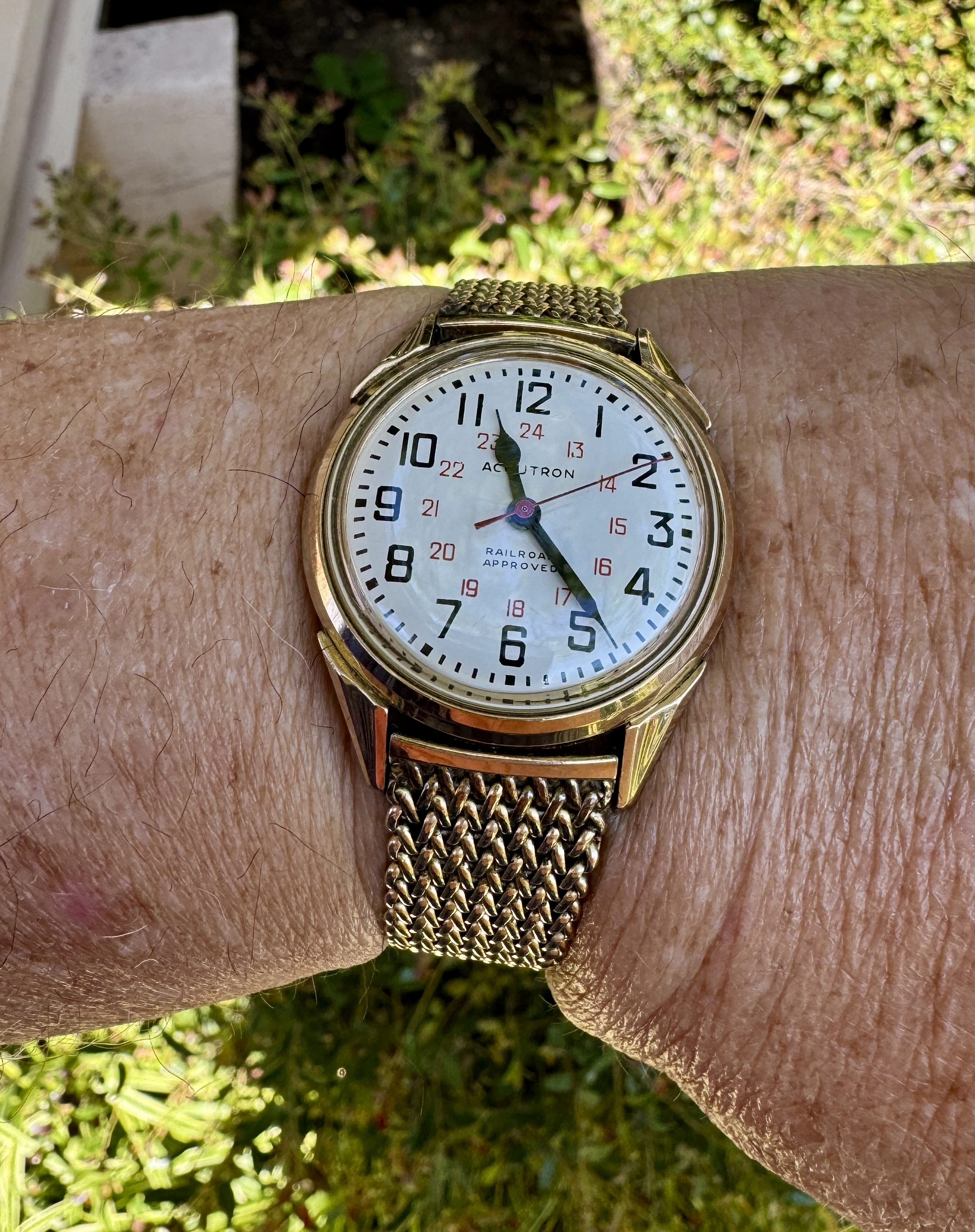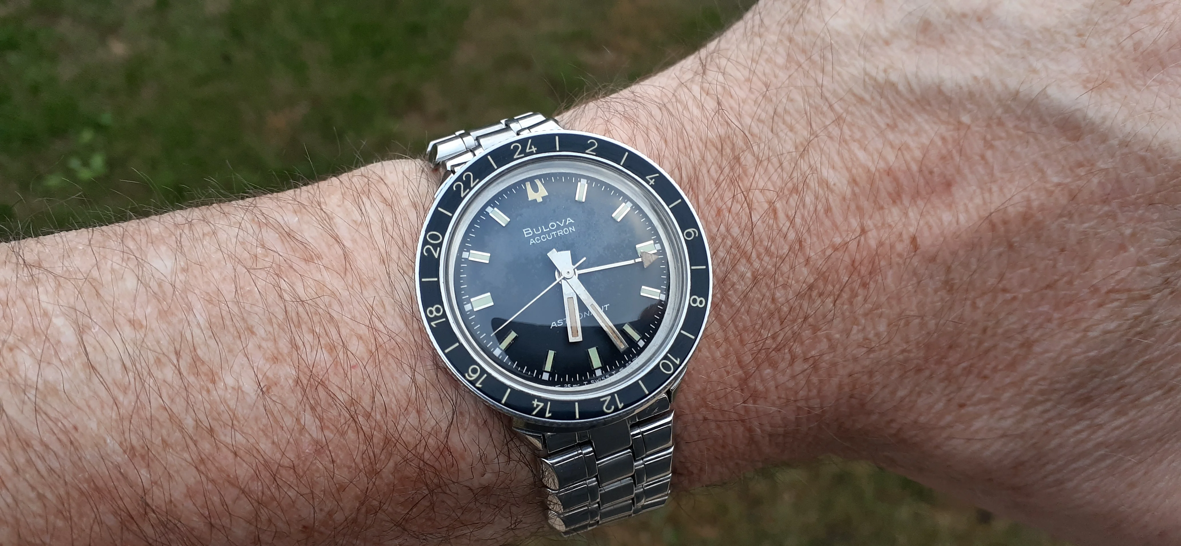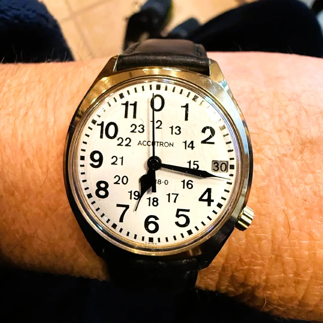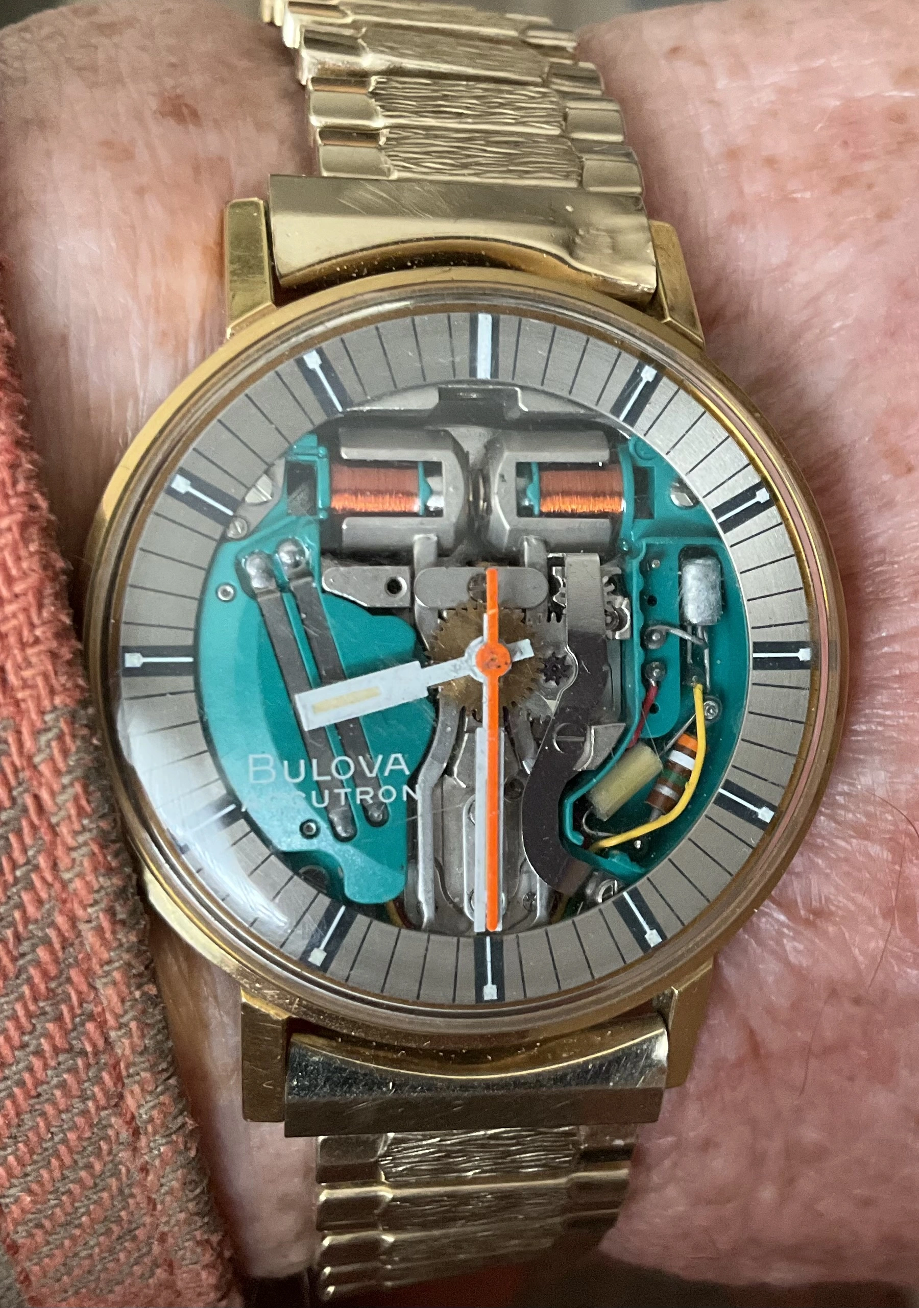 Lots of Spaceviews today. This is mine. Acquired in pieces from a “watchmaker” who could take them apart, but never put them back together! Everything you see is Bulova Accutron, and I fitted a random case back which indicates 1967. Could be! I have everything I need to put together a Spaceview in a steel case. Perhaps sometime.