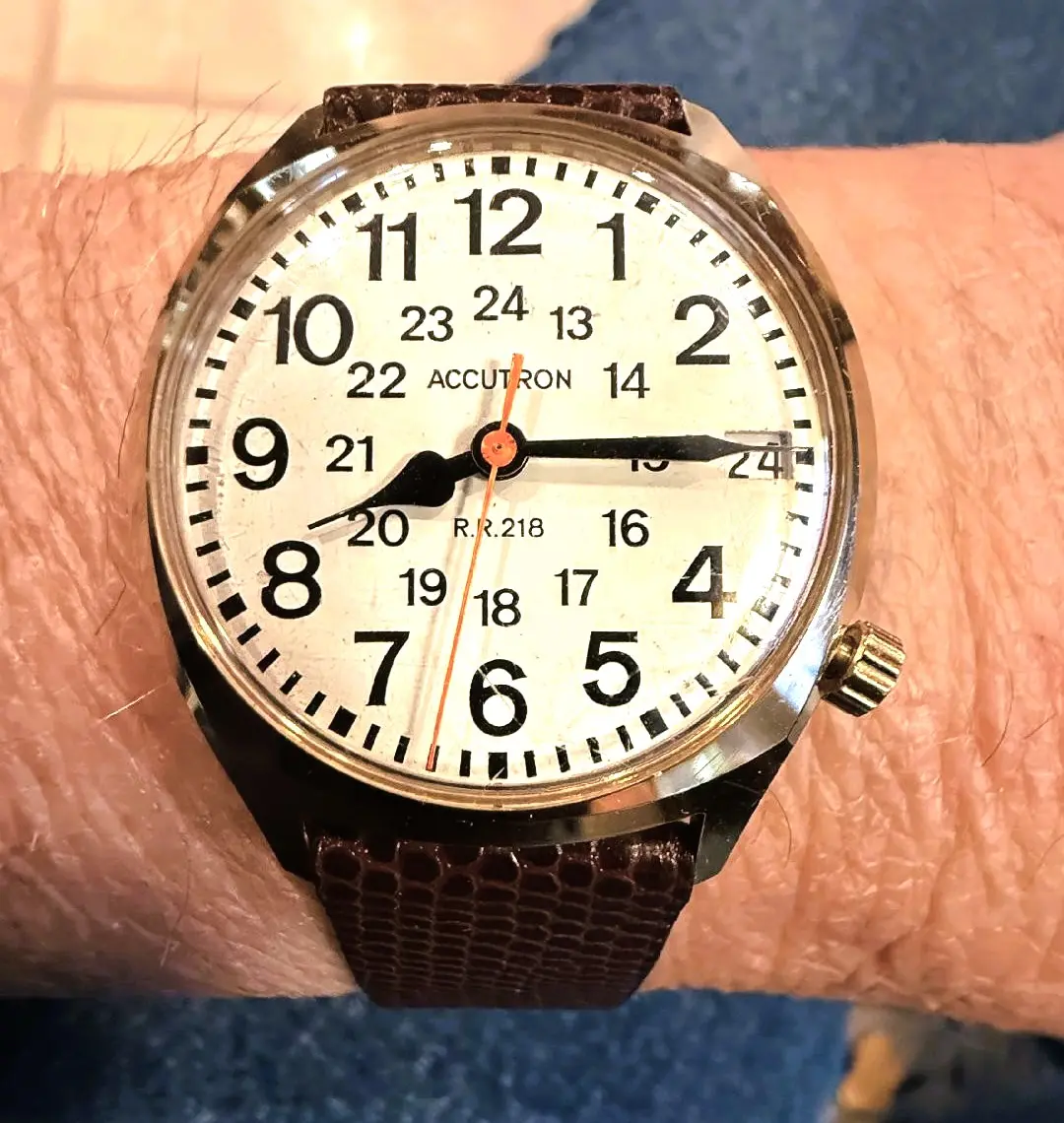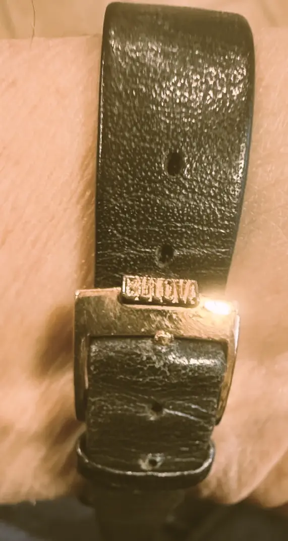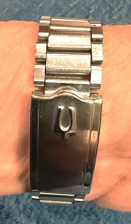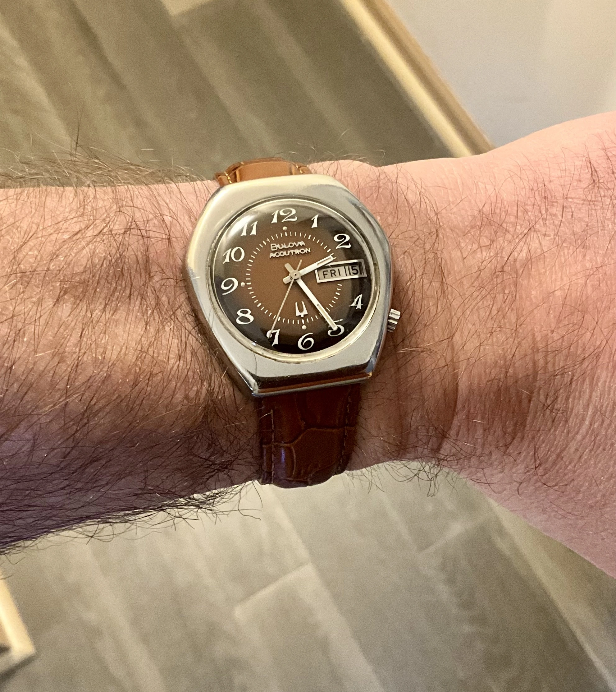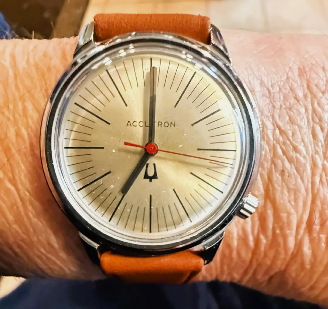 My late father’s 1973 Bulova Accuquartz. He passed away in 1976, so this watch was only worn by him for about 3 years. The Accuquartz was Bulova’s last gasp effort to compete with the landslide of cheap quartz watches that arrived in the market in the early 1970s. It is basically an Accutron 218 with a quartz modulator added to the circuit. It was an expensive watch to produce, and Bulova simply wasn’t able to compete, resulting in their ceasing manufacturing in the mid 1970s.