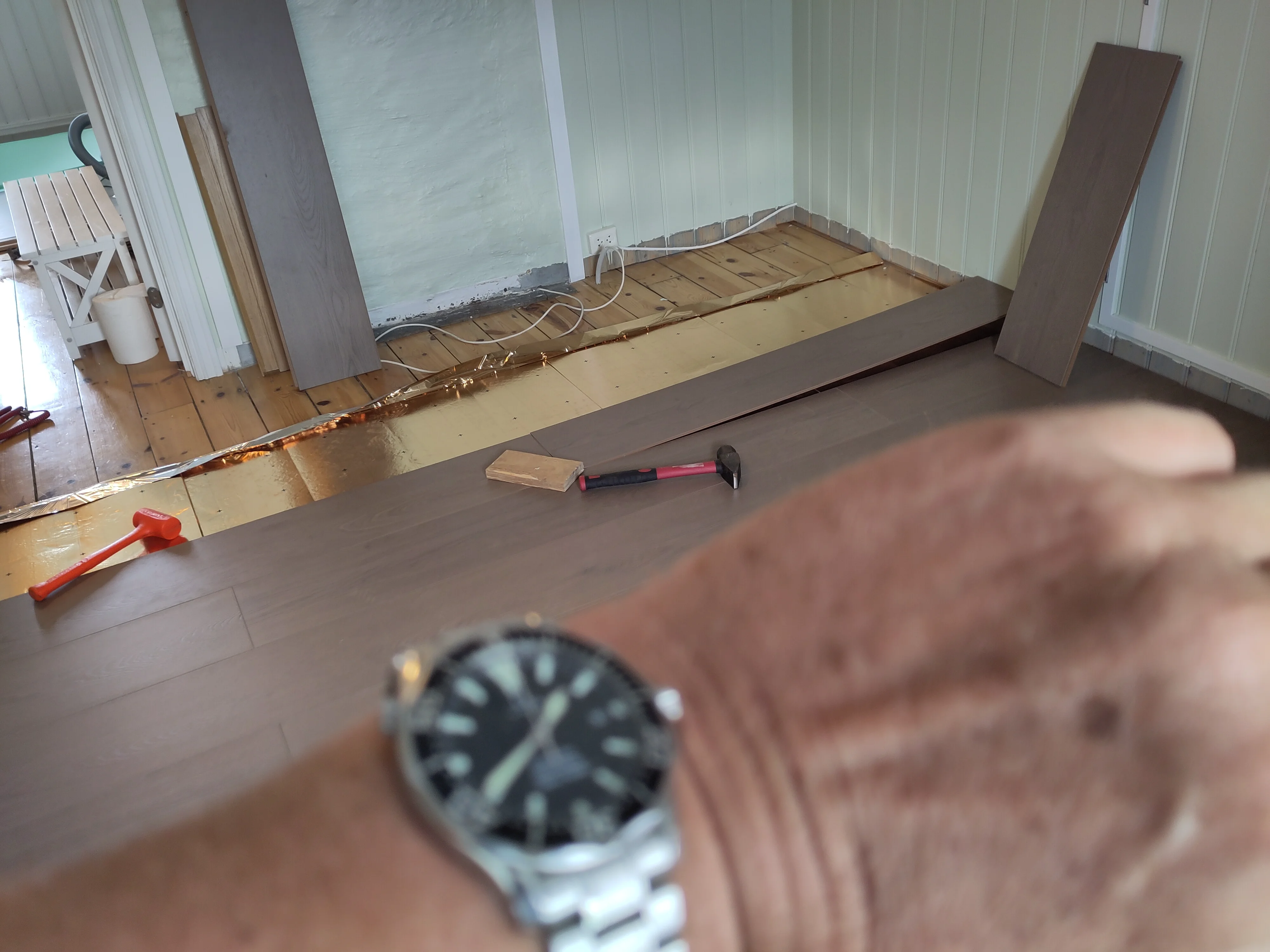 Laying floor boards with my Peter Blake.