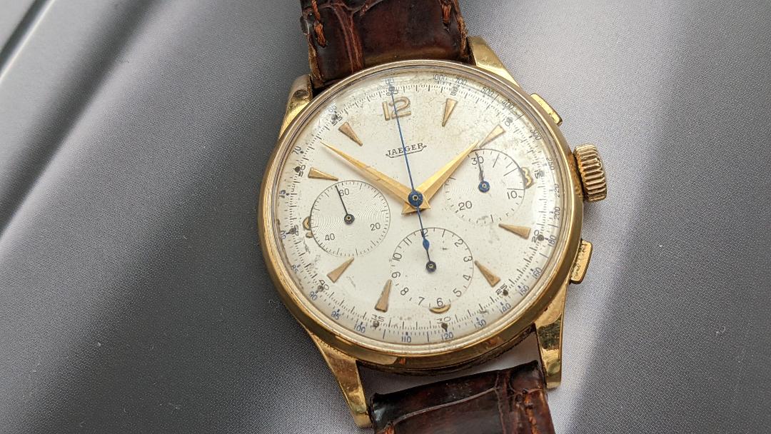 My brother's actually...a gift to him from our father in 1963. It has the Valjoux 72 movement, the case is 18k. Everything is original. The lug/spring bar arrangement is the strangest I've ever seen.