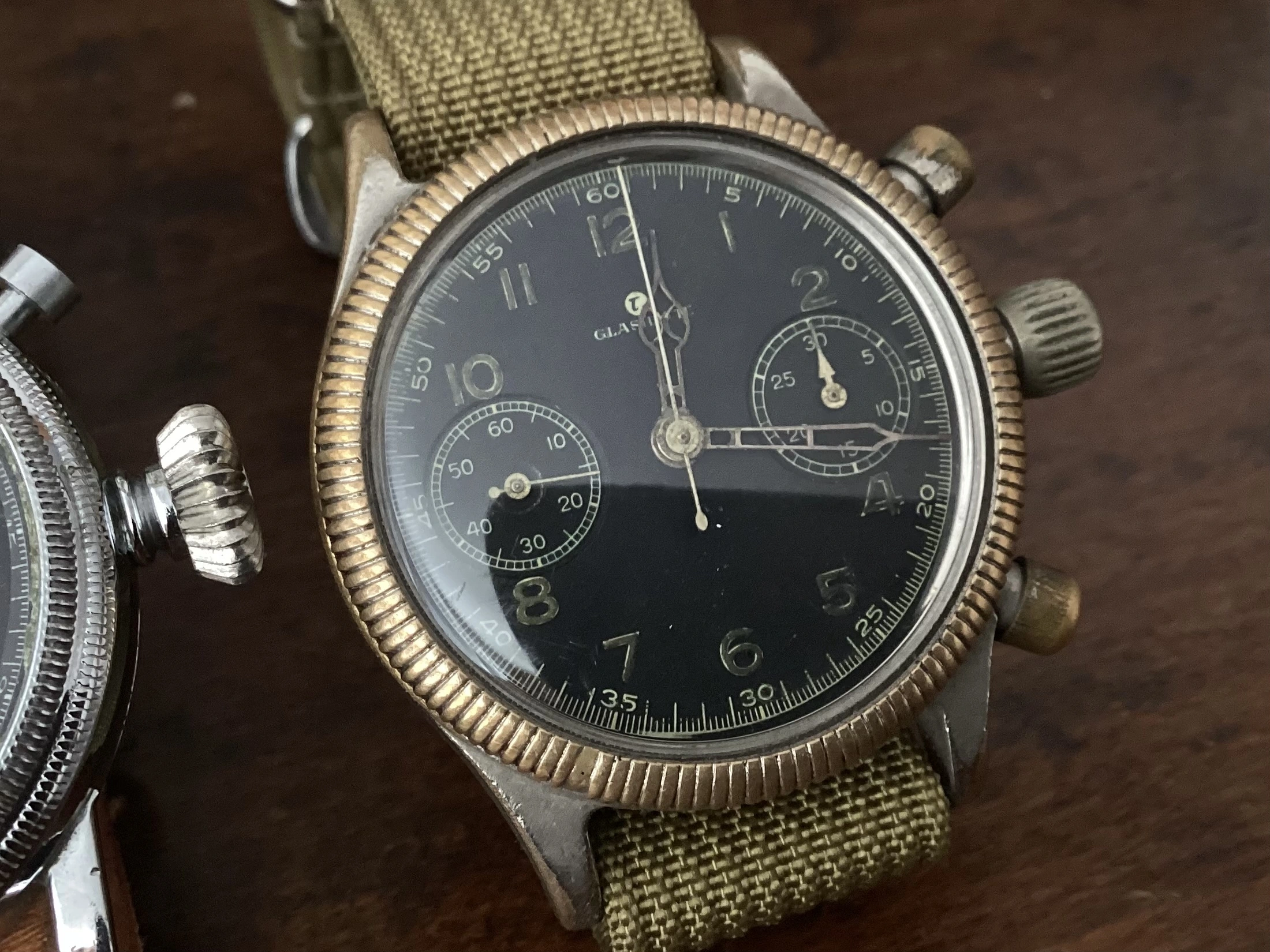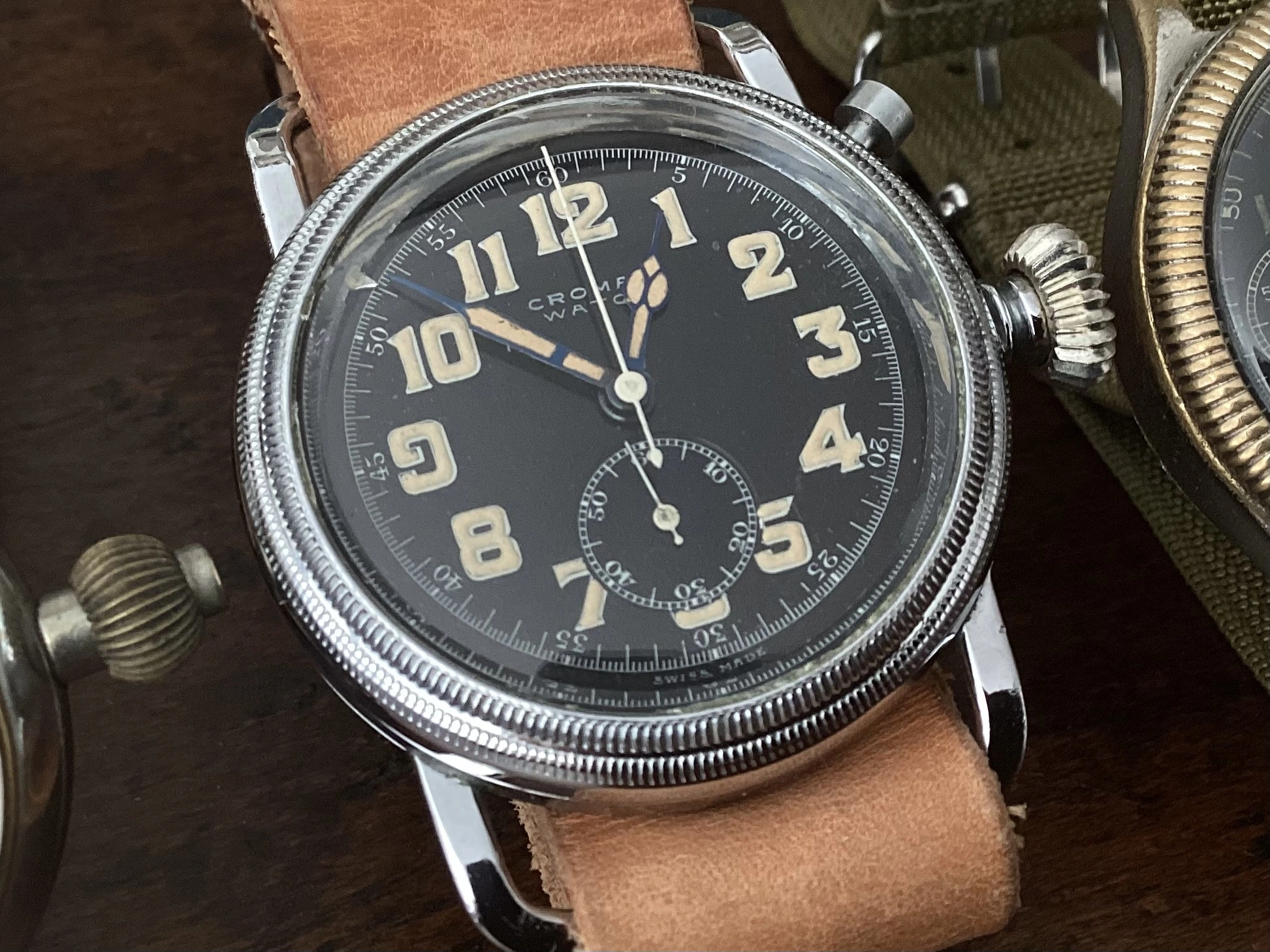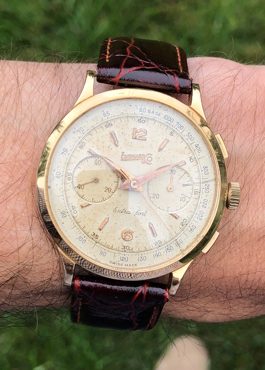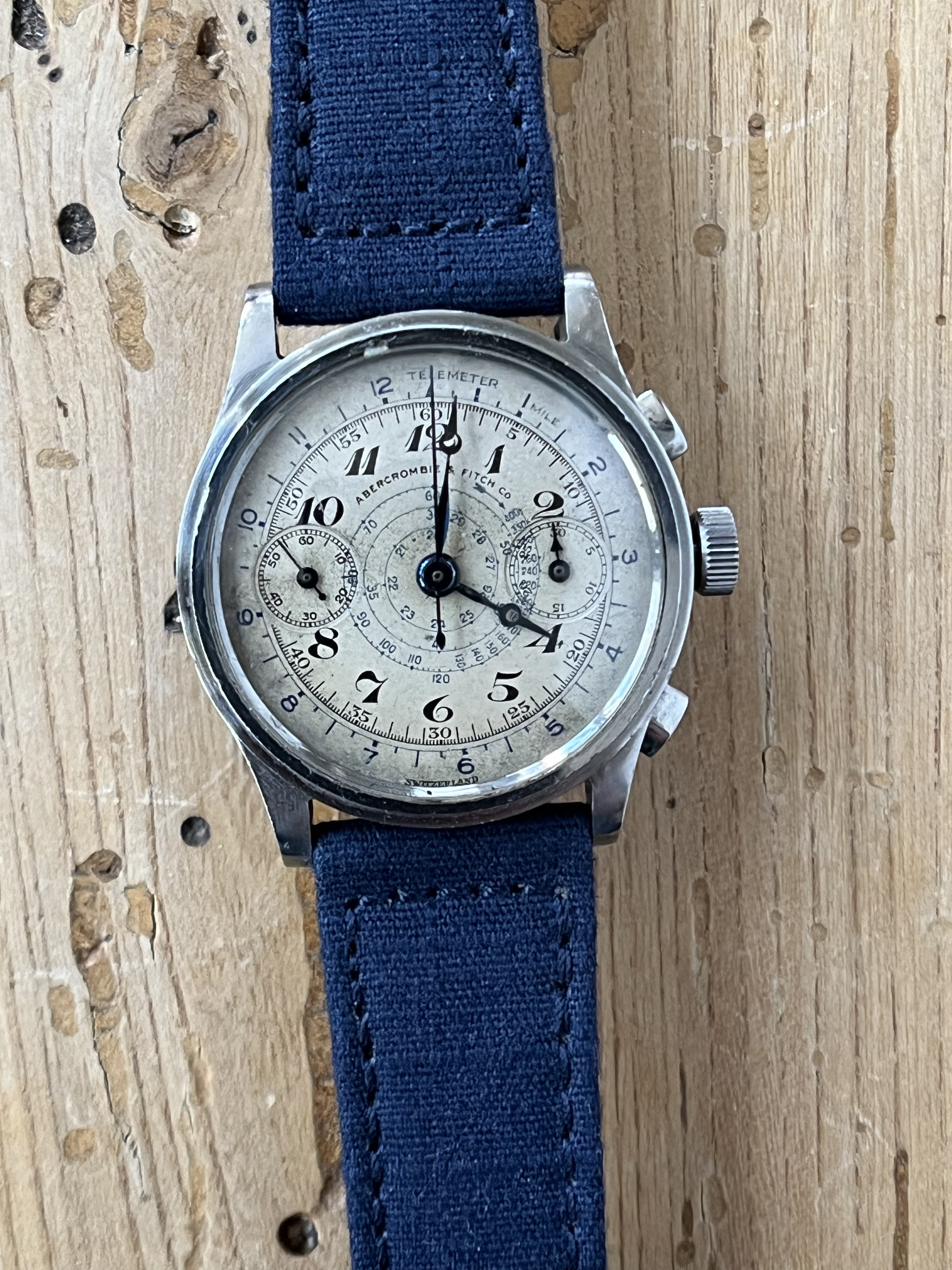 Abercrombie & Fitch 1930s chronograph made by Heuer. Landeron 13 movement. Note the asymmetrical pusher locations. Originally sold for $25 per the A&F catalog.