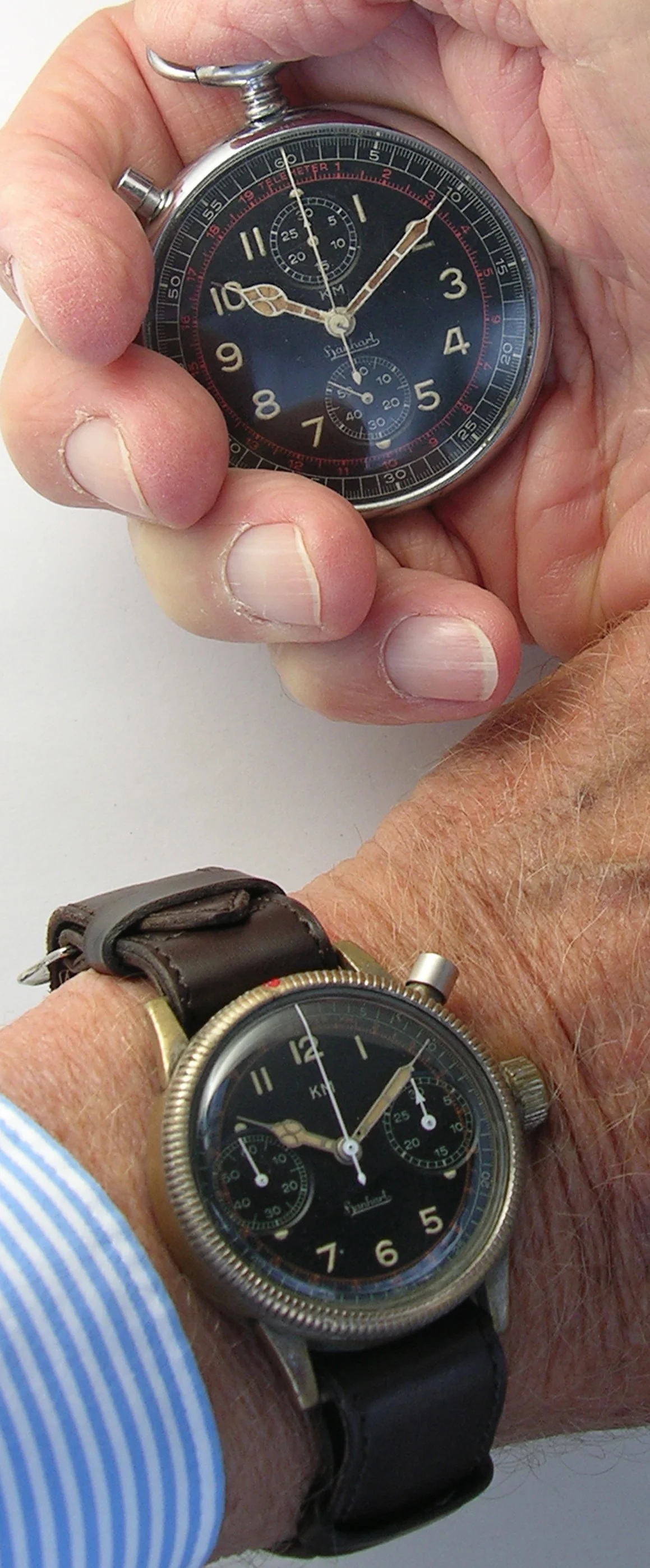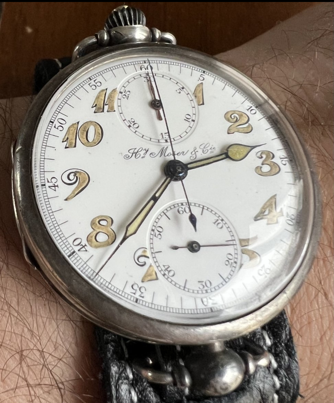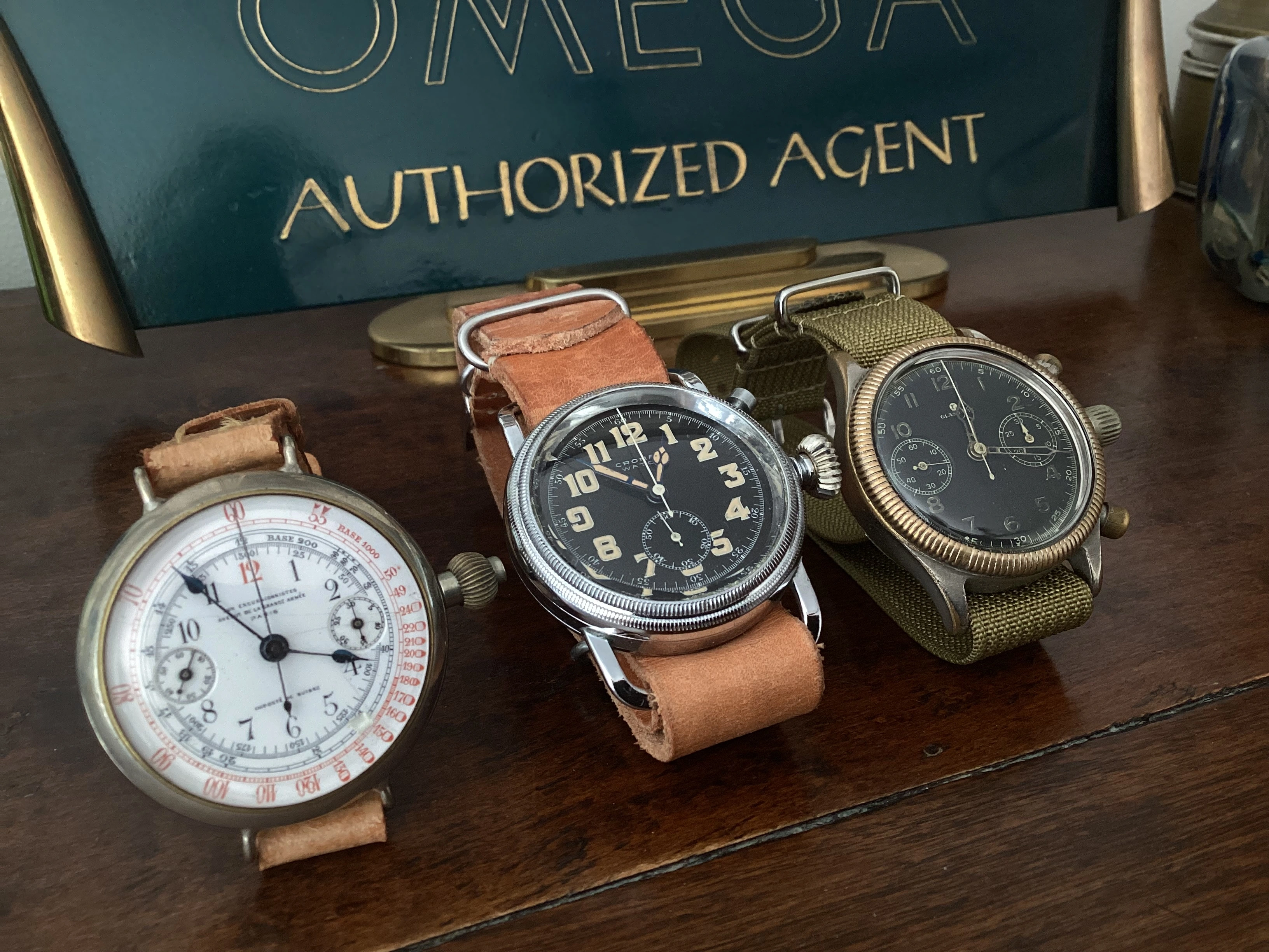 Abercrombie & Fitch 1930s chronograph made by Heuer. Landeron 13 movement. Note the asymmetrical pusher locations. Originally sold for $25 per the A&F catalog.