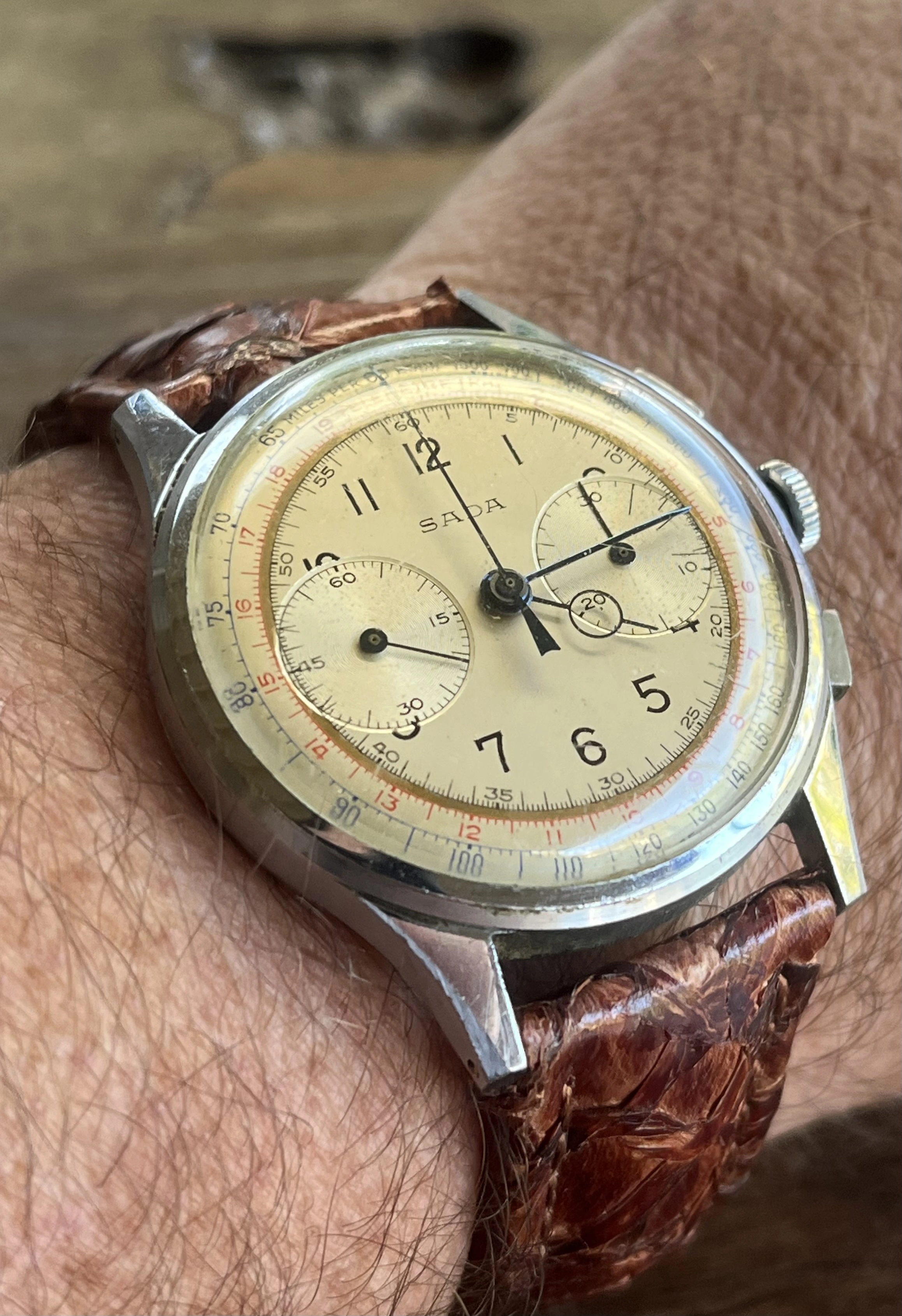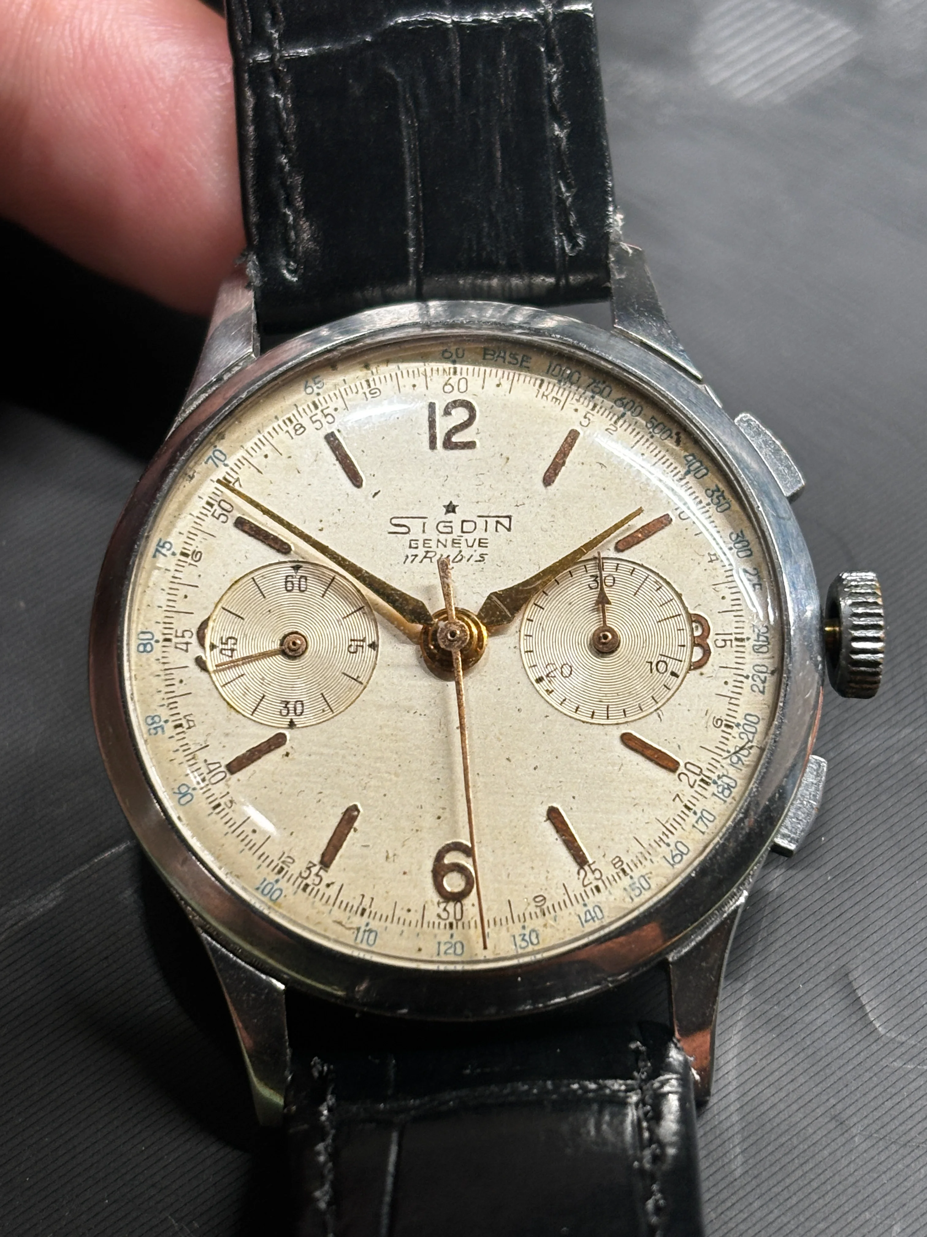 This 2 register Sigdin chronograph from the 50's with push buttons. Not sure unusual is the right word, but scarce information about this brand. appears to have a landeron movement, though still narrowing down which one. 248 is my best assessment at this time, but just as easily "222, 223...you know...whatever it takes..." Does not, at the moment, function.