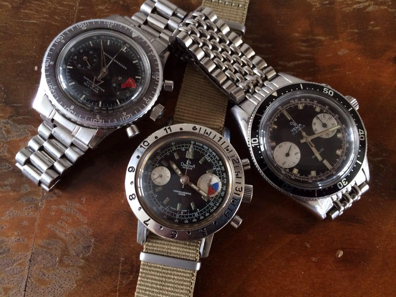 l-r: Zenith A386; an original from the first line up of auto-chronos from Zenith. Omega Speedmaster 376.0822; last evolution using Lemania - auto, day/date, 24hr - moonwatch case. Lemania SAAF; issued to the South African Air Force in the early eighties, nice slim count-down bezel and deleted chrono hour hand - powered by slower beated 5100 - the 5012. Heuer Bund Sternzeit; the classic Bund in rare form - regulated to sidereal time for positioning of artillery units. Sinn 156; this is an early one without the 24hr hand at 12 o'clock. Sinn EZM1 LE: the last generation of EZM1. Sinn EZM1 ZUZ; one of the first EZMs - issued. Tutima Commando II; again, ex-issue to ZUZ - the bezel is additional to the civilian version.