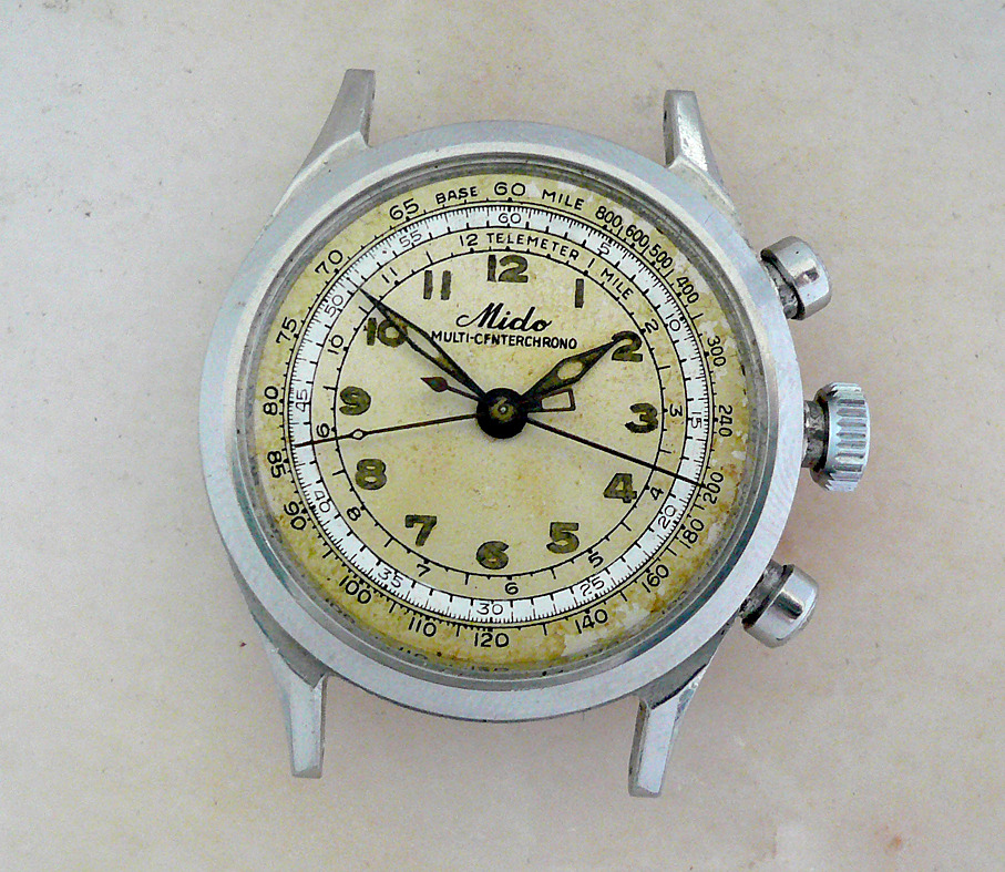 Here is an unusual chronograph concept: besides the chronograph second hand also the minute counter hand is from the center - hence the name of the watch Mido "Multicenter chronograph"