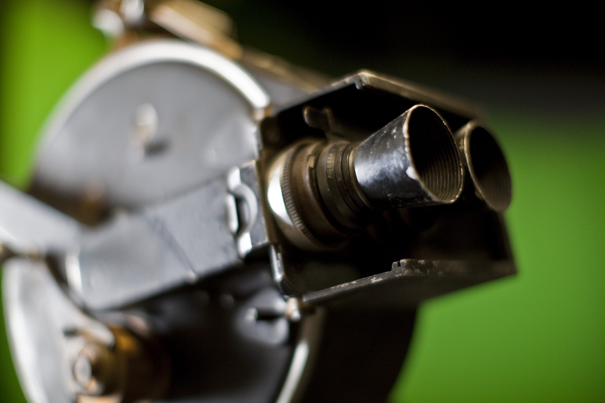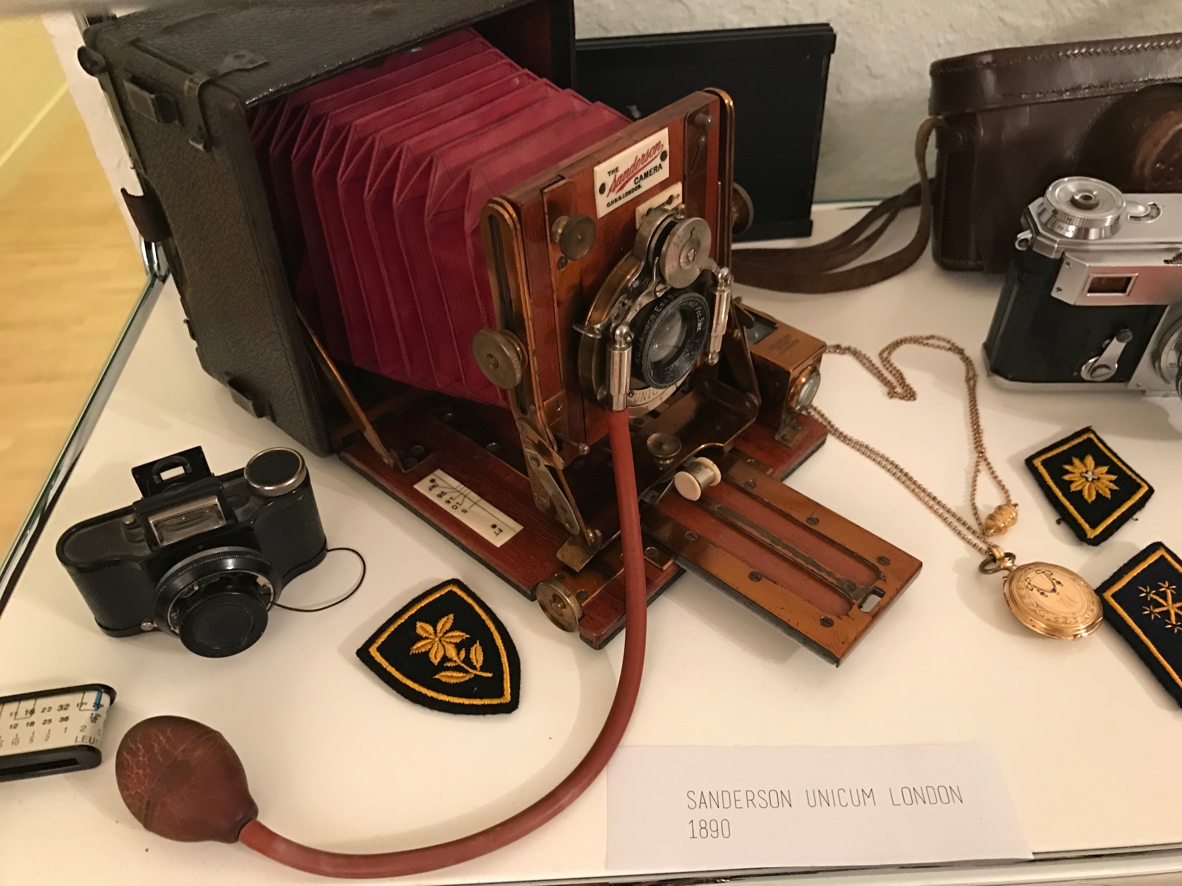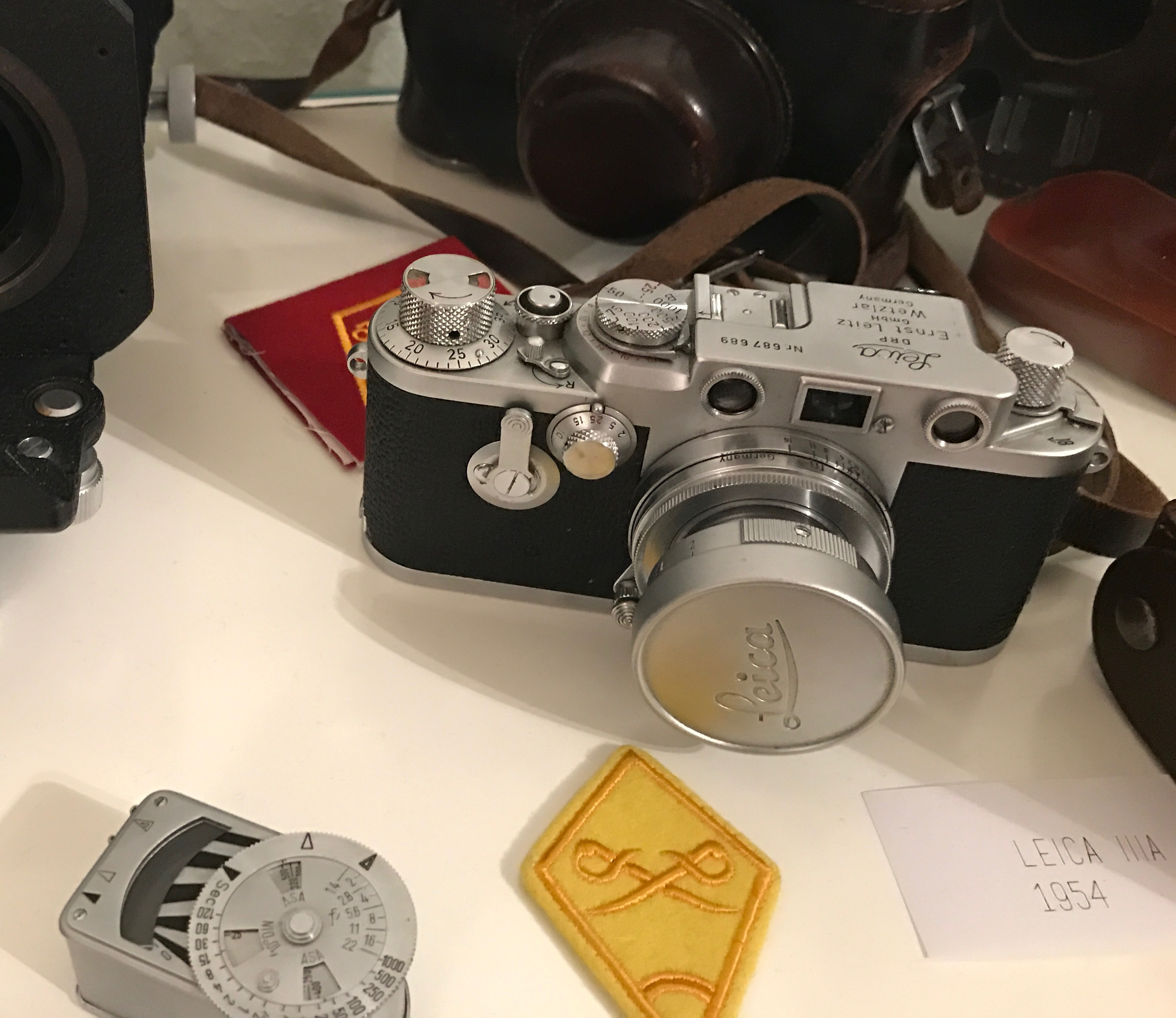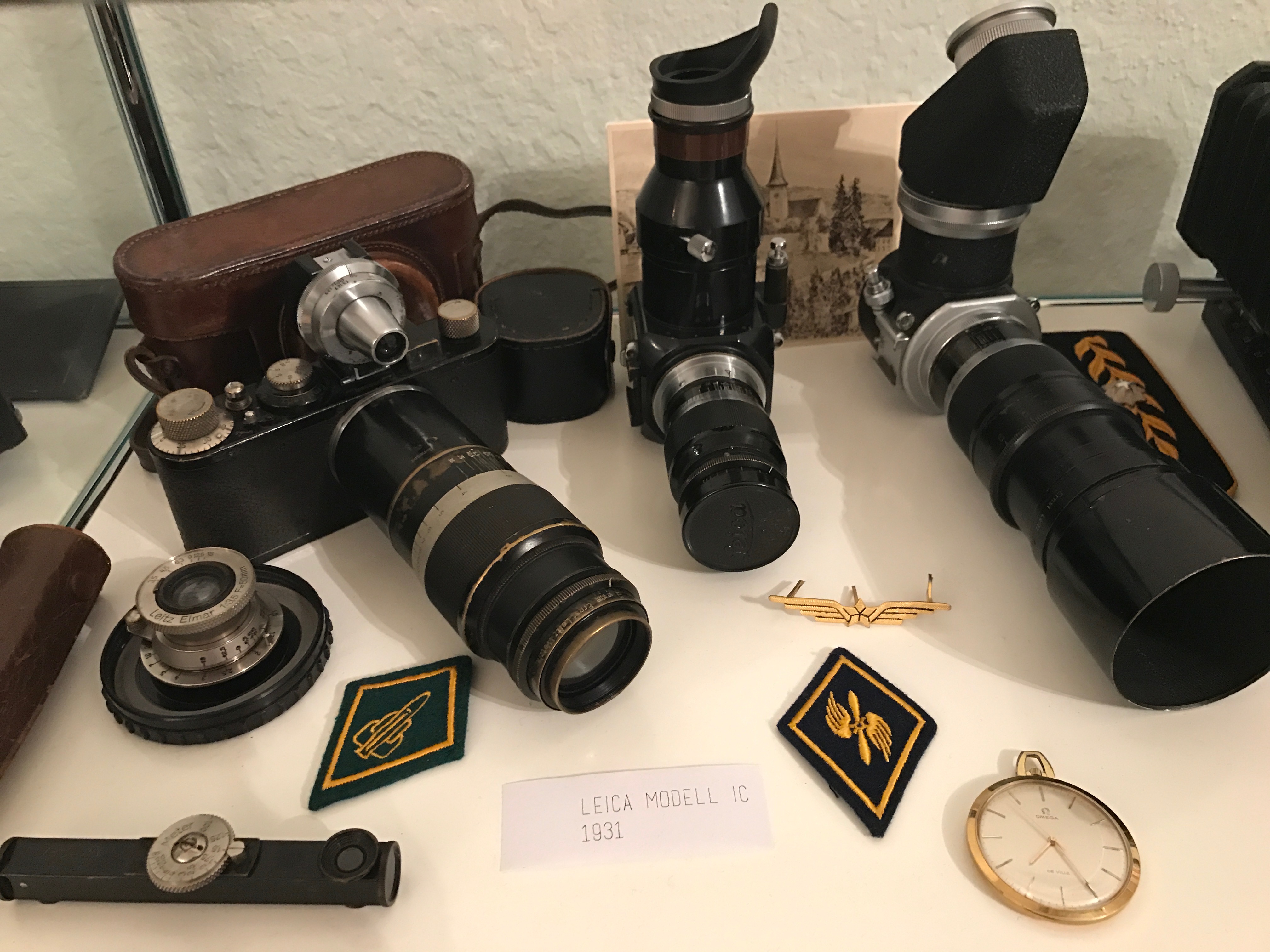 A Leica Model I C from around the early 30ies and 5 different fitting objectives and on the left side on the front, a thingy to measure distances, also from that era. On the right of the camera, there are extension allowing to look through the lens. Like an early attempt to get a SLR.