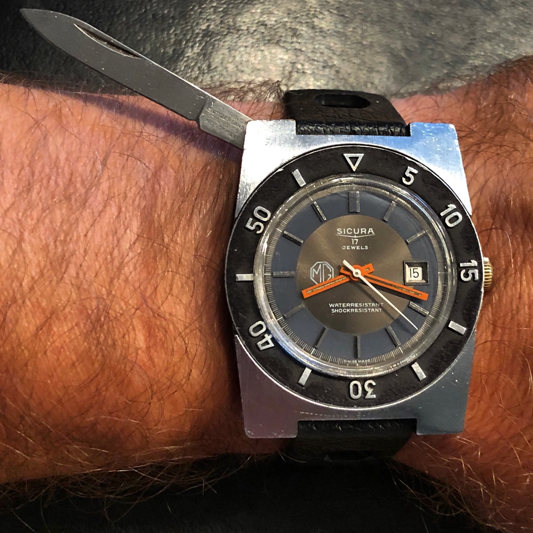 ·This is a new complication to me, from the description: "A gentleman's 1970's Sicura calendar diving watch with concealed pen knife blade contained in a steel case, 45mm". Anyone seen any other examples of watches with concealed blades?
