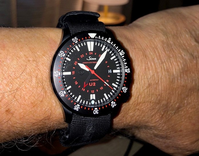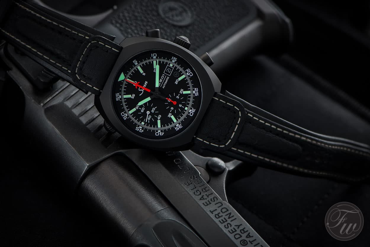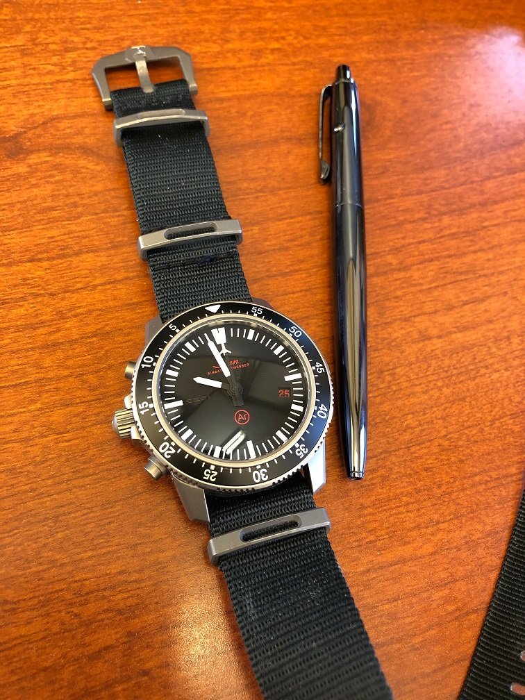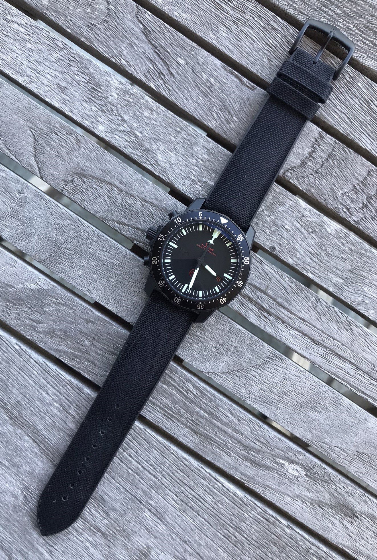 I wanted to replace the original cognac-coloured leather strap on the EZM1.1S with black to match the PVD case -- see post on previous page. The OEM leather strap is excellent quality and cognac leather against a black case looks great but it does limit what colours you can wear compared with more versatile black-on-black. Finally decided on the Hirsch Arne sailcloth performance strap with black buckle and am very happy with the result. Here it is....
