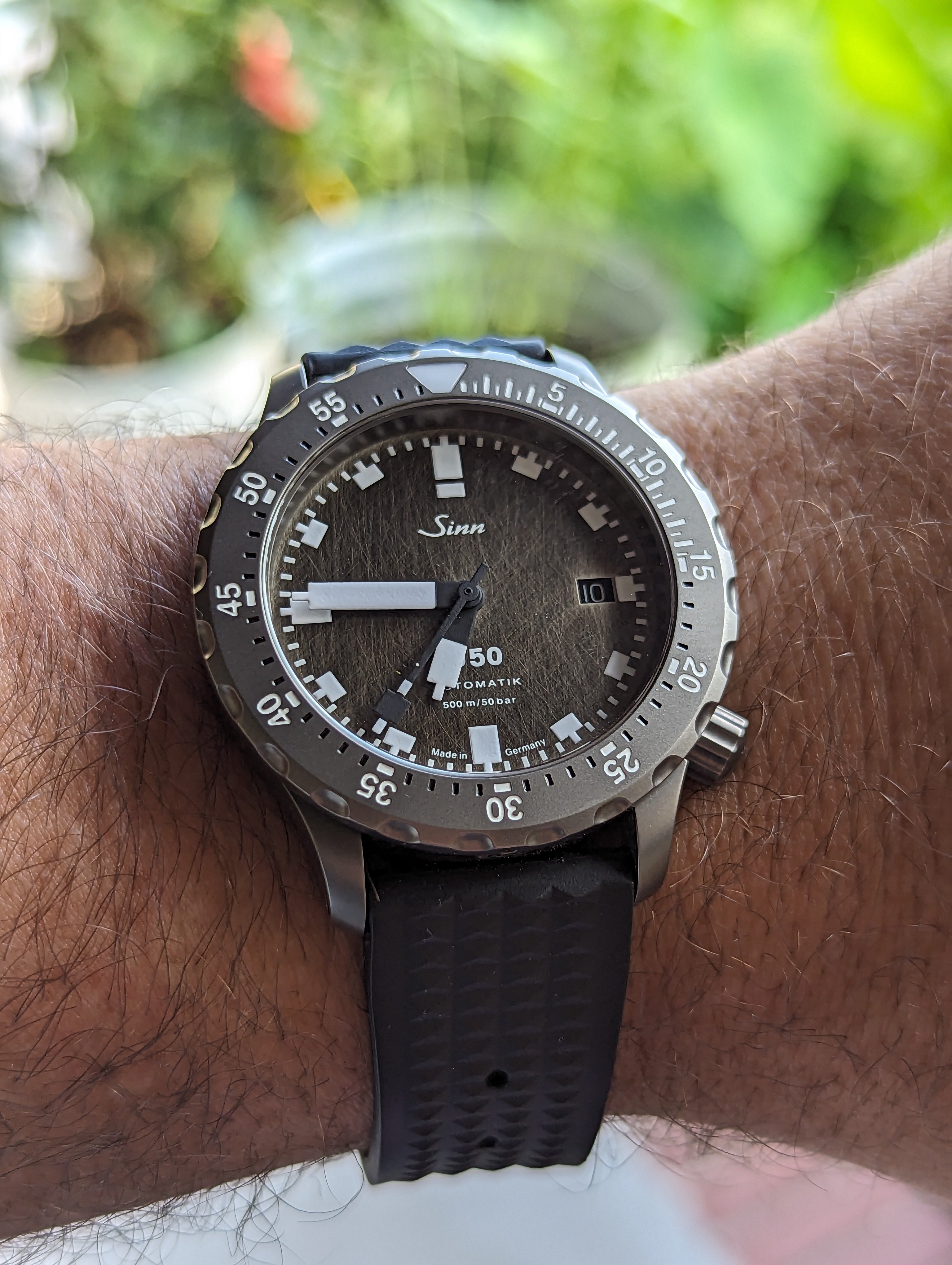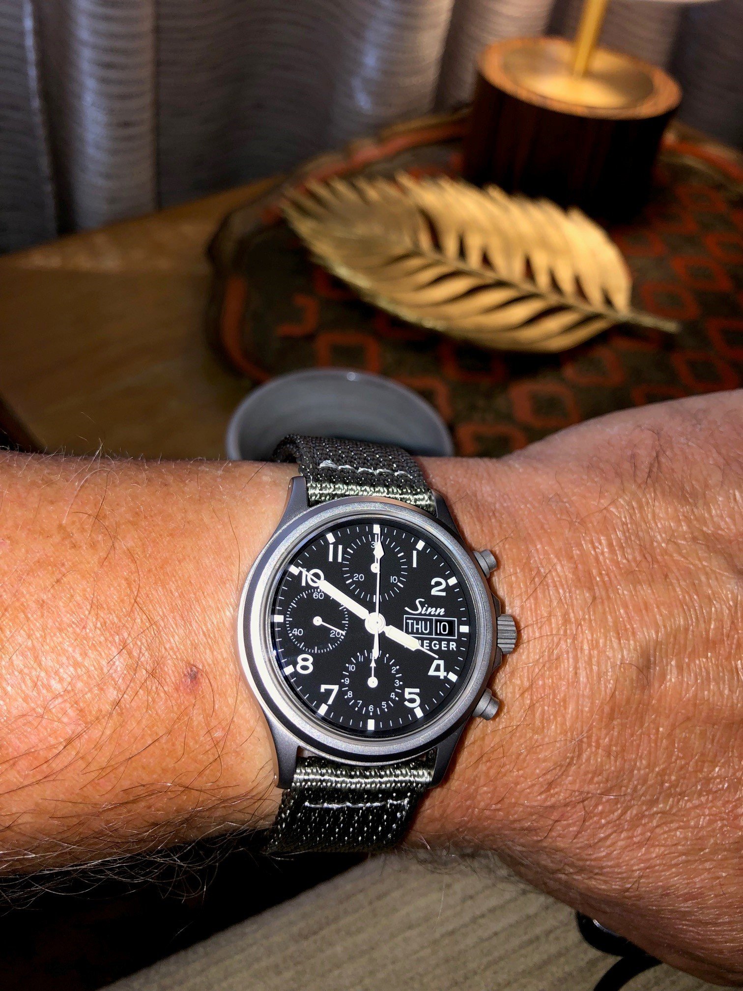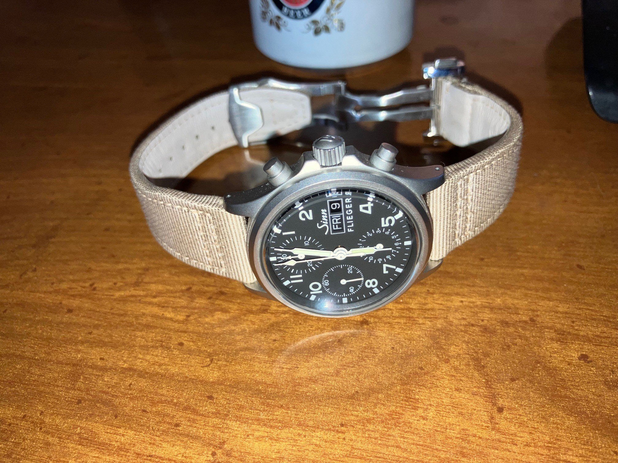 I wanted to replace the original cognac-coloured leather strap on the EZM1.1S with black to match the PVD case -- see post on previous page. The OEM leather strap is excellent quality and cognac leather against a black case looks great but it does limit what colours you can wear compared with more versatile black-on-black. Finally decided on the Hirsch Arne sailcloth performance strap with black buckle and am very happy with the result. Here it is....