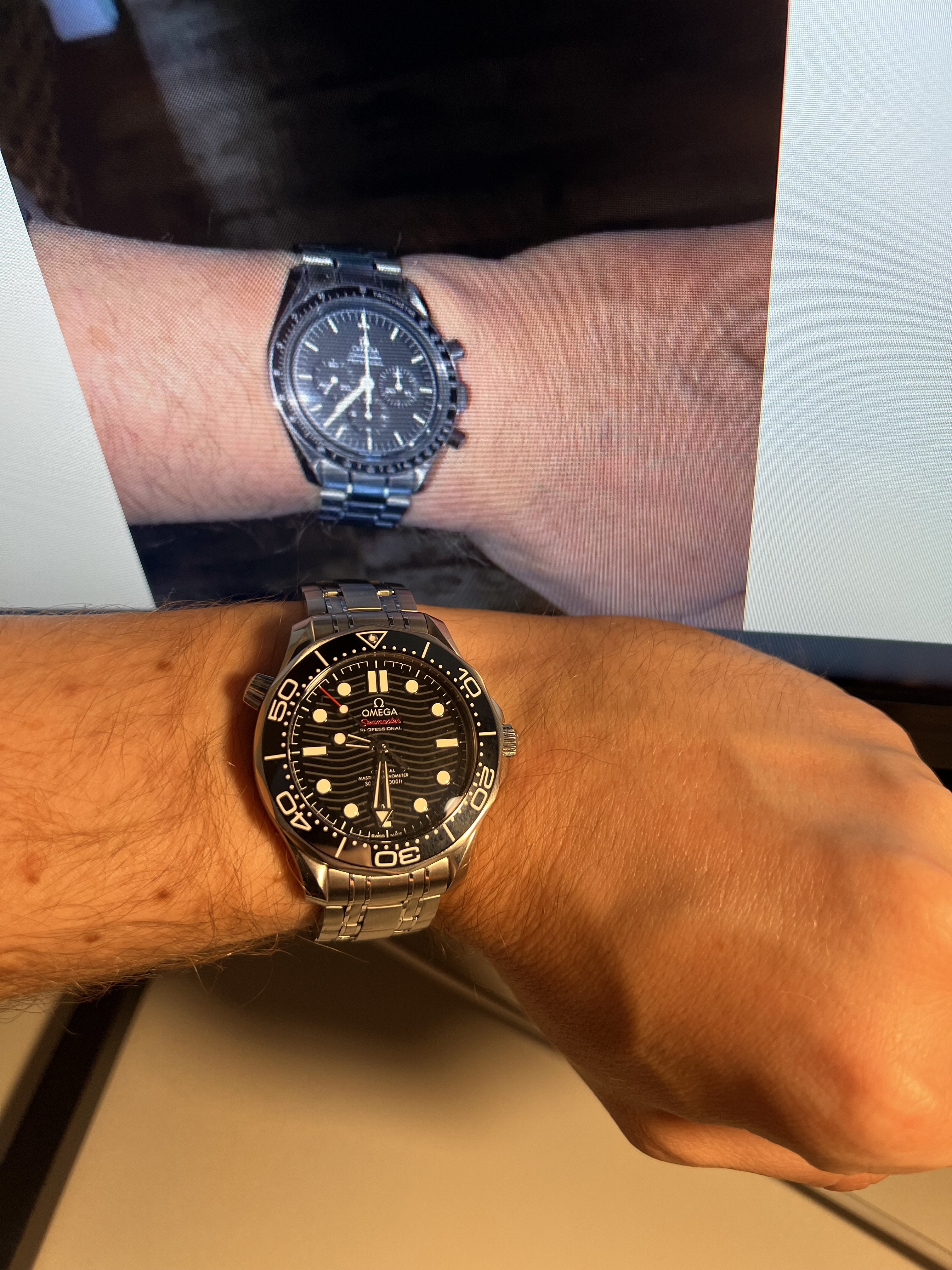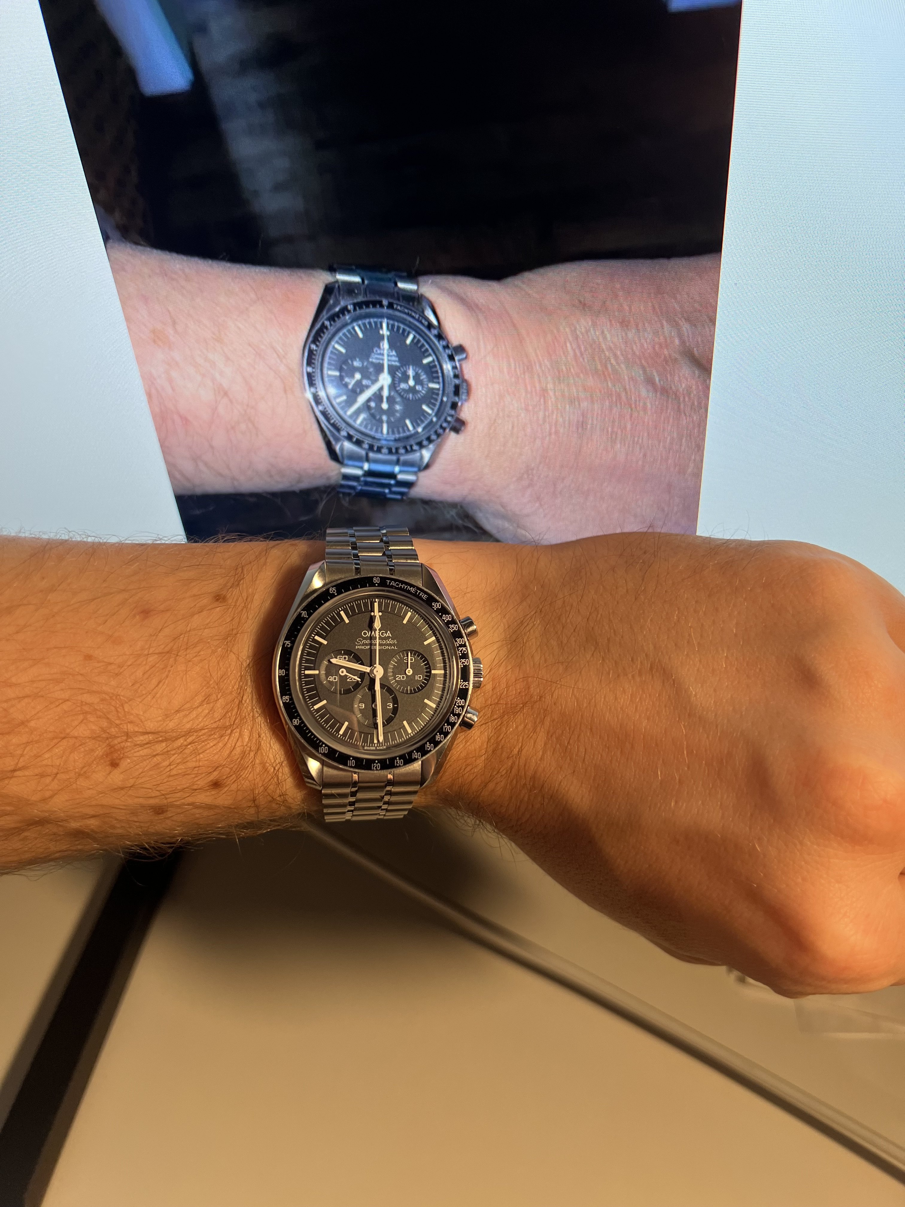 Anyone here that own both an UX and the newest 42mm iteration of the smp and/or a speedmaster? I am curious of how the UX wears compared to one of those, because I really want an UX, but cannot try one on due to lack of a physical store, so I have to order one from abroad. And I am afraid that my 165mm (flat wrist, about 55m across) is a bit small for the 44mm case… I feel that the smp is comfortable, but I am afraid that the UX wears a lot bigger.