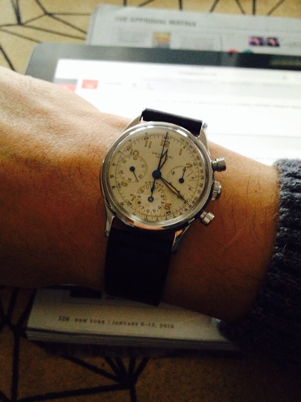 路路Mrs Nataf's Other SonUG had an impressive portfolio of firms that it supplied chronograph movements to. These included manufactures - Vacheron, Girrard Perregaux, Zenith - as well as retailers - Hermes, Jaeger. This is one of the latter.