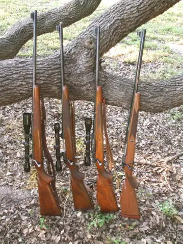 Here’s the Winchester Model 70 tribe here, pre-64 and otherwise. Left to right: 1937 in .220 Swift, 1947 in .257 Roberts (took a deer with it just this morning - about 2000 yards from Oklahoma and the Red River in northern Hardeman county, Texas) and 1953 .30-06 (my very favorite hunting rifle), with a late 1980s Model 70 Super Express in .375 H&H Magnum.