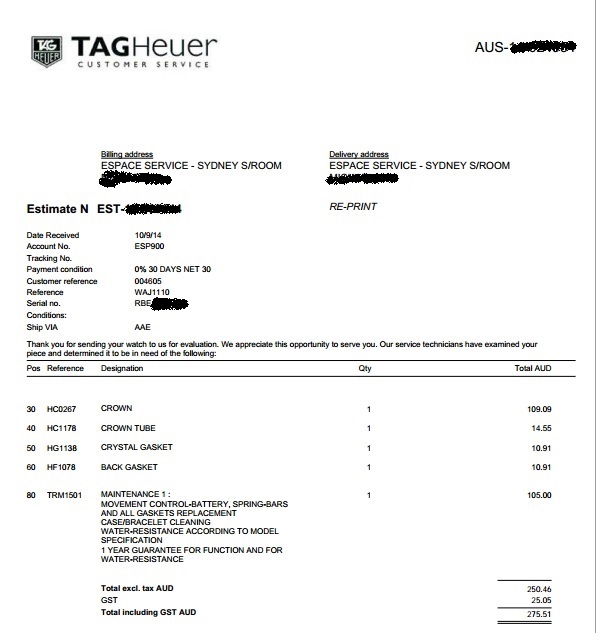 Just received back from TAG service centre in Sydney where they replaced a stripped crown and stem and also did a service with all gaskets replaced and pressure testing done as seen in the invoice below.