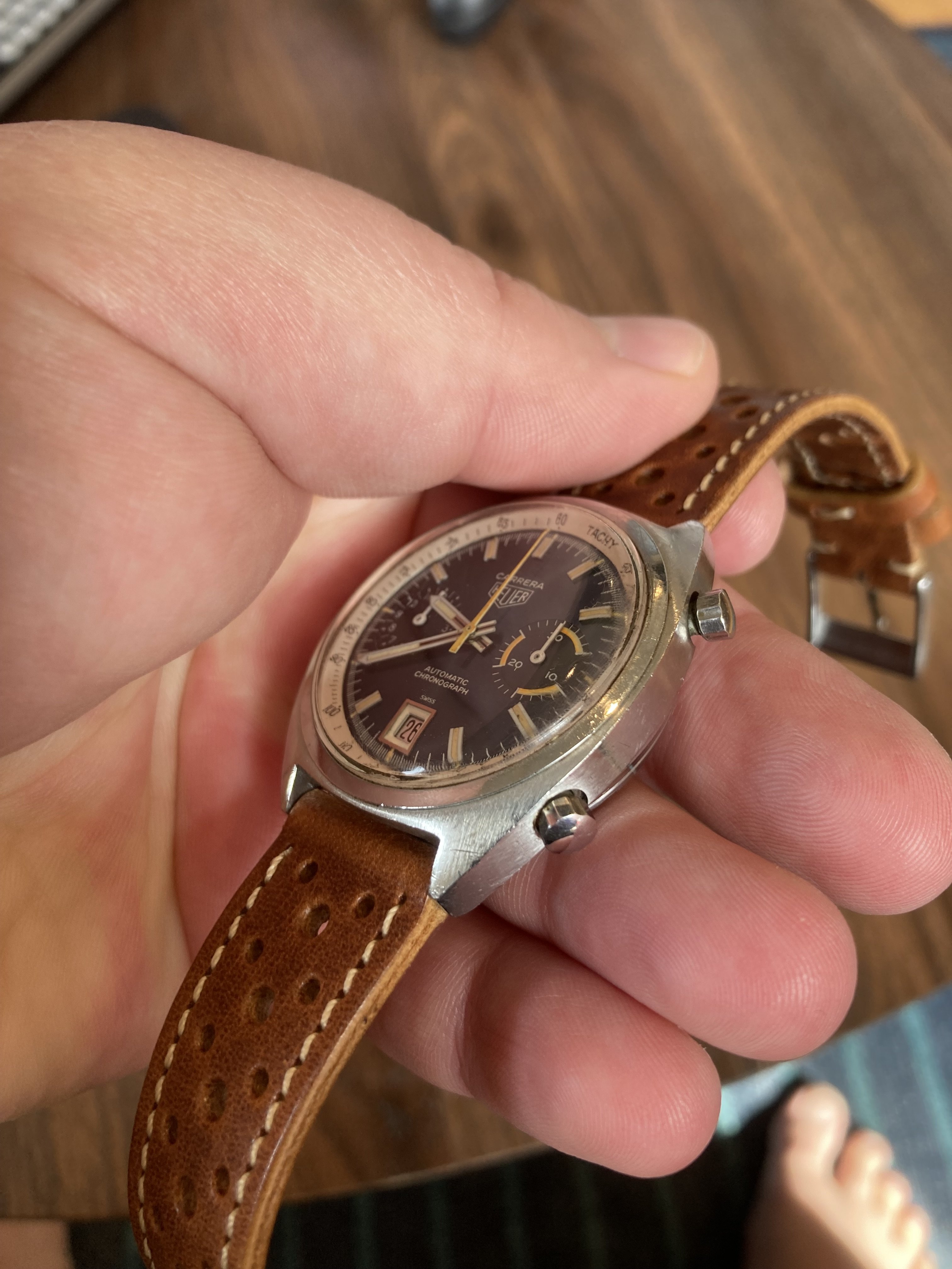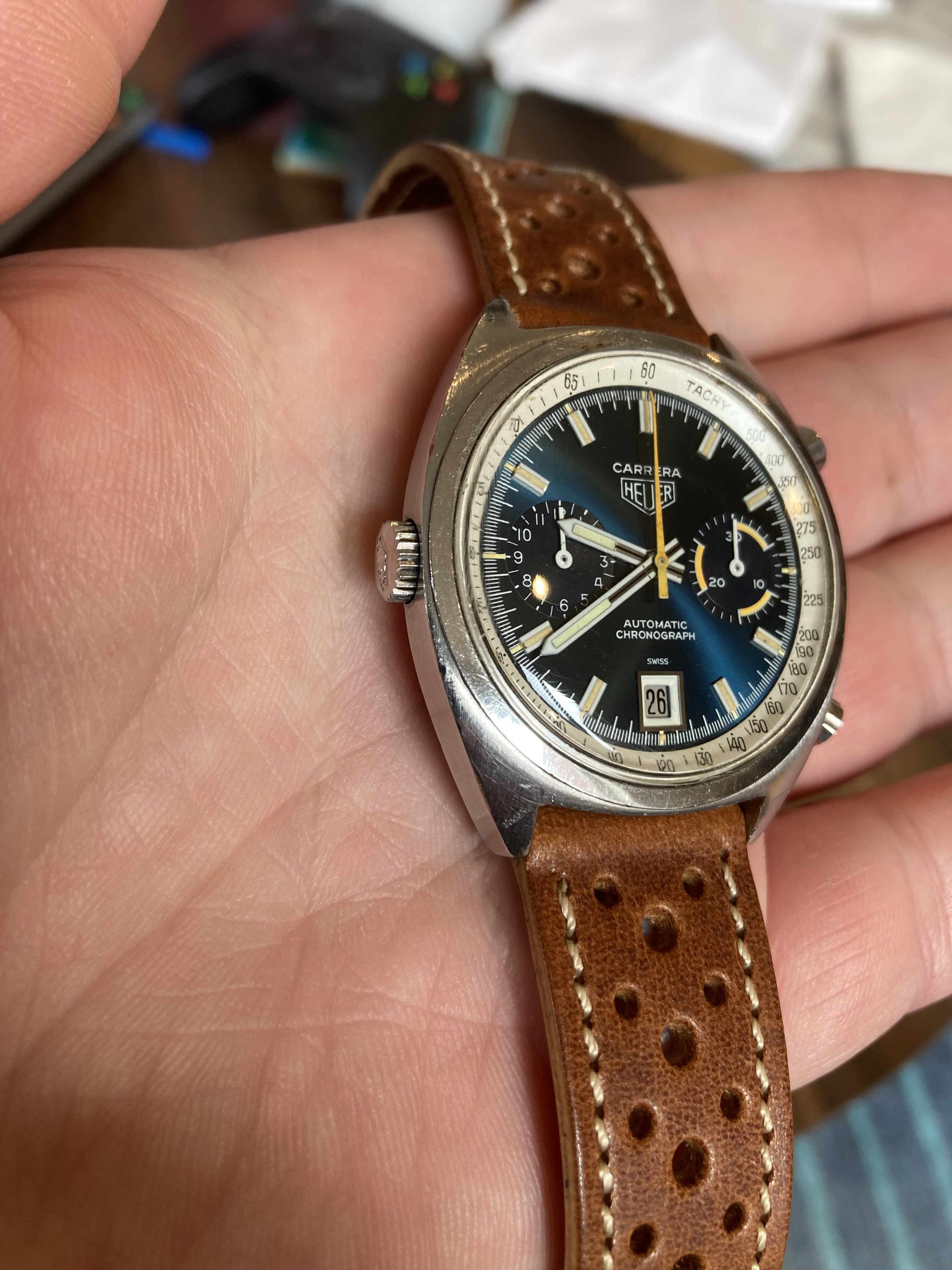 路Offering for sale my Heuer Carrera 1153BN Yachting. The watch is in good wearable condition - it has some marks on the case that I have photographed in some very harsh light, but that don't stand out as much on the wrist. It's definitely not a safe queen! The fully intact lume has aged to a very pleasant yellow on the hour marker inserts and hands.