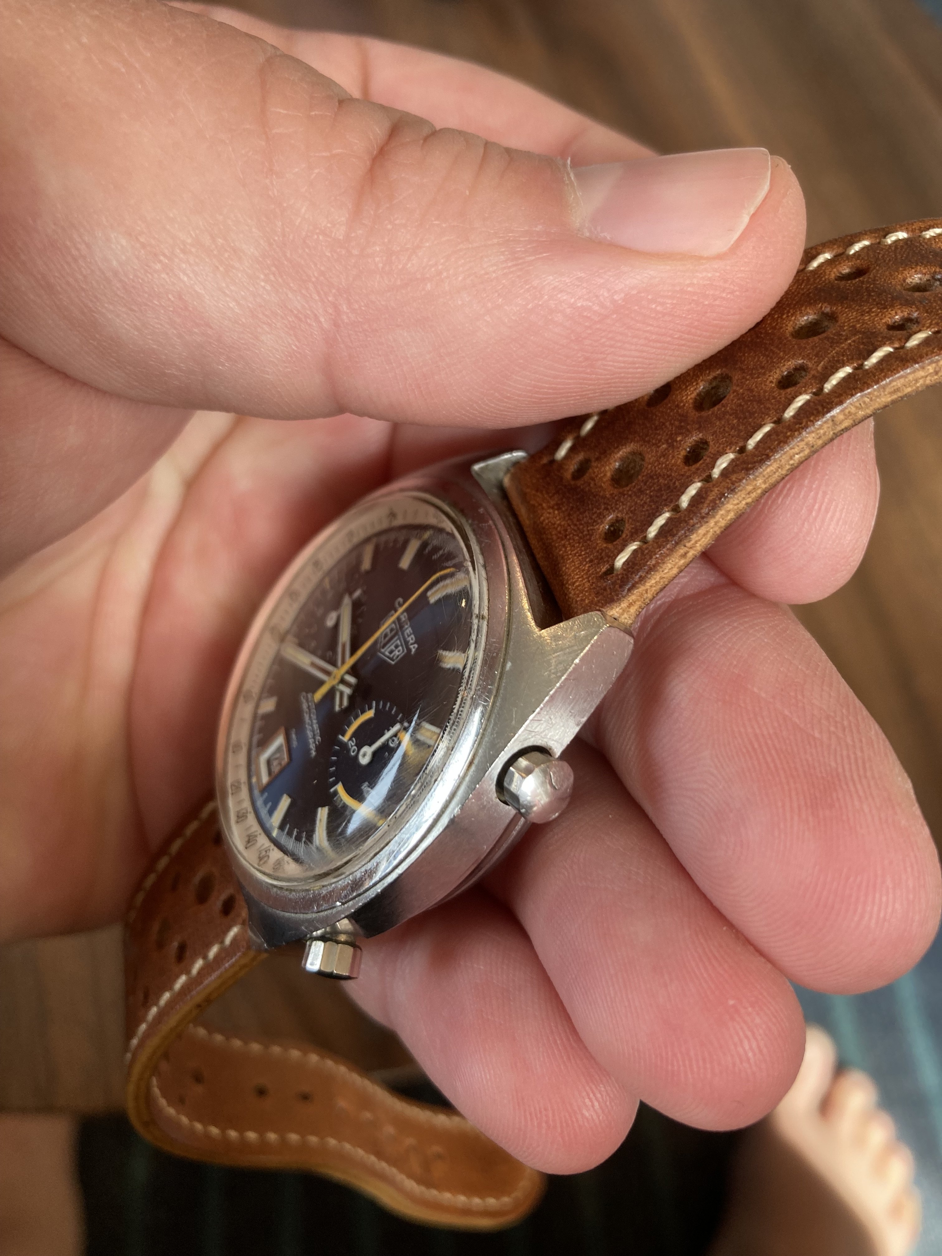 The watch is all original with its proper fluted pushers and signed crown. Model and serial numbers are barely visible between the lugs but are quite worn out as is fairly common with these Carreras due to the placement right where a bracelet end link would rub against it.