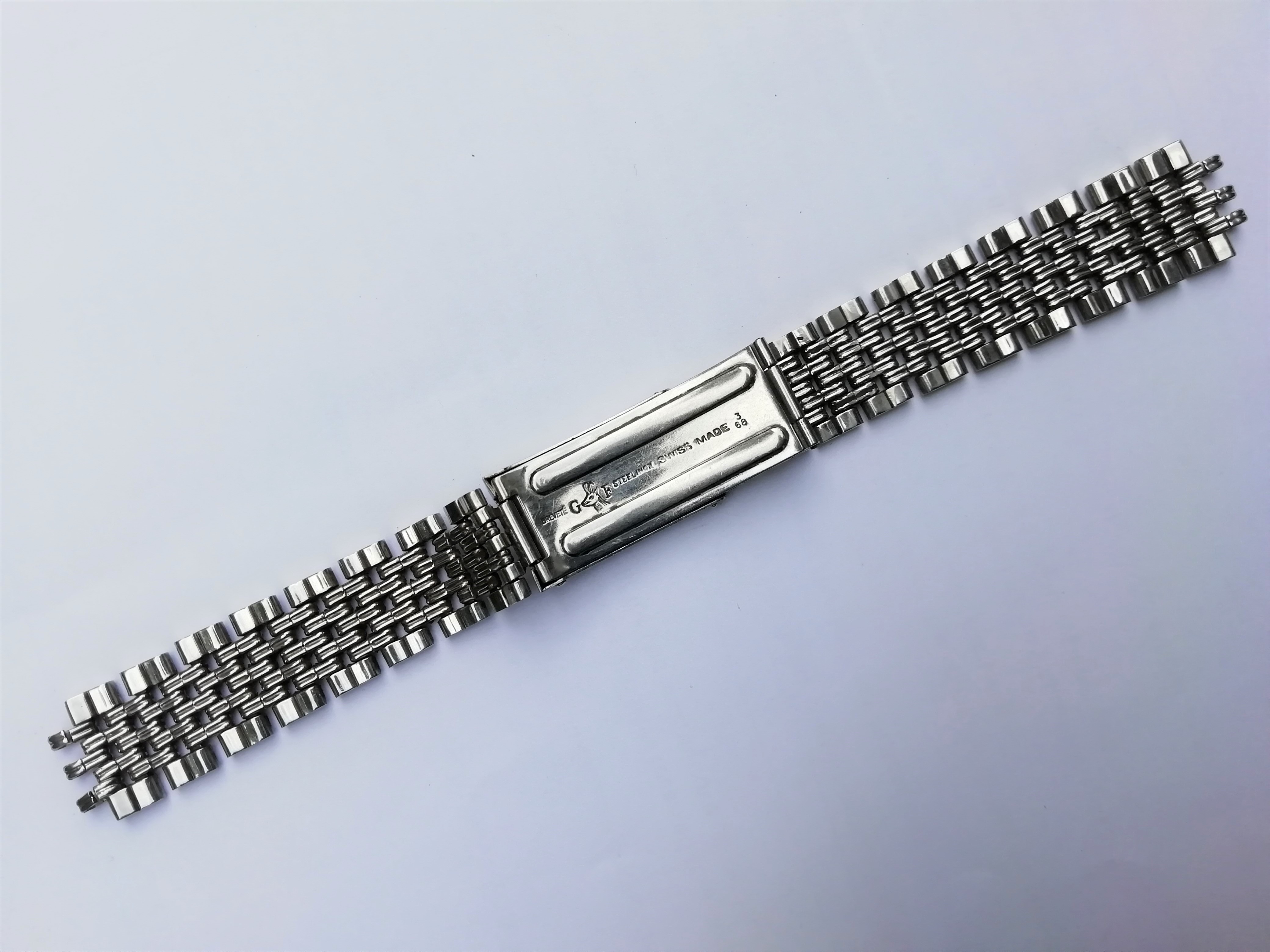 It is full length (18 links) with average stretch, as you can see in the photos; total length is 18cm. It is dated 3/68 and has spent it’s life on a one-owner Camaro so the end-links are in good condition and the bracelet is untampered with overall.