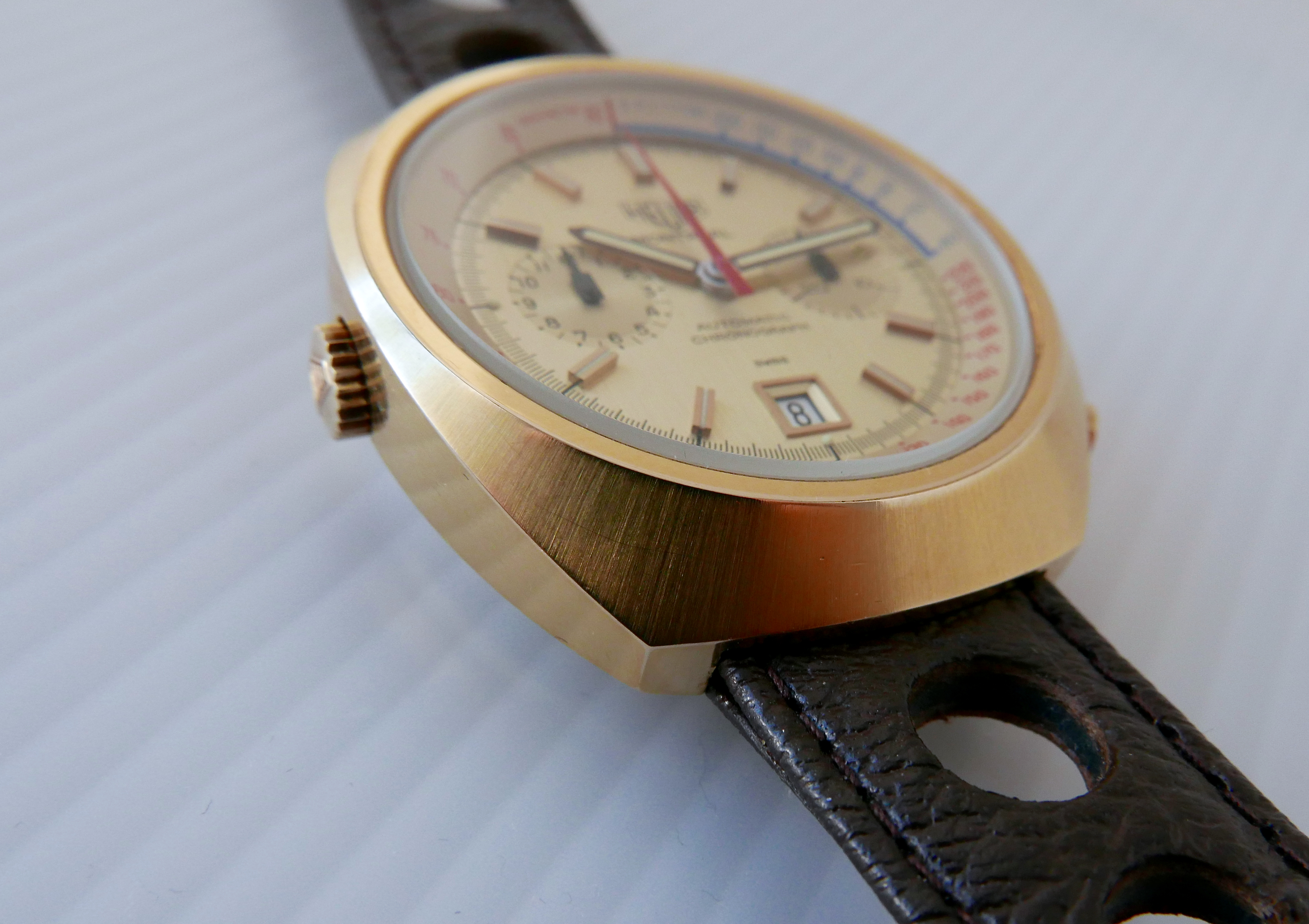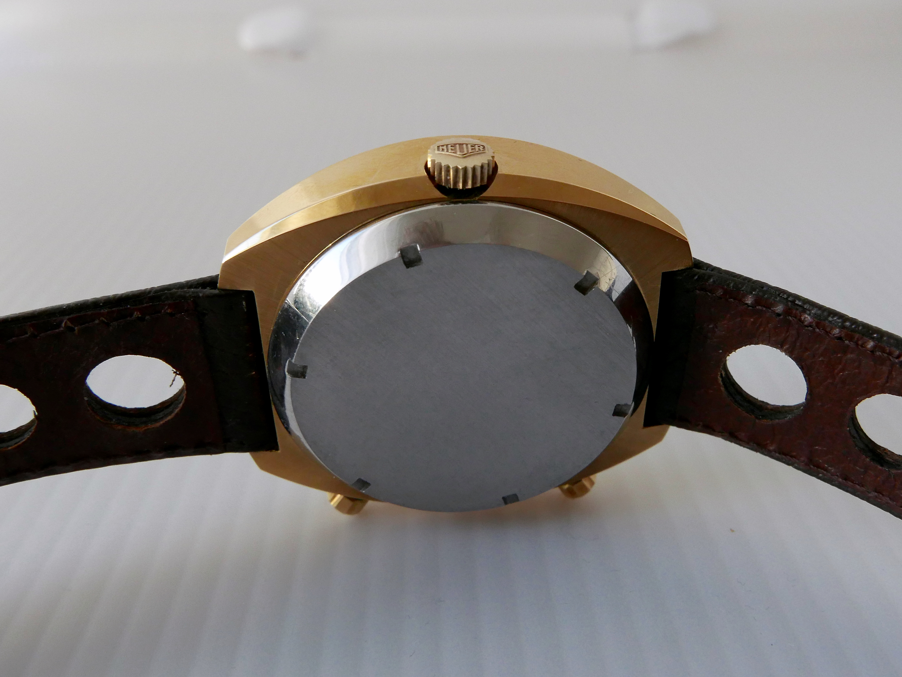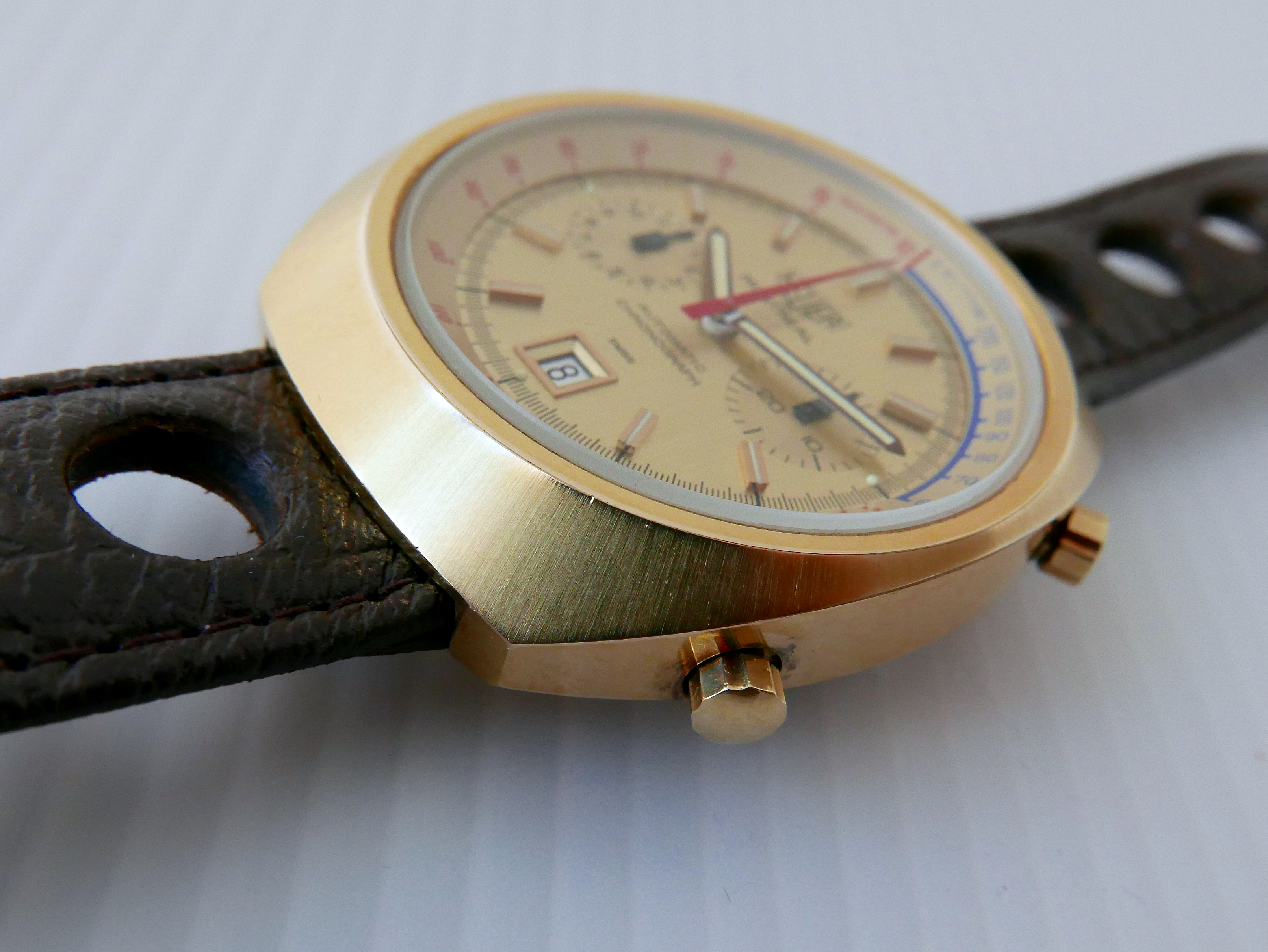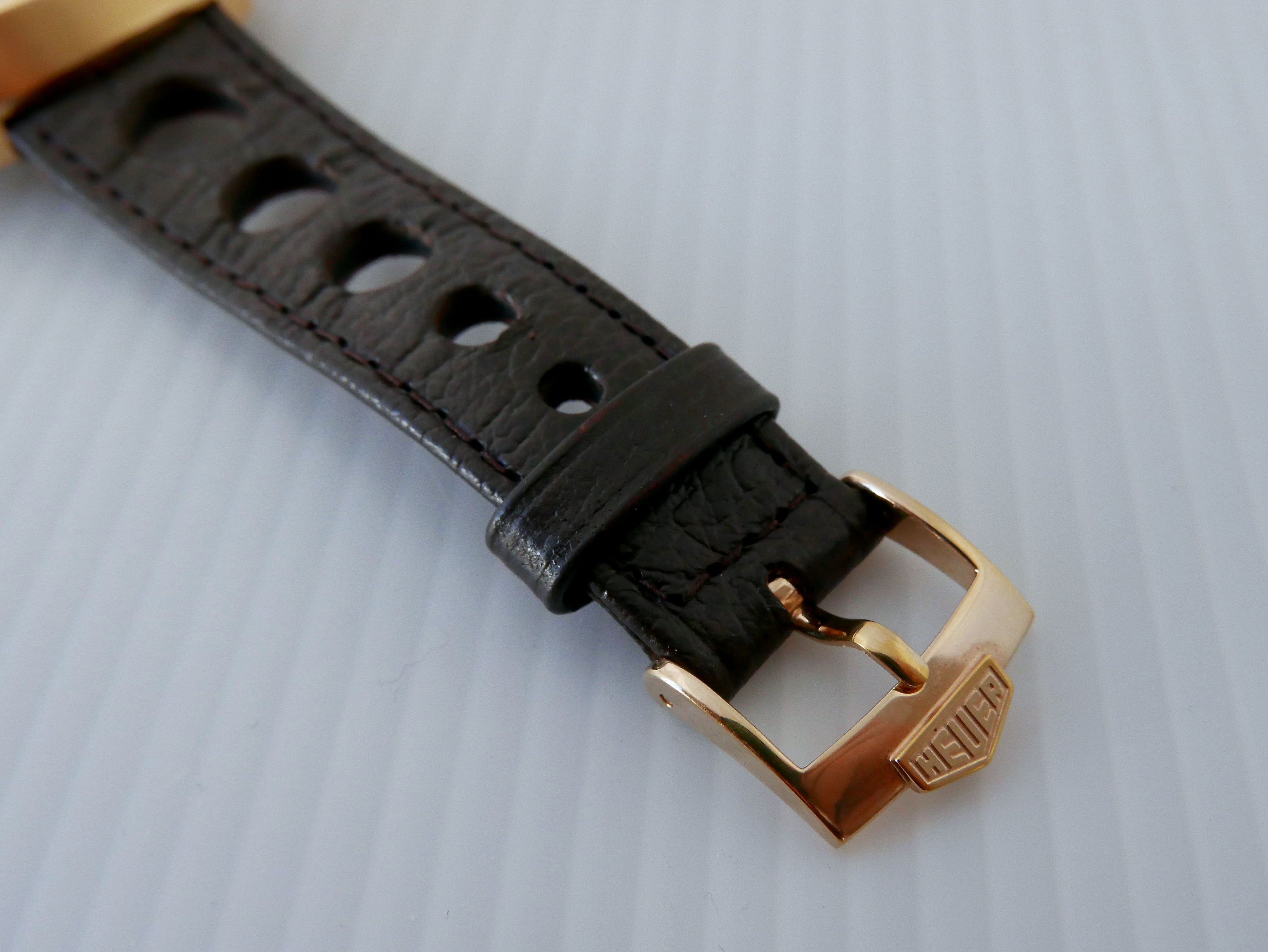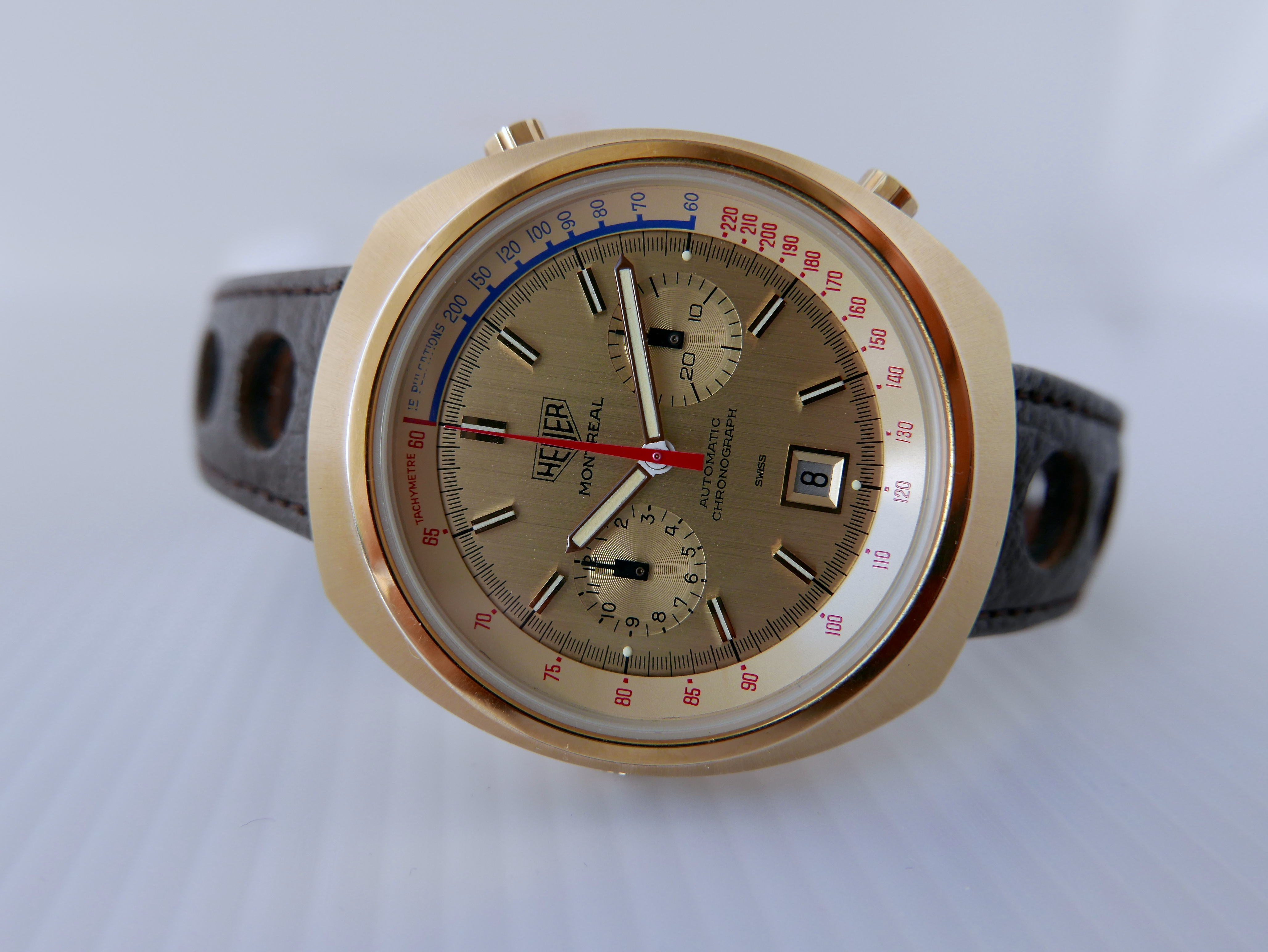 ยทA near mint Heuer Montreal 110.505CH. Condition is very good. The gold plated case is in great condition, with the original gold plating and brushing. The crystal, dial, hands, crown and pushers are in mint condition. Only thing is some wear to the inner bezel. No service history but runs strong and everything works as it should. Comes on a brown vintage corfam strap and a gold Heuer buckle (a new re-production version from Tag Heuer). A NOS gold plated NSA bracelet of the correct Montreal model is included, buckle is however not marked Heuer.