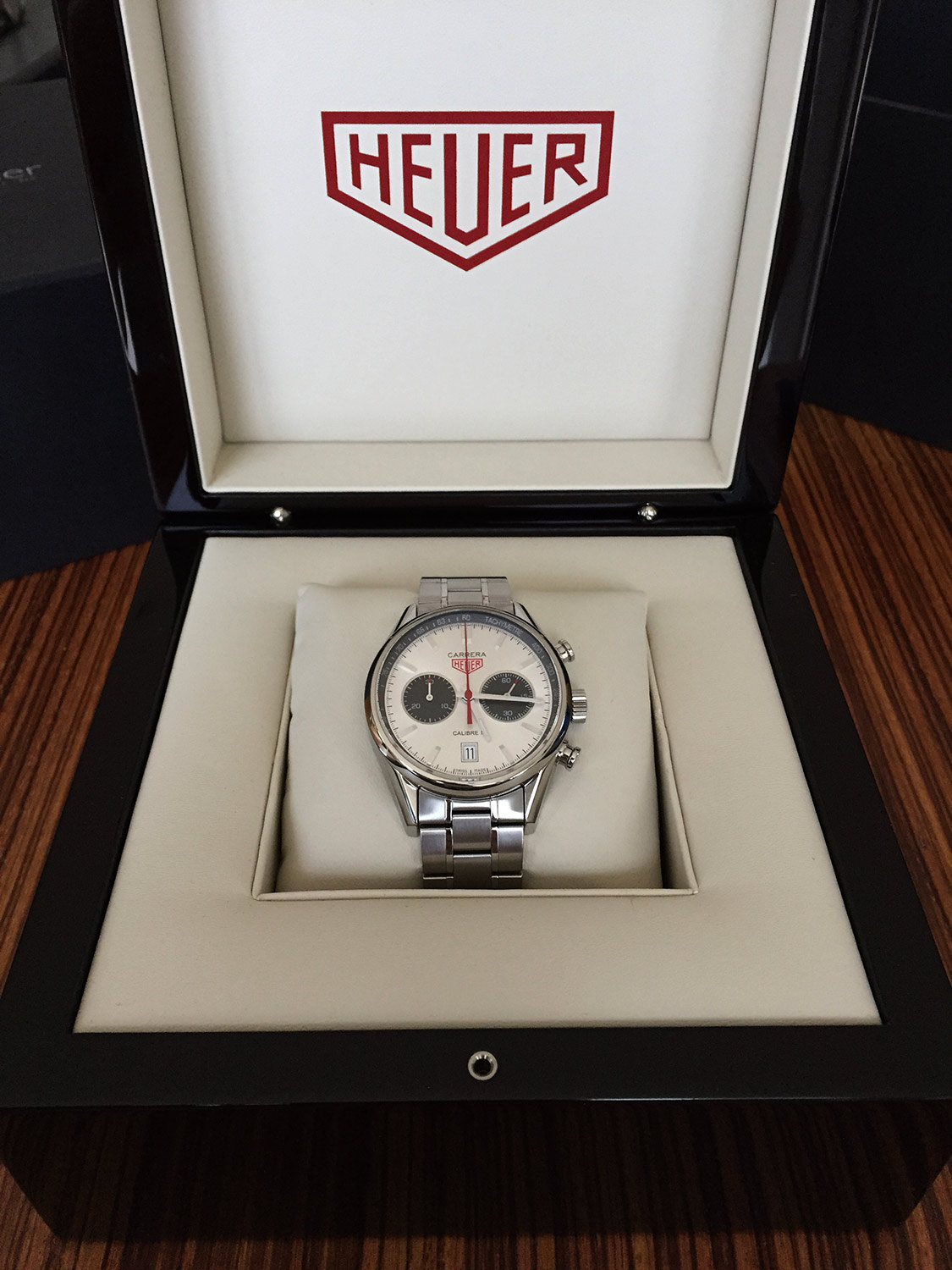 ·SOLD!!! is an extremely hard to find Jack Heuer 80th Carrera Limited Edition watch, Model CV2119.BA0722. This watch is in excellent, near mint condition. I would rate this at 95-97% condition. This comes on the original OEM bracelet, but I also have the factory leather strap and deployment available as shown in the pics for purchase at additional cost. There are a few very minor hairlines that could easily be removed with a cape cod cloth and a tiny, minor scuff on the side of the lug above the top chrono pusher. Please look at all of the pictures closely as I tried to show the watch with as much detail as possible. The silver sunburst dial looks stunning in the sunlight. This particular model was limited to 3,000 pieces and each watch has Jack Heuer's signature on the back with the Heuer coat of Arms. Gorgeous watch, but its springtime and I'm refocusing my collection.