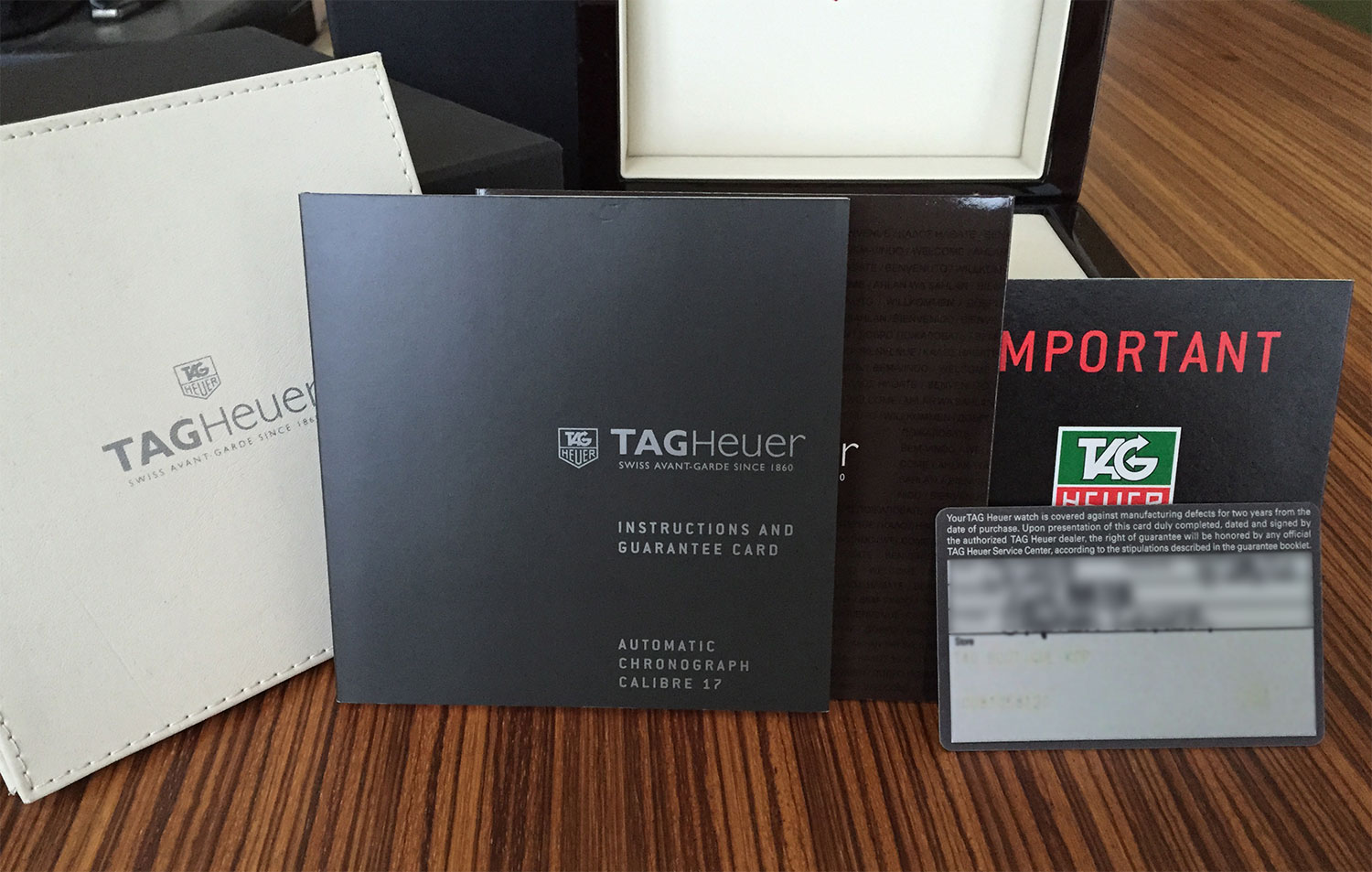6) Tag Heuer International warranty card dated 7/28/12. The watch was purchased from a TH Boutique. (purchaser info and stamp blurred for protection)