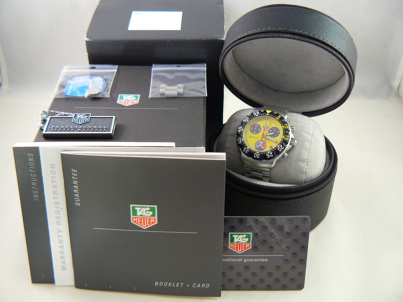 From my personal collection:A new old stock: TAG Heuer Formula One F1 Quartz 1/10th Chronograph, model no.: CA1213.BA0493, the serial number is also present.