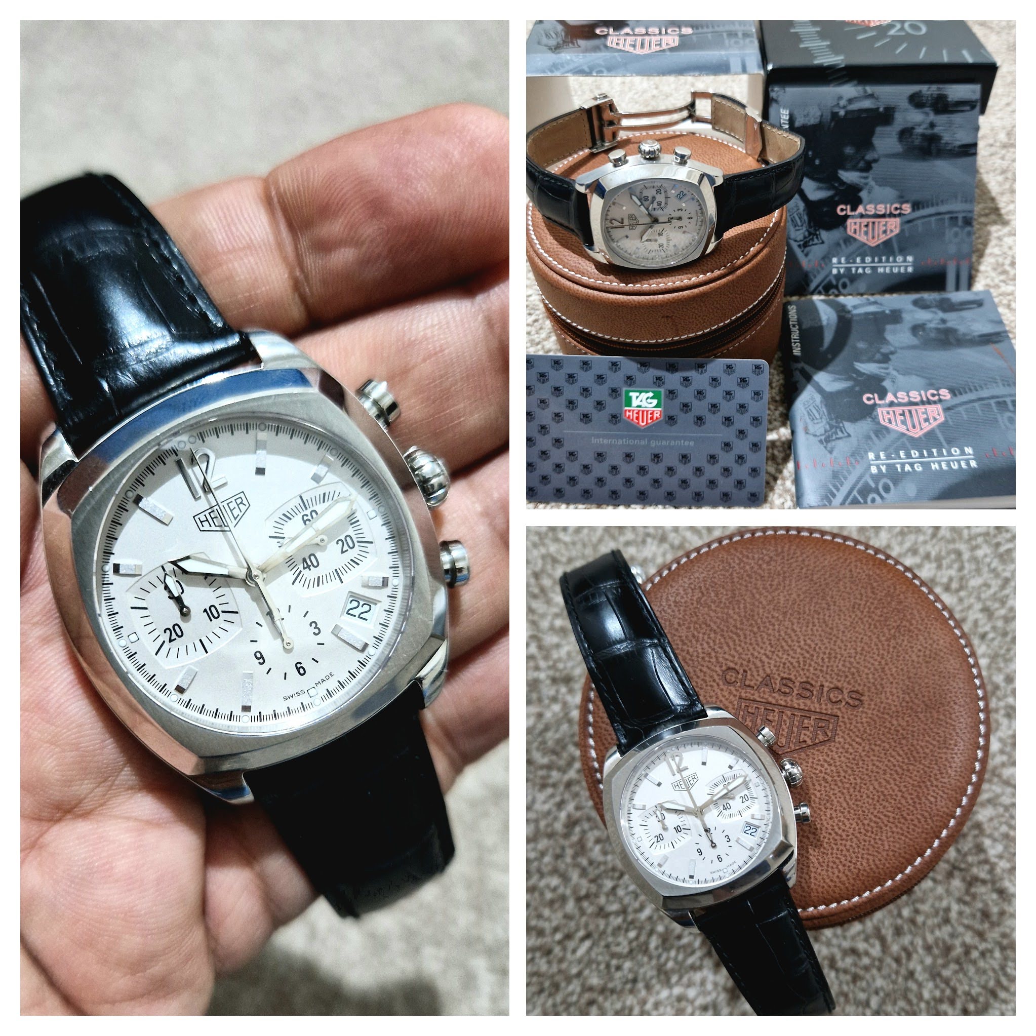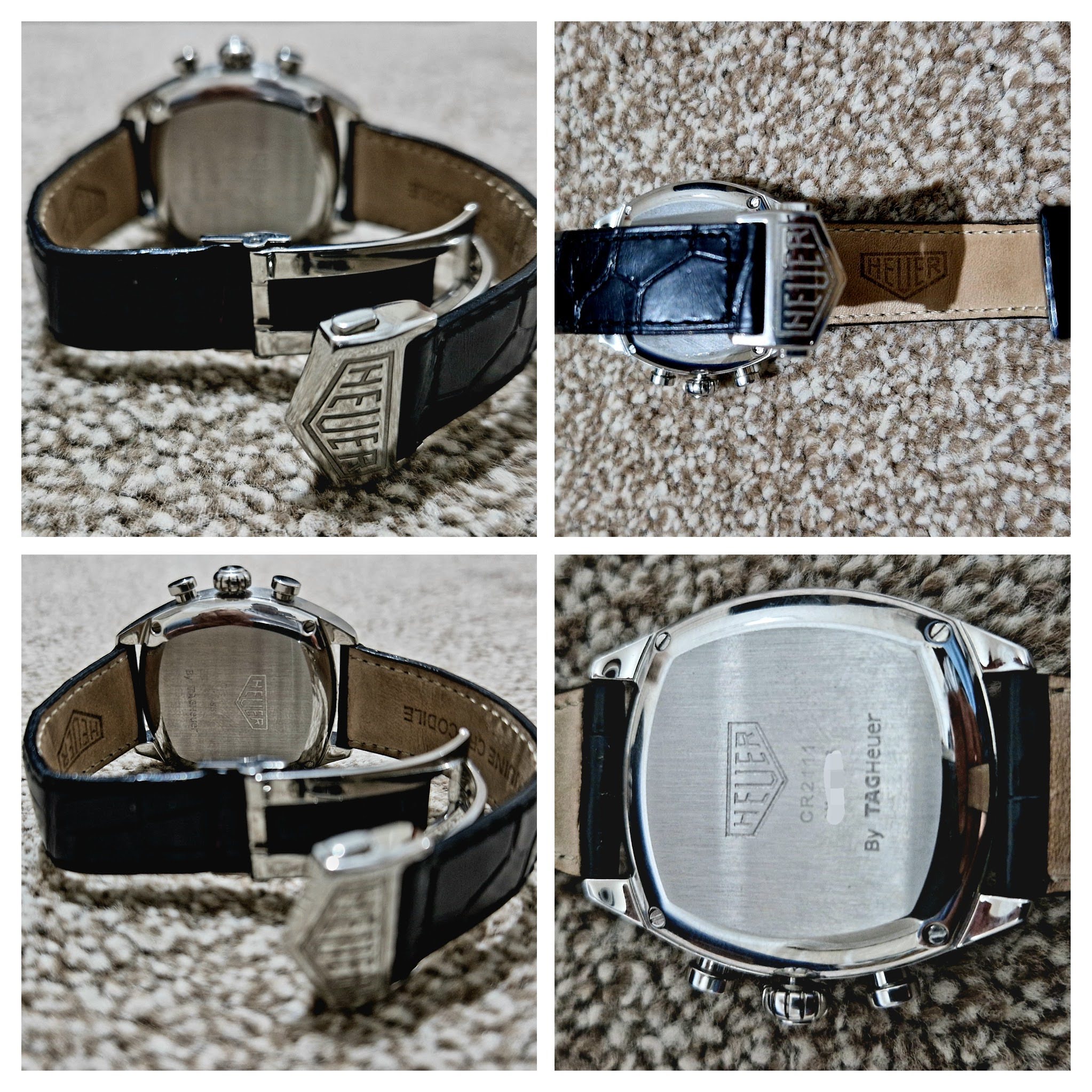 This watch was originally purchased in 2001 locally within UK. The watch is exceptional condition, and even the strap has minimal signs of wear. The watch comes triple boxed (outer sleeve, original box and leather case with pillow), the guarantee card manual, instruction manual and the warranty card. The watch has a black crocodile strap on a Heuer clasp.