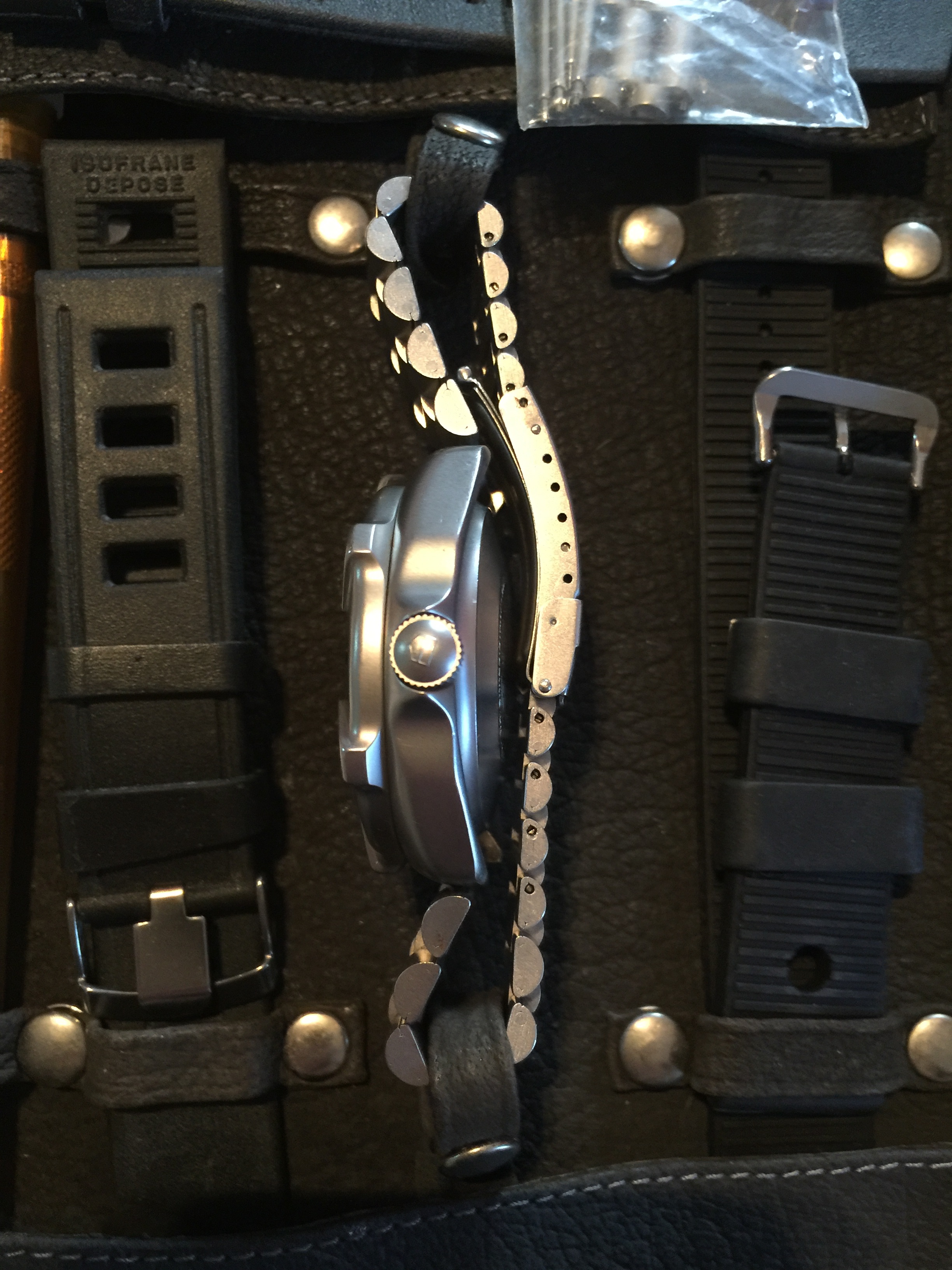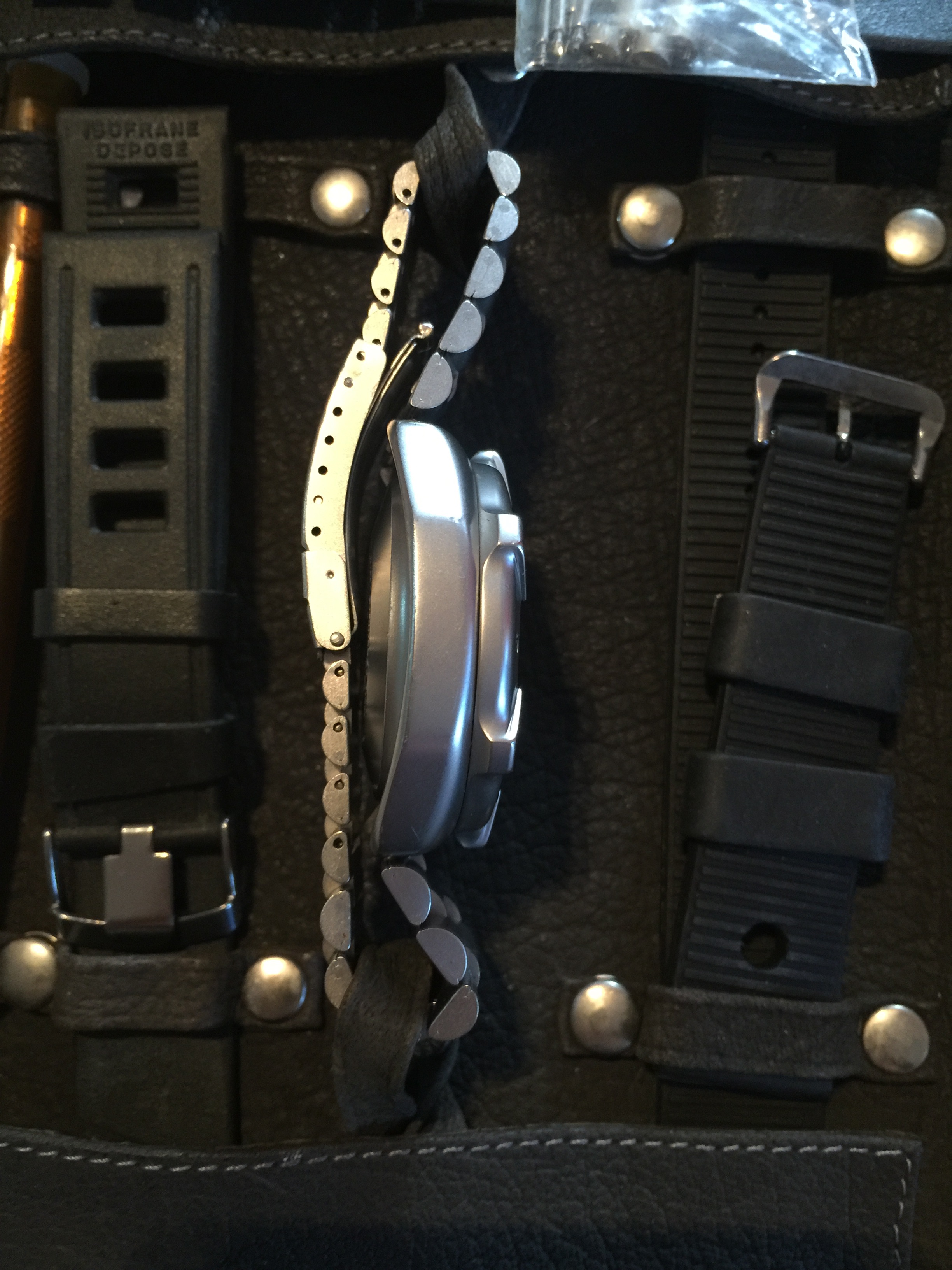 Now, the dive kit on this piece is beyond extensive. It is a leather diver kit, signed Heuer on the buckle and inside the leather sleeve. The ISOfrane straps are there too! As is the Heuer branded spring bar tool, in the orange tube (the tube has been lost in 99% of the kits I've seen). Also included are the papers and dive table, all of which are Heuer signed. Tag leather dive kits are out there, but the Heuer ones just can't be had, and this one is easily the most complete I've ever seen.
