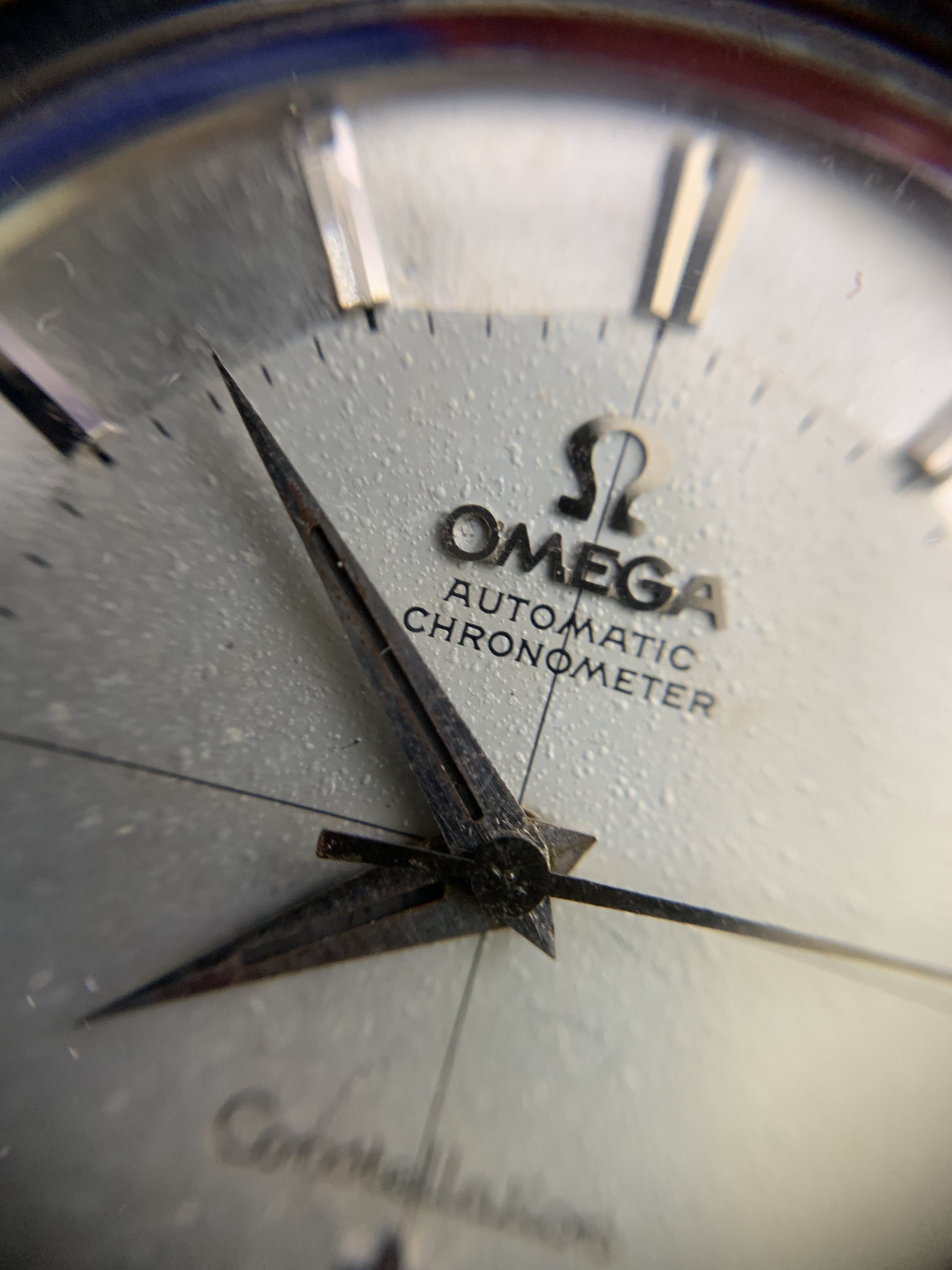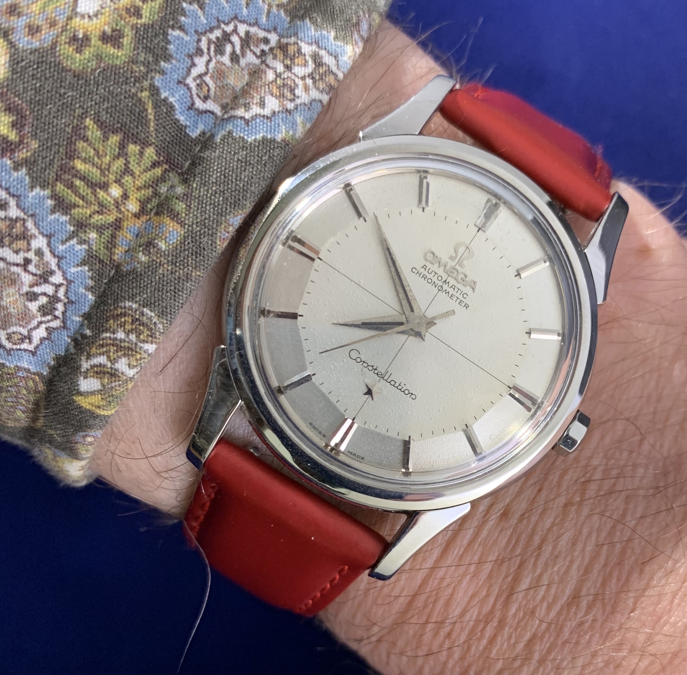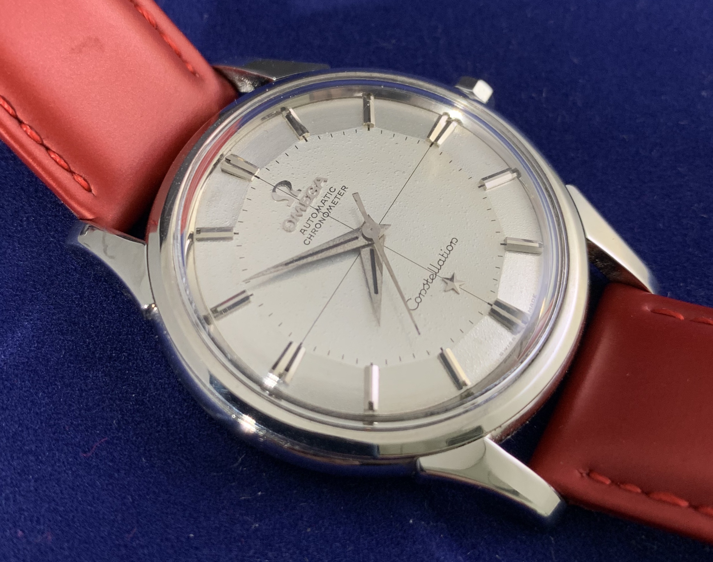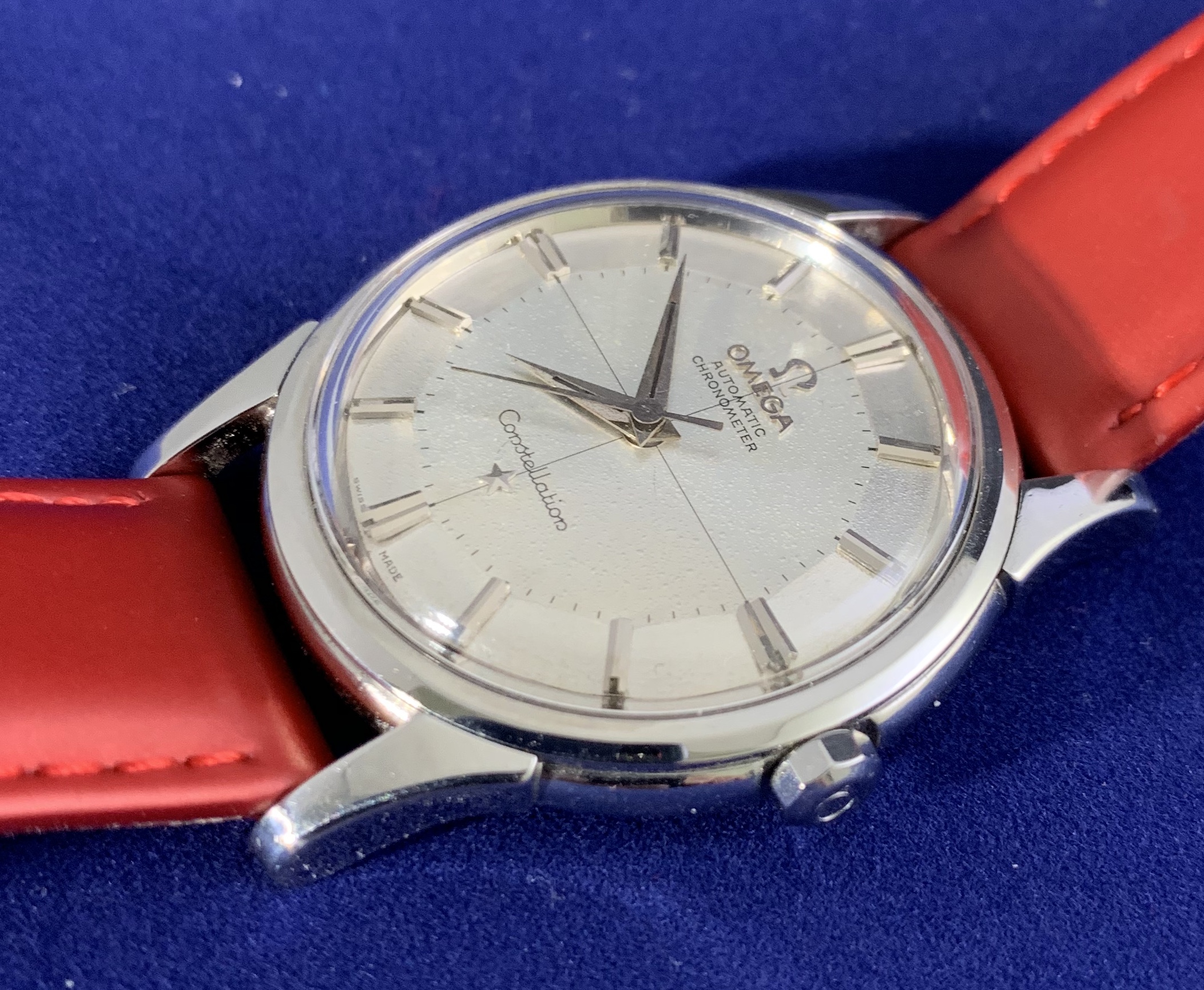 ·Vintage Omega constellation pie pan, ko 14381, gold cap, ss, cal 551, dated to 1959. Great condition, close up shows that the dial has not been restored, but the dimples cannot be seen with a naked eye. The 3 dimensional dial is a beautiful design. 18K gold cap on the case backis in good condition. Watch just got a $300service, so it is good to go for a while. 35mm case size without crown
