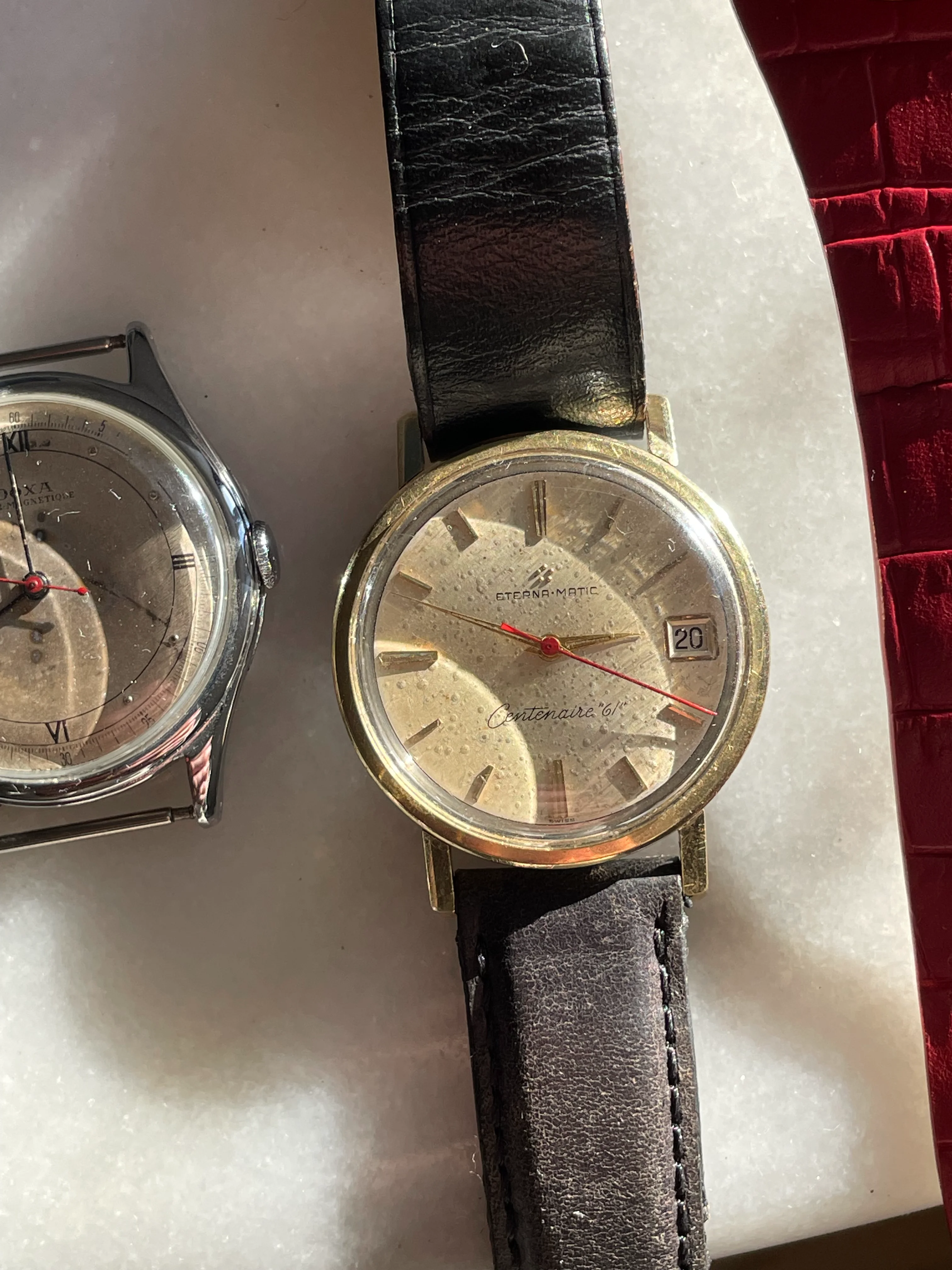 Posts 23 Likes 8 VMK Teddington ·Nov 3, 2025 Hi all, I just find several watches including this vintage Eterna Matic Centenaire 61 gold plated. I already have an Eterna but I never saw a mechanical Eterna with a red hand. I know that they produced electronic ones with the red hand. Thank you by advance for your help.