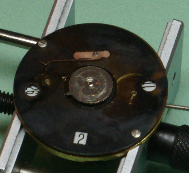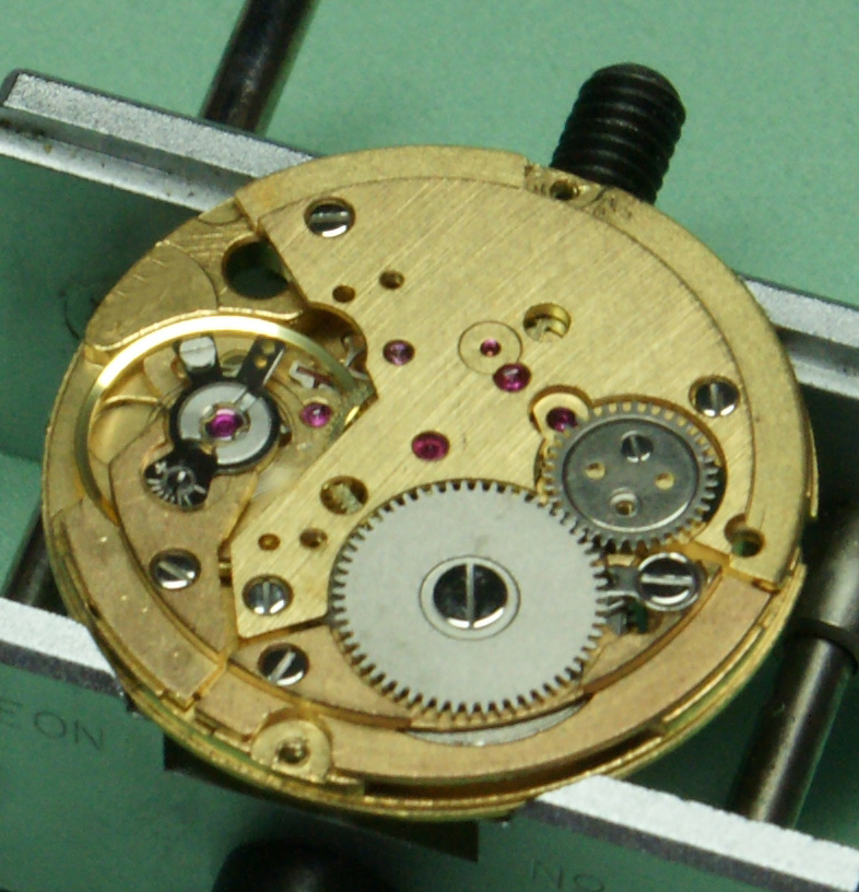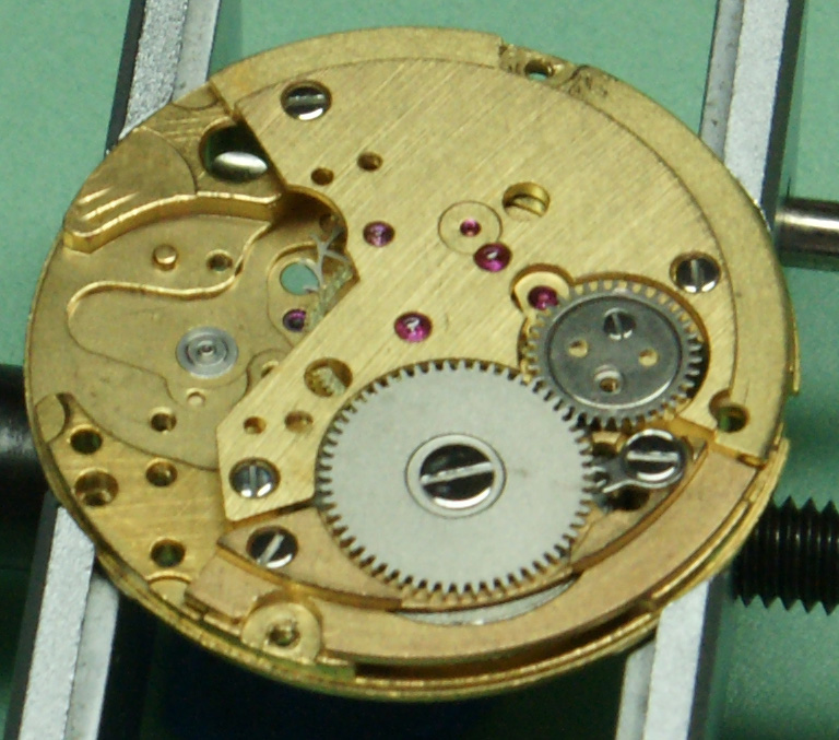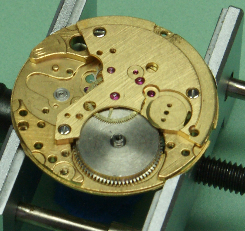 Now the auto winder goes back on (without the oscillating weight) as as you will see, the efficient bit of design here is that one of the screws for this is longer than the others and goes through the bridge and acts as the second screw for the crown wheel.