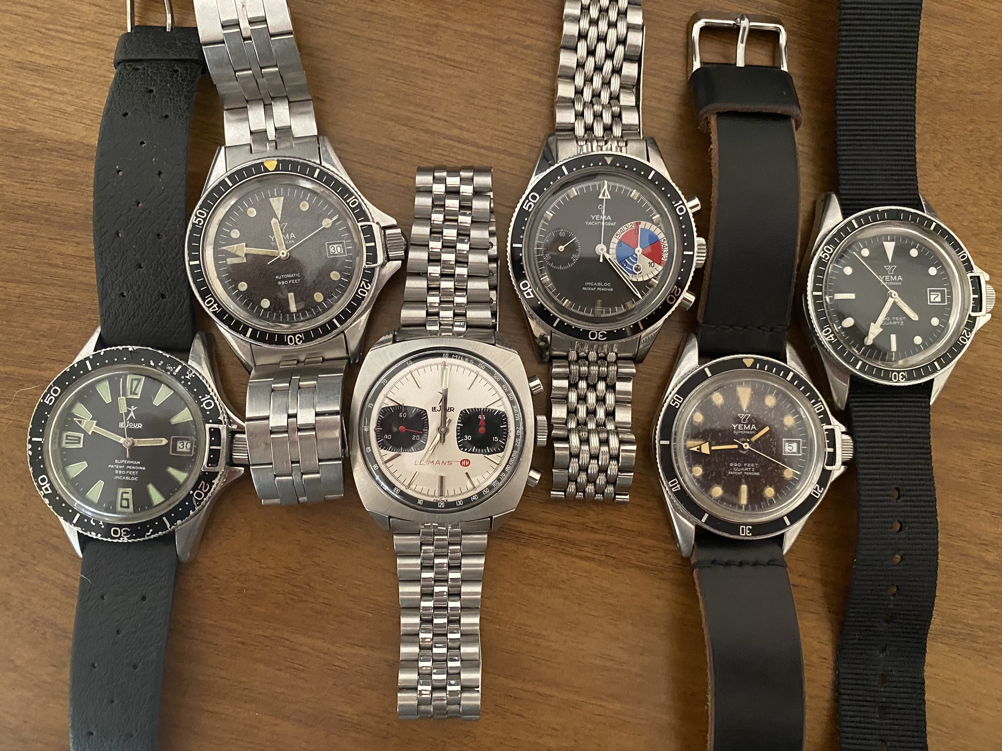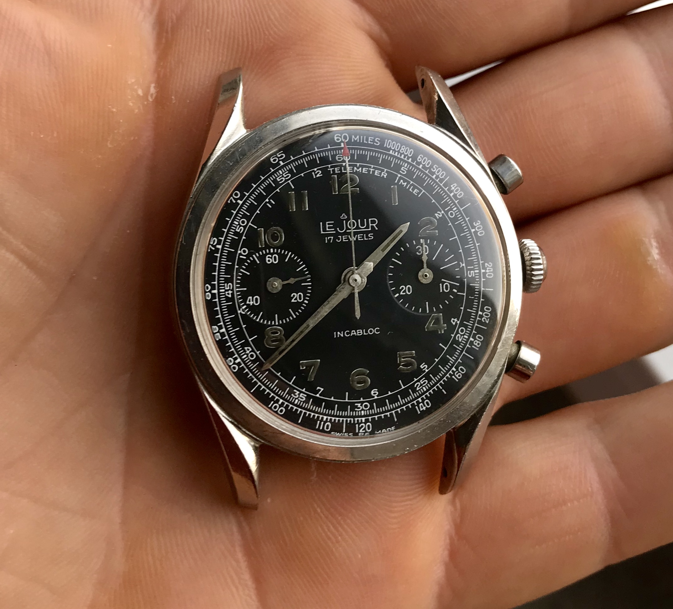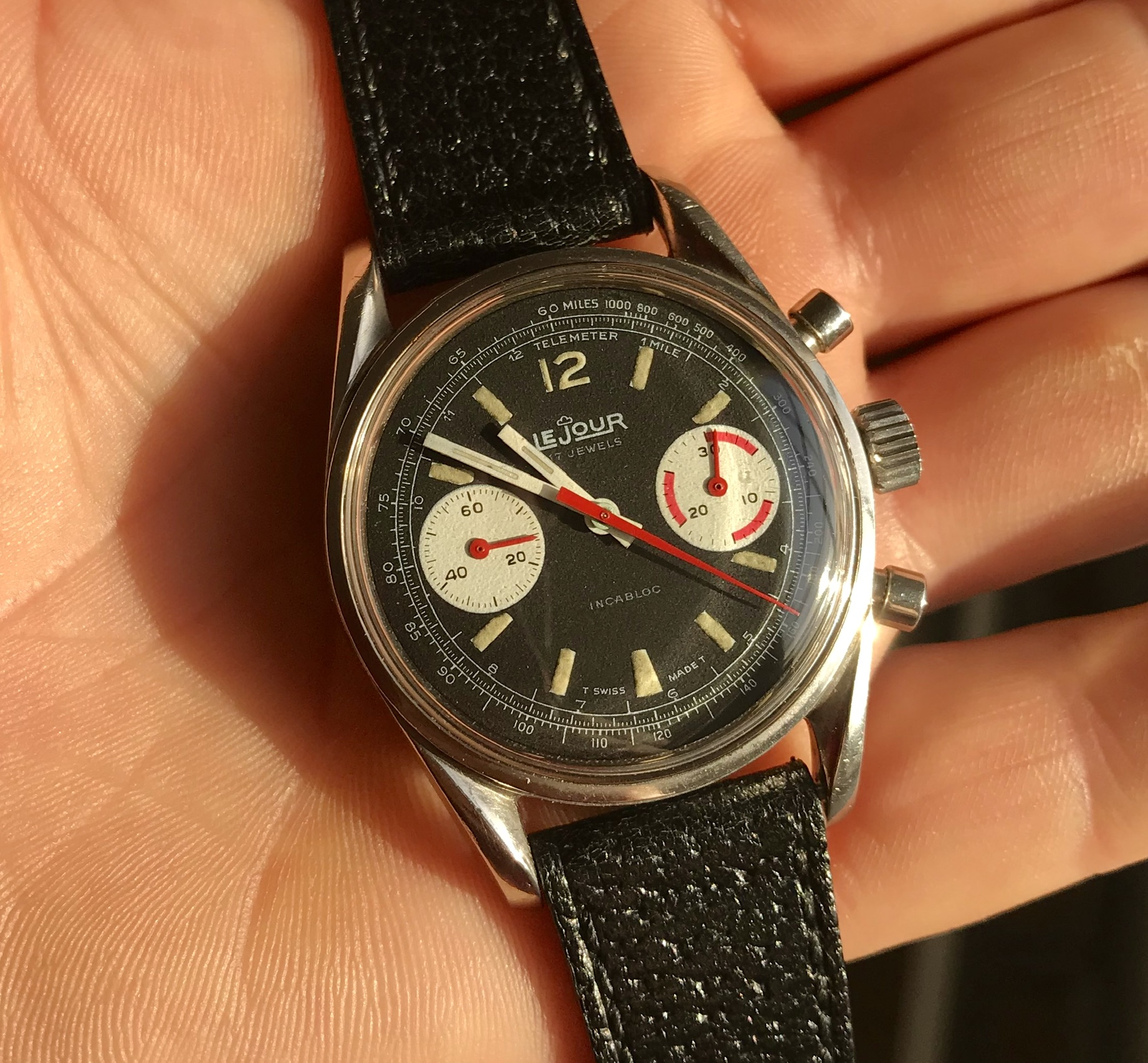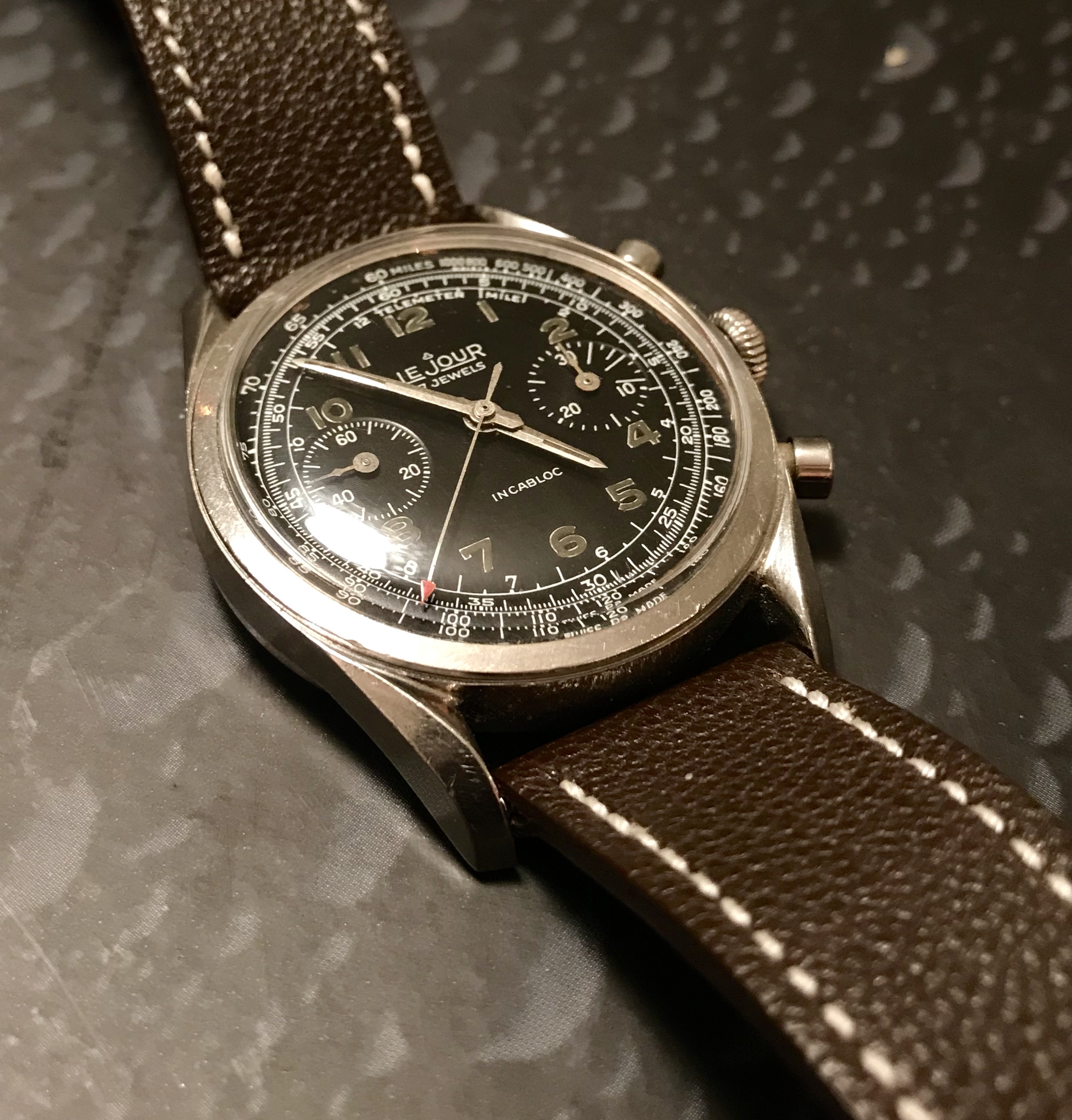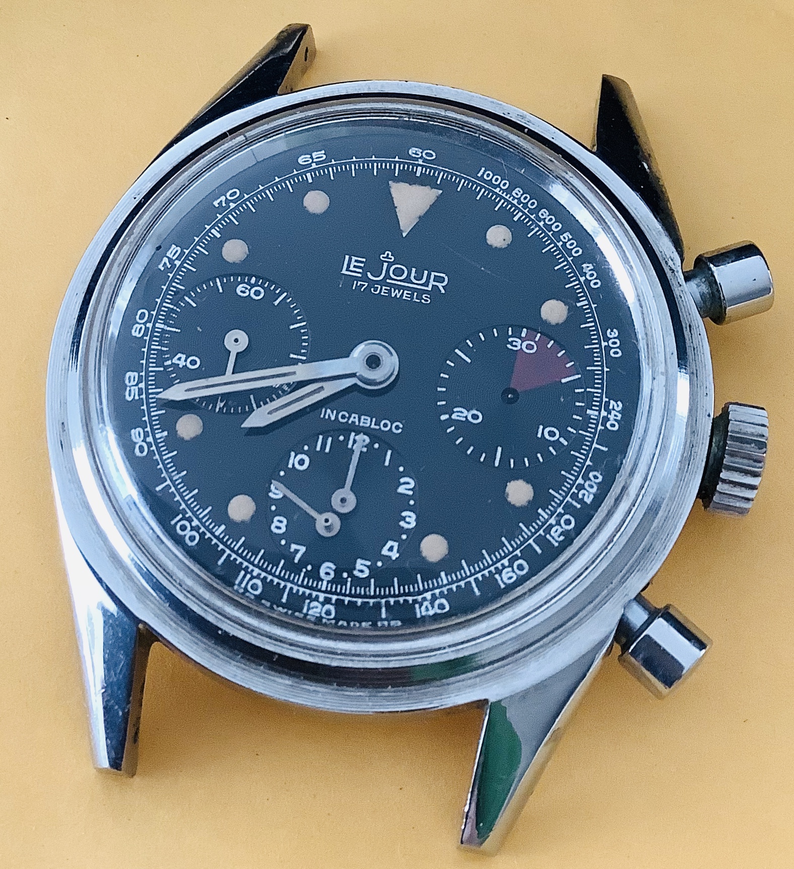 ·I've been spending a lot of time over the past few month looking into the mid-range tool-watch and sports-chronograph makers from the 1950s and 1960s. This started with the purchase of a Yema Meangraf Super, which I have since sold, using the proceeds to buy an early-year Rallygraf Super. I've also been looking at Ollech + Wajs, Helsa, and a few others. This led me to Le Jour, which is an odd duck. For those of you unfamiliar . . . Yema was a mid-range maker of cases and dials that was marketed in the States as Le Jour (presumably b/c the latter sounded more French). But Le Jour also produced watches using Yema/Le Jour dials on a range of very nice movements and cases. The rise in value of Yemas, the Yachtingraf and Rallygraf in particular, has generated more interest in Le Jours, and the watches themselves are often very nice in their own right, demonstrating a characteristic French flair. They're not Breitlings or Heuers, by any stretch, but if Yemas are on the order of Wakmann, then Le Jours might be favourably compared to Tressa, Helsa, the aforementioned Ollech Wajs or perhaps even LIP. I am still tracking down the details, but it also seems that Le Jour, like Wakmann, was involved in distributing Breitlings both under the Breitling name and rebranded for the mid-level market with Le Jour dials. Any more information anyone has on this would be most appreciated.