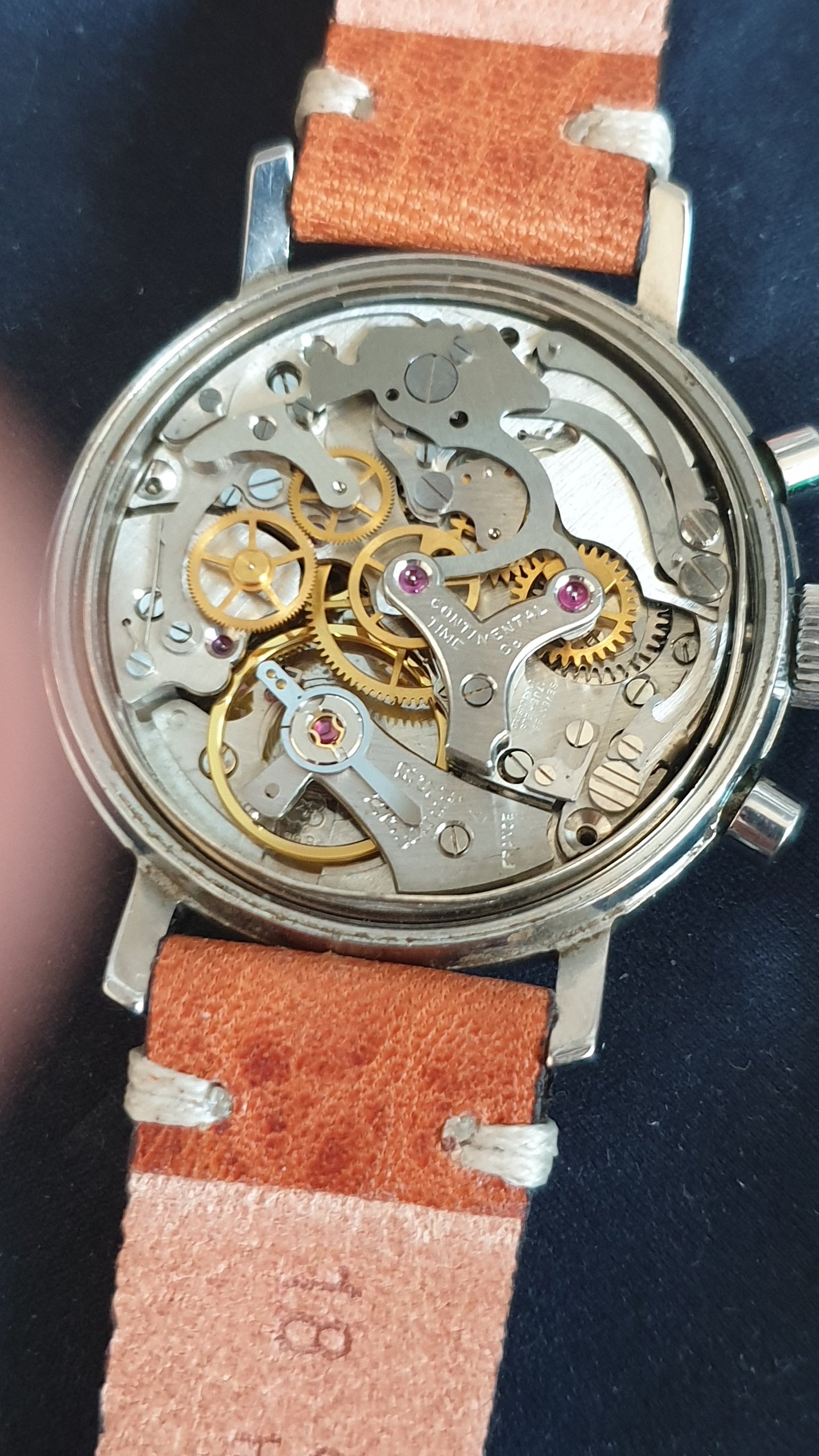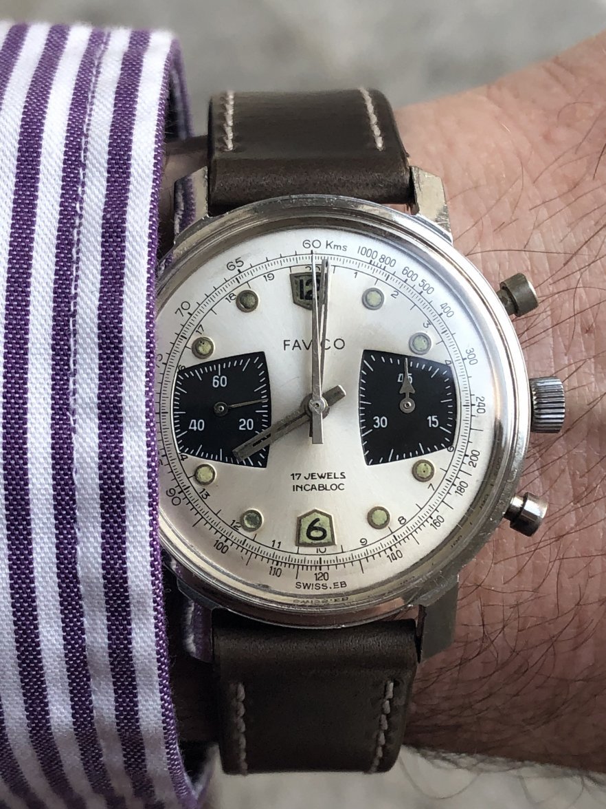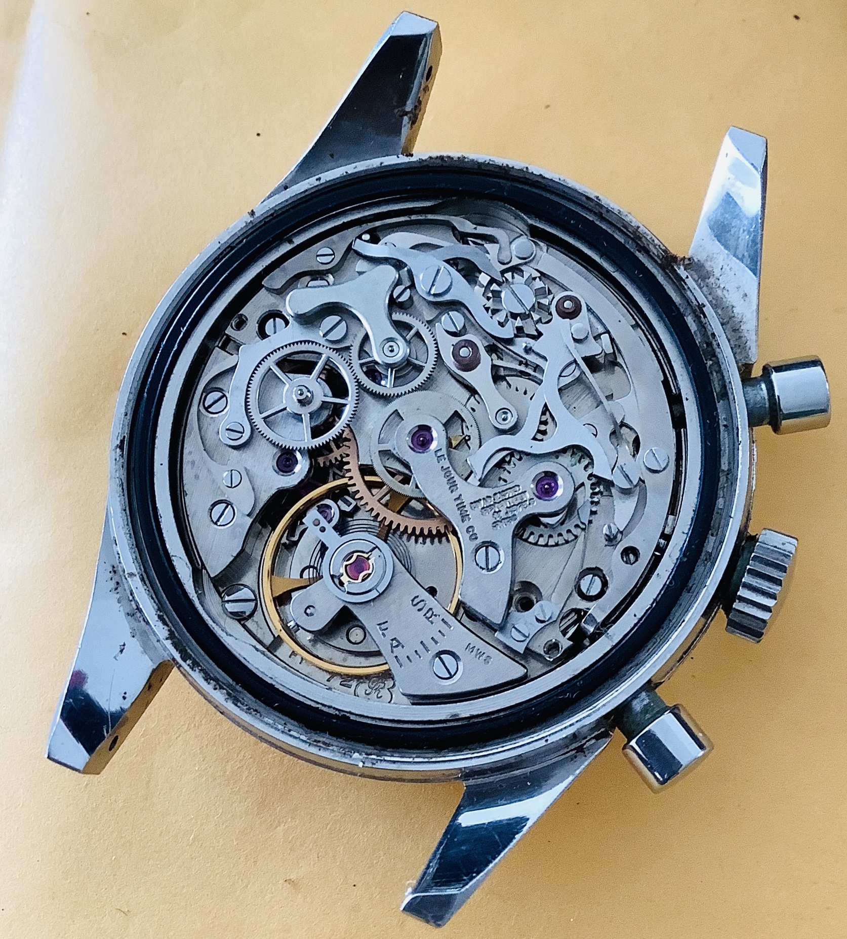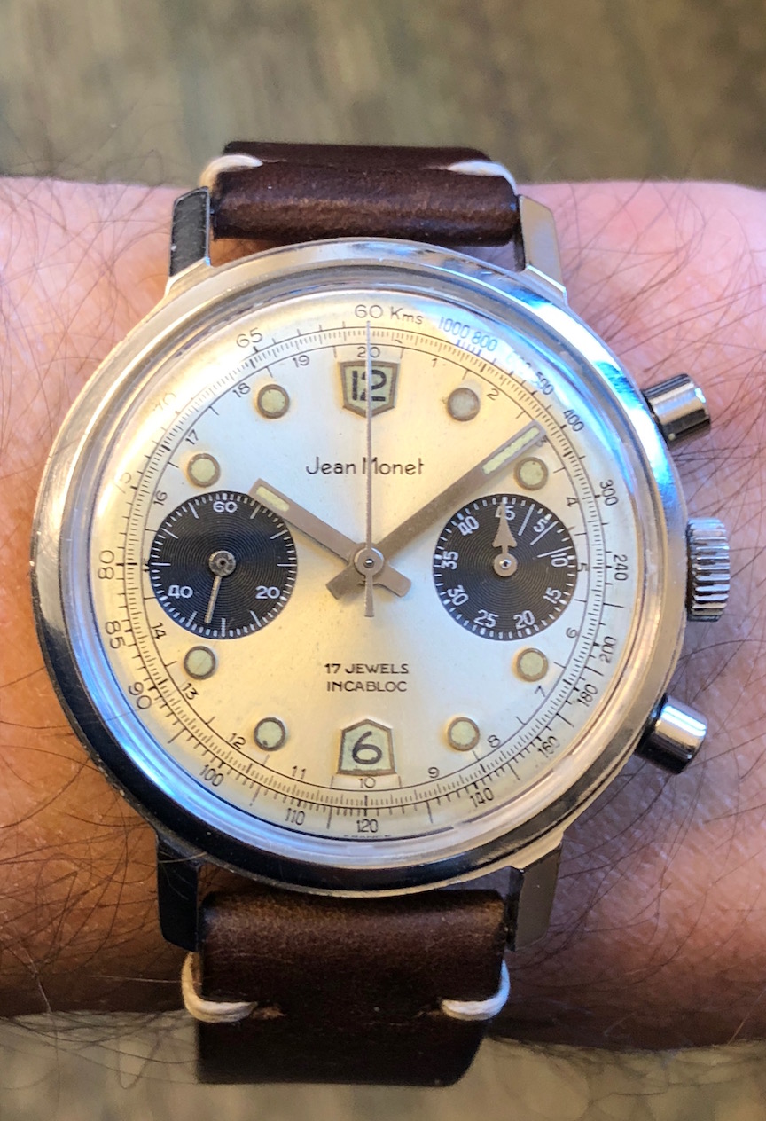 Anyway, I saw a Le Jour pilot's chronograph w/ a Valjoux 7730 mvt. that I liked on eBay, checked against some reference dials, then made a relatively low offer. Much to my delight, the seller accepted and sent the watch on. When it arrived, I opened it up not only to find a pristine and well-maintained movement, but one that was, instead of the expected Valjoux 7730, a Venus 188! I feel kind of like I bought what I thought was a four-cylinder Mustang from the mid 60s and instead ended up with a V-6 model from the late-50s. I immediately wrote the buyer, let them know the discrepancy (an easy mistake to make, given the 7730 is modelled directly on the 188), and thanked them again for selling it at such a reasonable price.