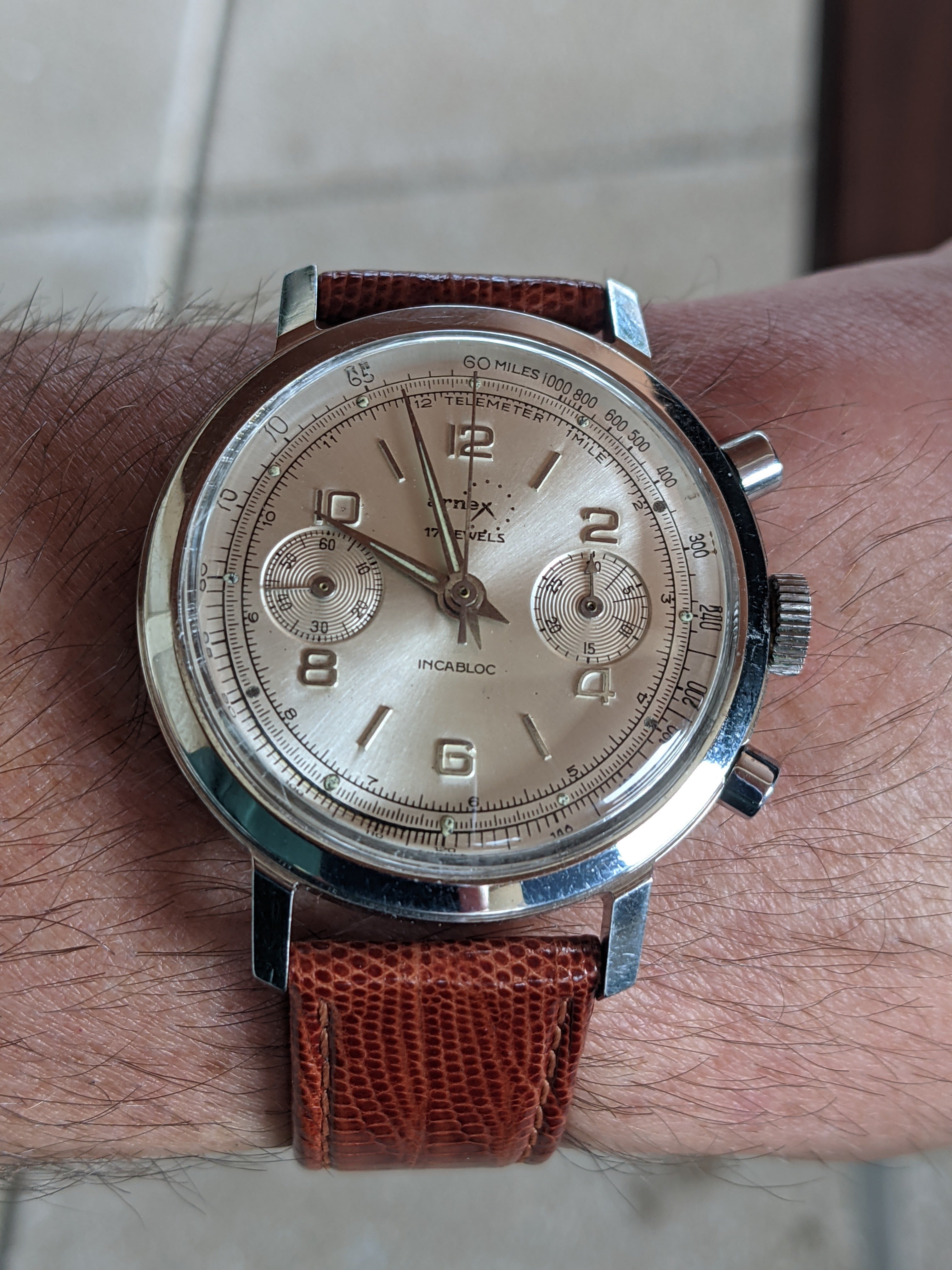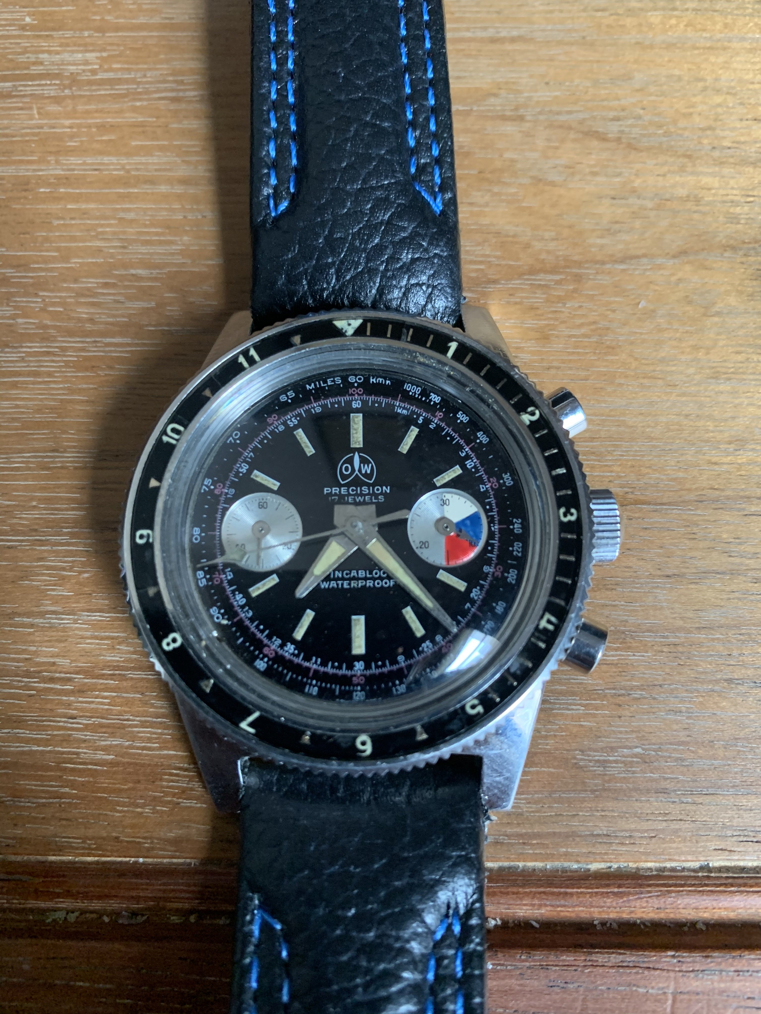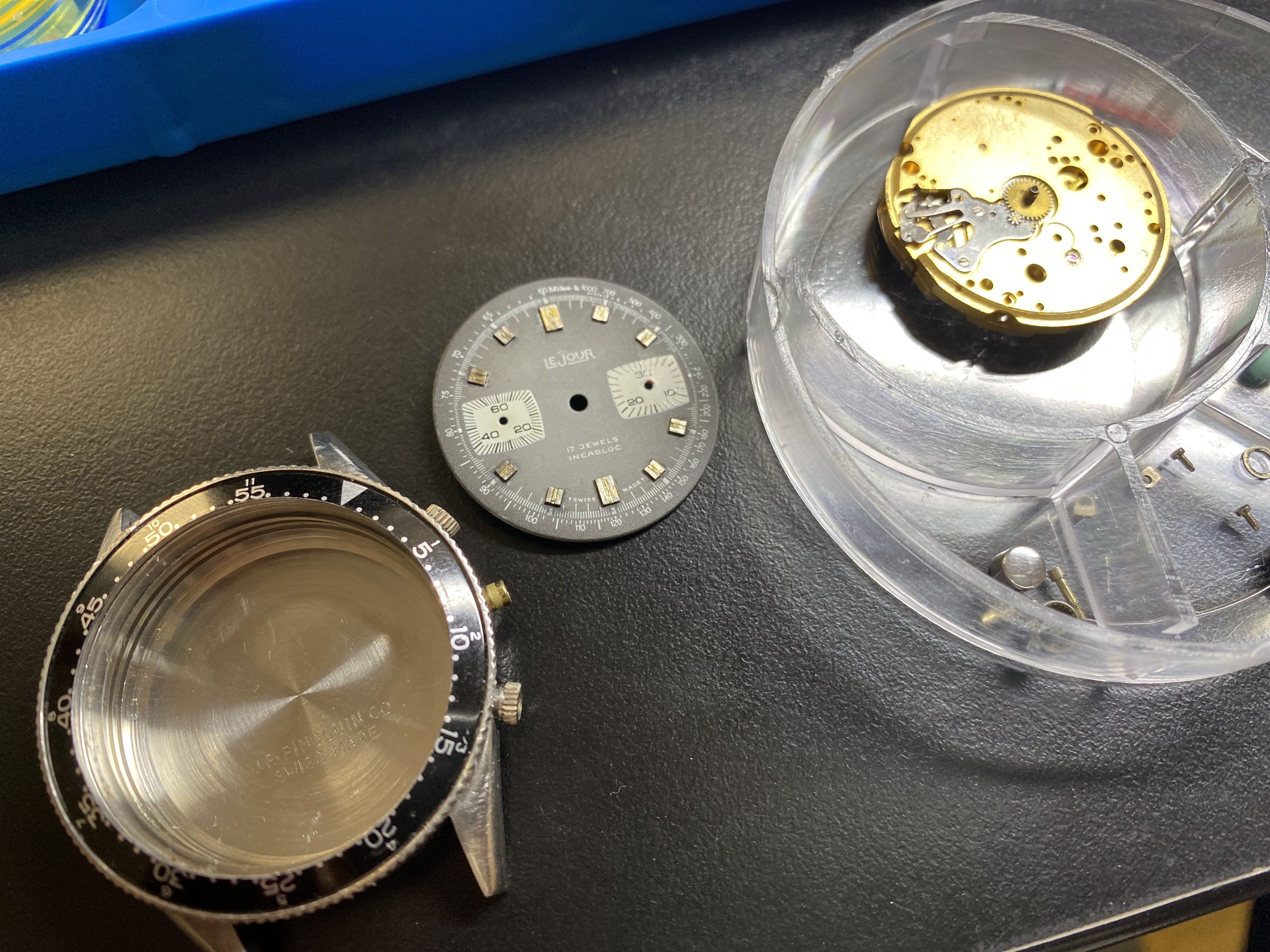 Anyway, I saw a Le Jour pilot's chronograph w/ a Valjoux 7730 mvt. that I liked on eBay, checked against some reference dials, then made a relatively low offer. Much to my delight, the seller accepted and sent the watch on. When it arrived, I opened it up not only to find a pristine and well-maintained movement, but one that was, instead of the expected Valjoux 7730, a Venus 188! I feel kind of like I bought what I thought was a four-cylinder Mustang from the mid 60s and instead ended up with a V-6 model from the late-50s. I immediately wrote the buyer, let them know the discrepancy (an easy mistake to make, given the 7730 is modelled directly on the 188), and thanked them again for selling it at such a reasonable price.