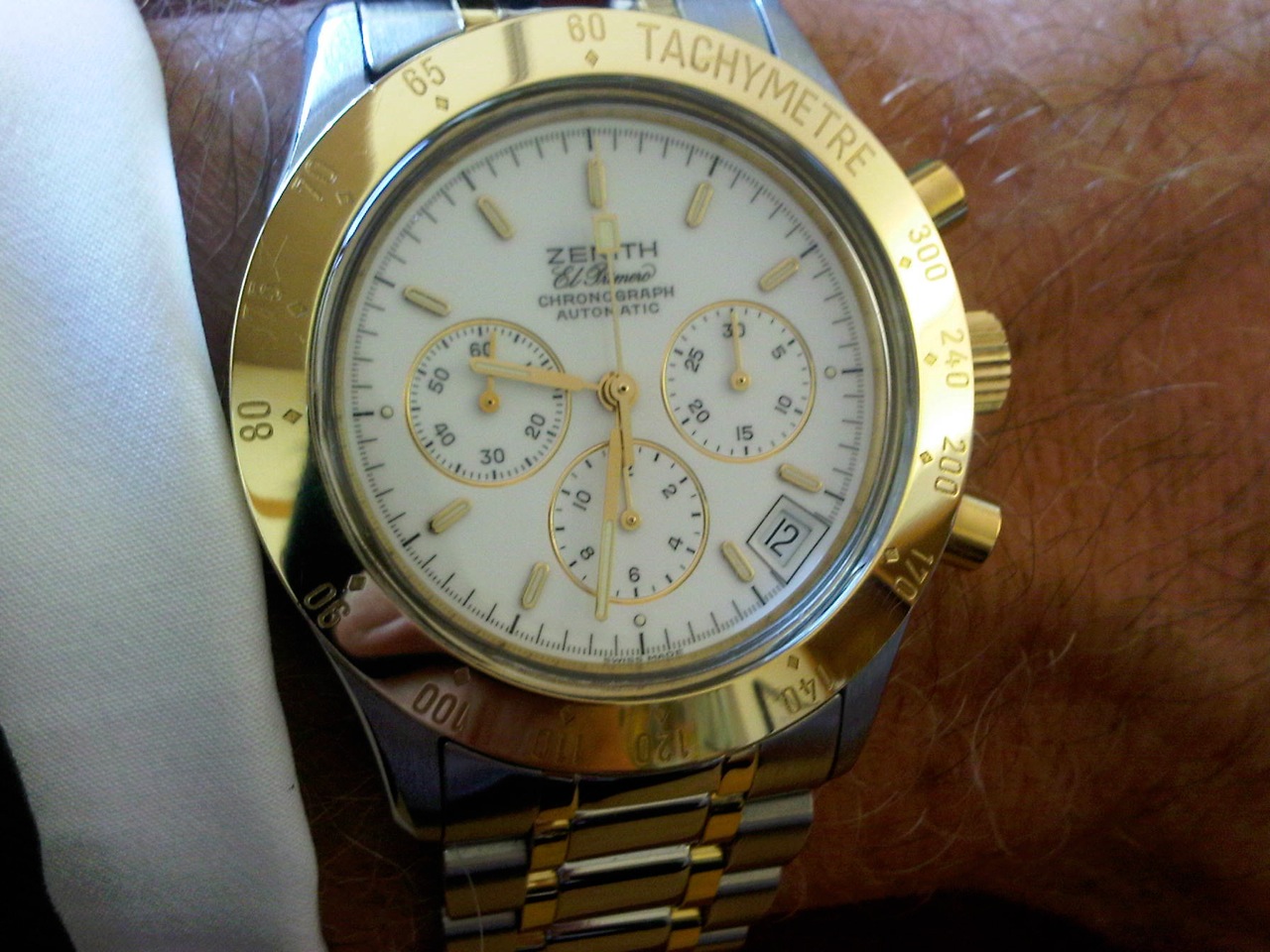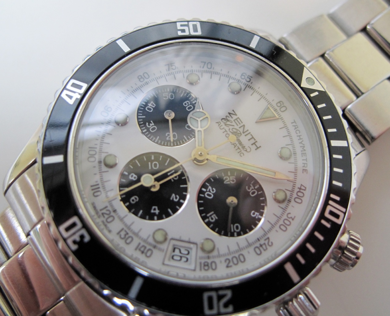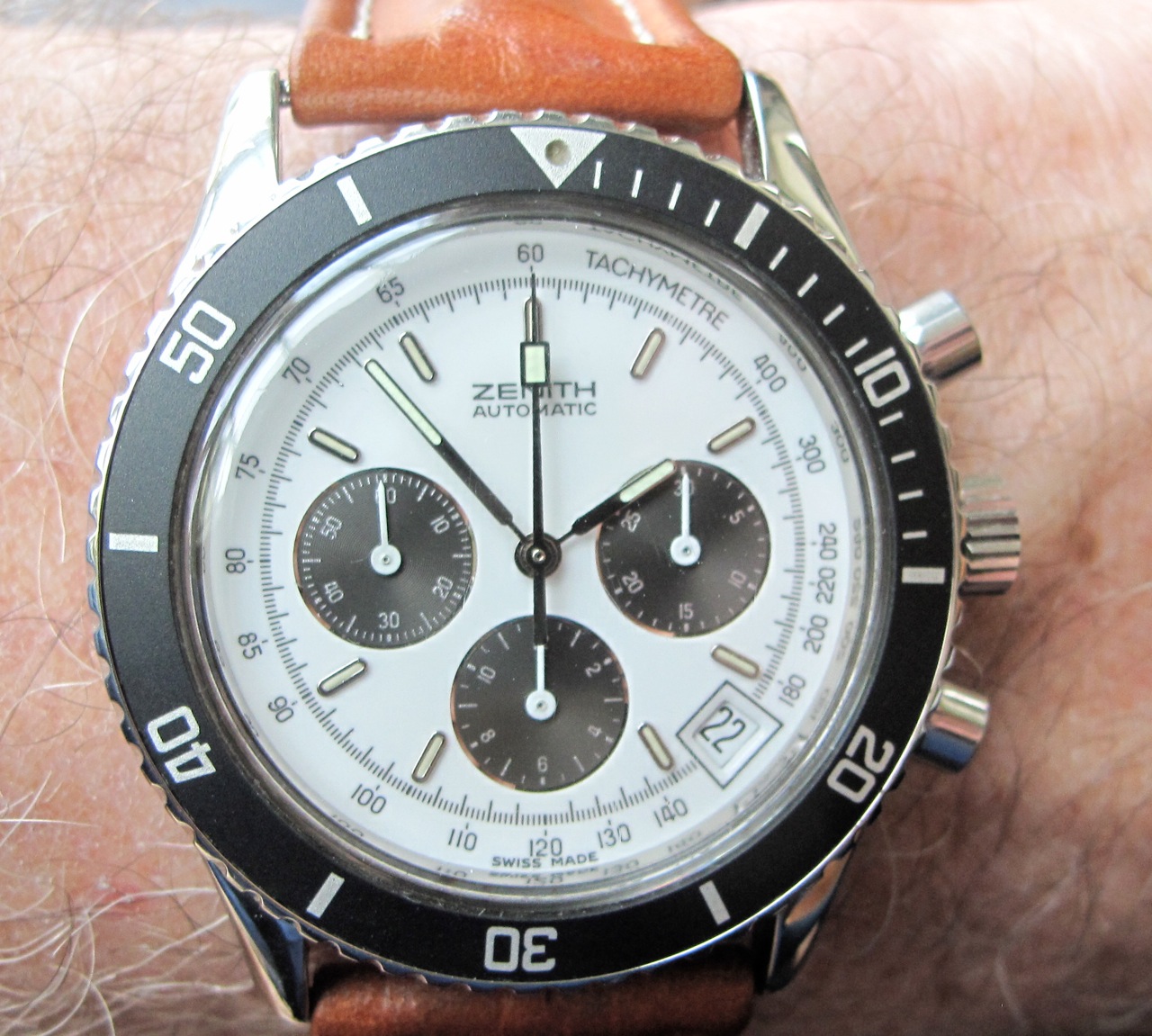 In 1990, Zenith proceeded in three different directions with the De Lucas. The second generation of the De Luca I series (an example is the one on the eBay thread) underwent a significant change in dial design, for both white and black versions. The hour markers became round, and "Mercedes" style hands were adopted. This design was maintained through the third and fourth generations, the only changes being to the crown and pushers (ending with screw-down versions in generation 4). The fourth and last generation (1994-96) also changed the bezel material. Mine, ref. 02.2313.400, was purchased in 1995 in Germany (not by me). The series ended in 1996 and was succeeded by the Rainbow series in 1997. My white-dialled example of the last generation: