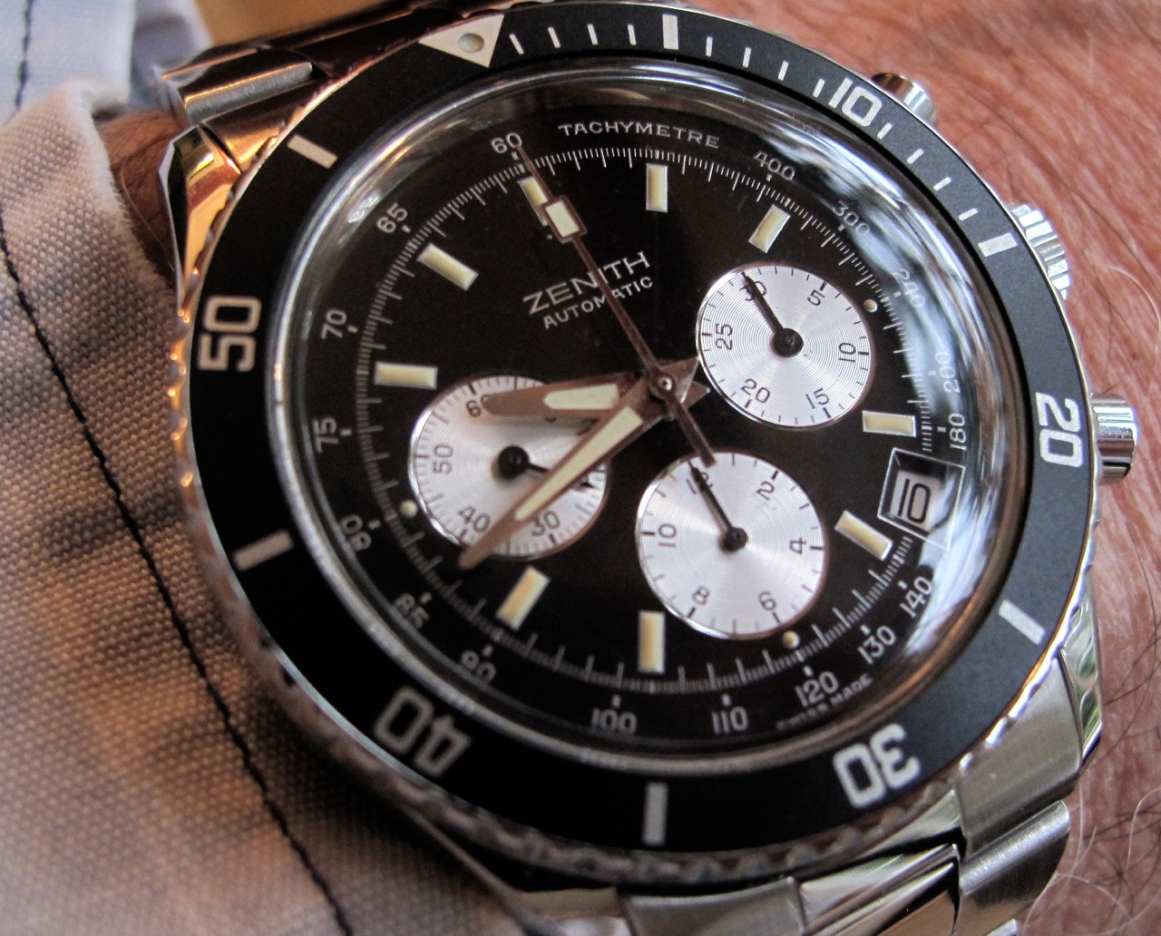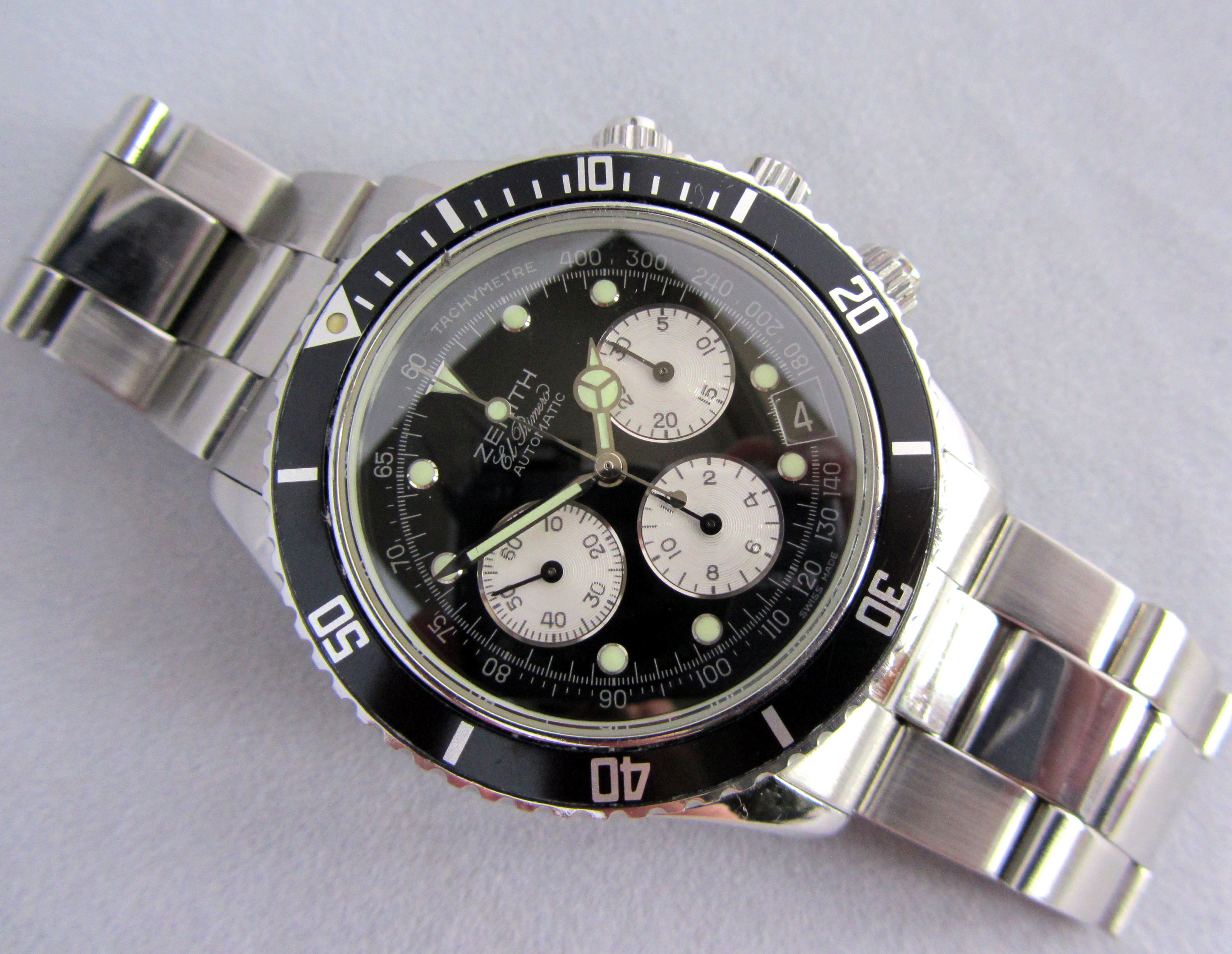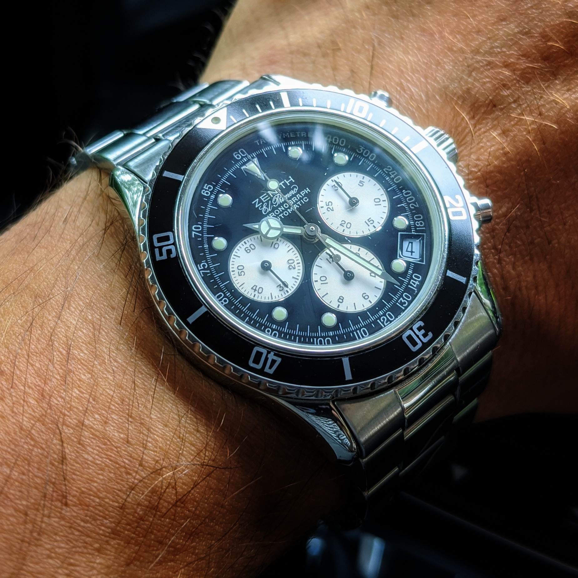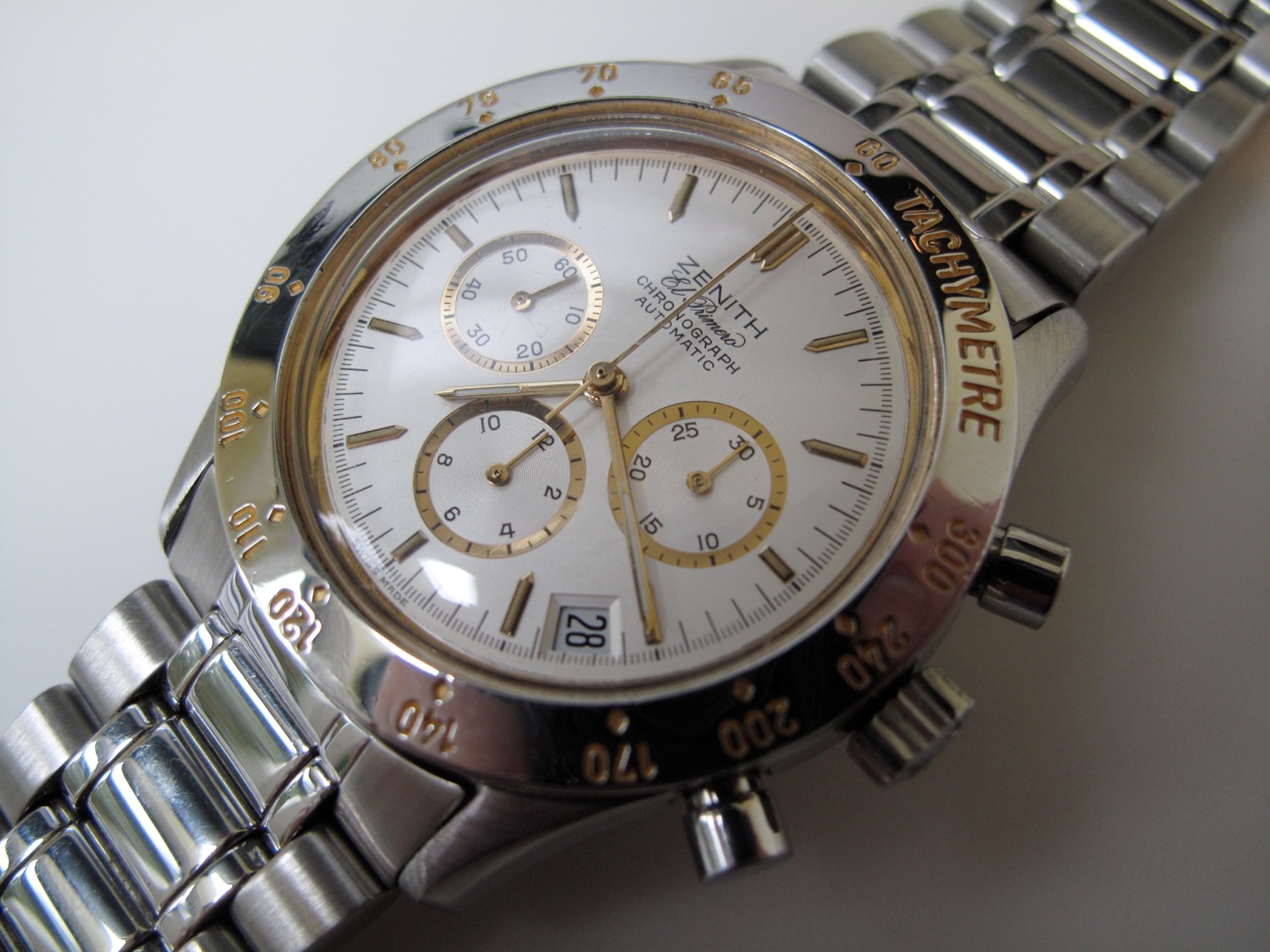 In 1990, Zenith proceeded in three different directions with the De Lucas. The second generation of the De Luca I series (an example is the one on the eBay thread) underwent a significant change in dial design, for both white and black versions. The hour markers became round, and "Mercedes" style hands were adopted. This design was maintained through the third and fourth generations, the only changes being to the crown and pushers (ending with screw-down versions in generation 4). The fourth and last generation (1994-96) also changed the bezel material. Mine, ref. 02.2313.400, was purchased in 1995 in Germany (not by me). The series ended in 1996 and was succeeded by the Rainbow series in 1997. My white-dialled example of the last generation: