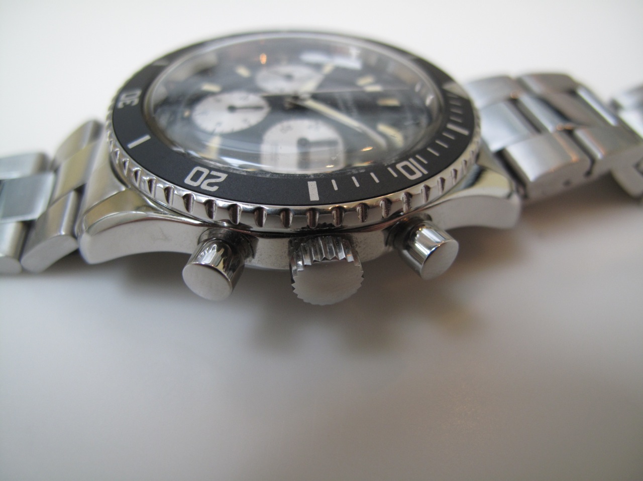 Many think the first generation black-faced version, ref. 01.0042.400 (1,025 produced, 1988-89) was the prettiest. Mine has silver sub-dials, though they also came with white sub-dials. The dial design harkened back to the A277 manual chronograph. The crowns are plain and slightly domed: