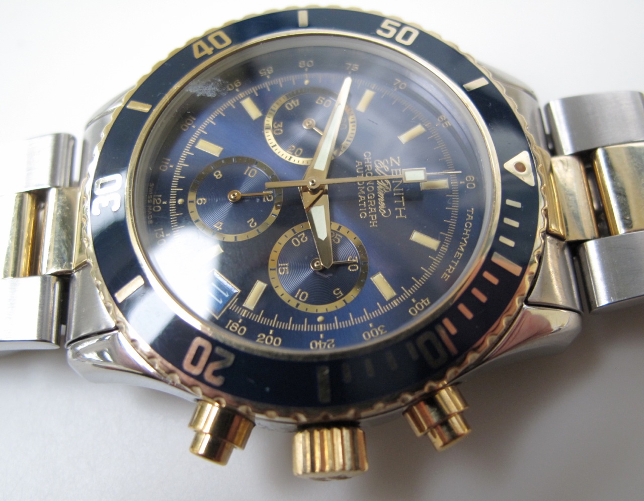"De Luca" is actually a nickname, the name of Zenith's chief agent for Italy at the time, who inspired the original design. Beginning in 1988, this was Zenith's first major new series after the resurrection of the El Primero. The original series ("De Luca I") is characterized by 40mm steel cases with uni-directional rotating black diver's bezel (matte finish until the 4th generation when it became glossy), and either black or white dials with contrasting sub-dials. The first series generation came with brown leather straps. The steel De Luca bracelet was optional.