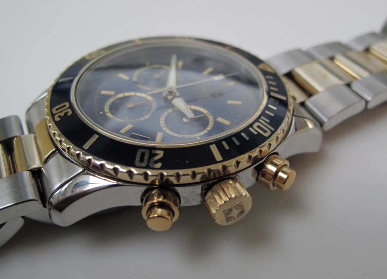 Also in 1990, Zenith issued some "special models" including two in gold and steel. My example is a ref. 89.0315.400, of which 530 were produced. The entire production was shipped to A. Cairelli in Rome. The bracelet is the typical De Luca I design, but with the centre pieces made of gold. Note the similarity in dial design with the black version of the first generation De Luca I: