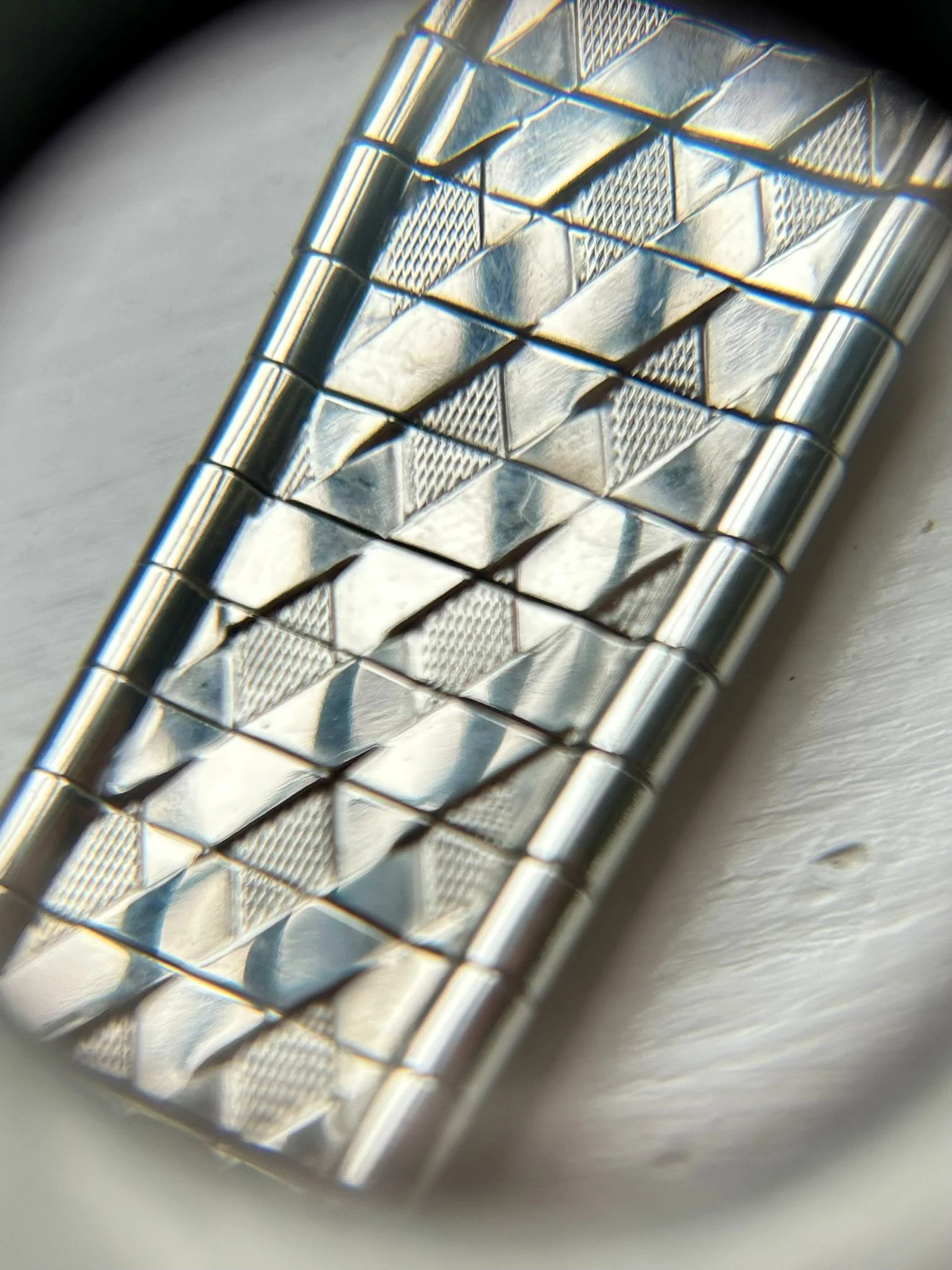 Paired with a truly fantastic vintage NOS 16mm bracelet, which deserves a mention of its own: high-polish, with an ornate diamond-cut pattern alternating between smooth and textured finishes - one of the more unique and well-suited pairings I’ve come across. It wears like jewelry without feeling delicate - the whole ensemble has an unmissable presence.