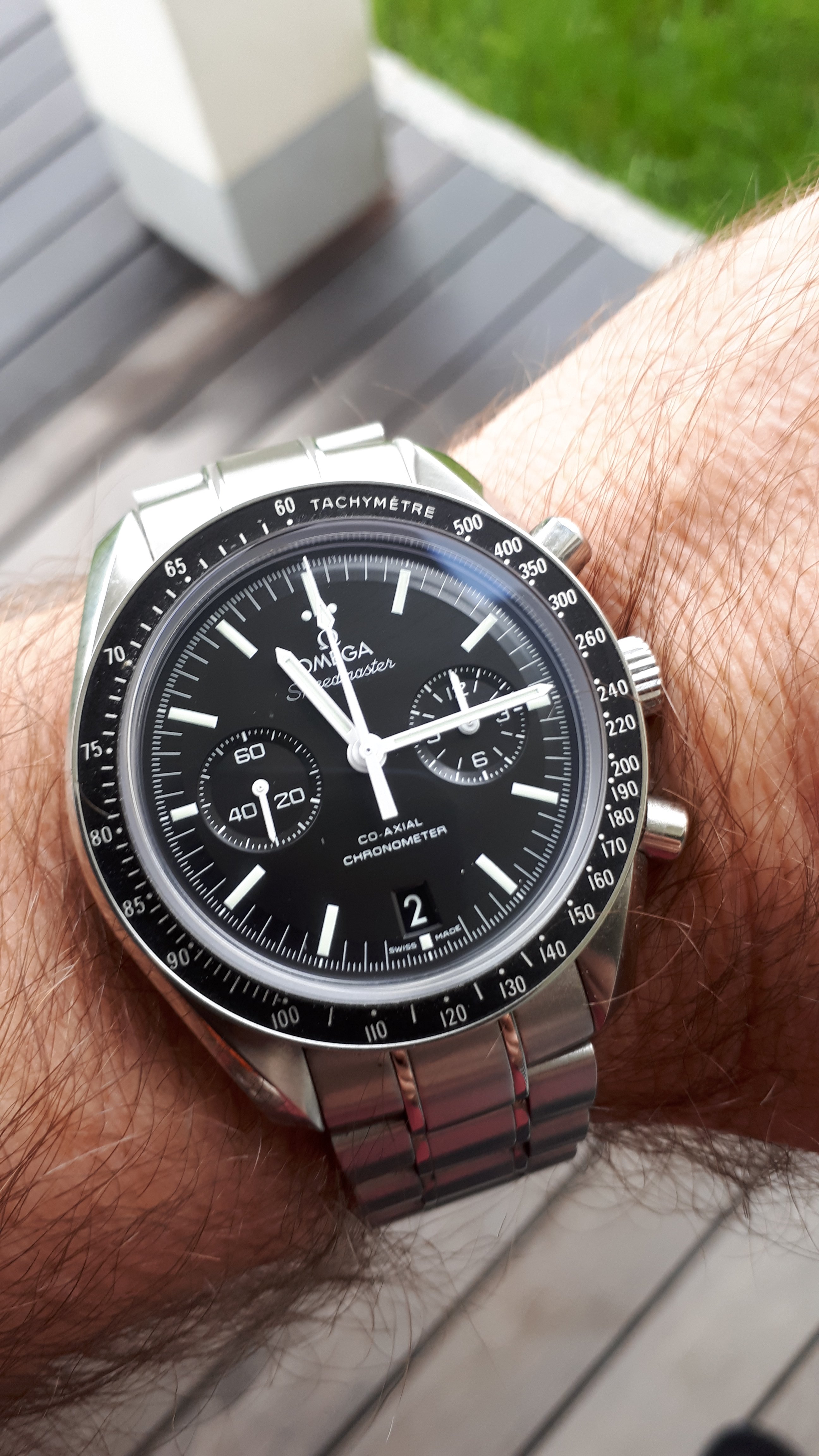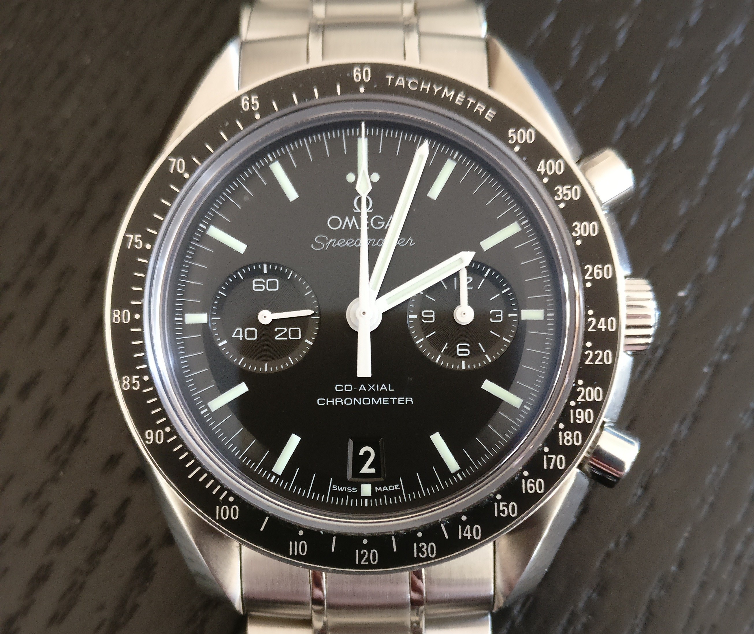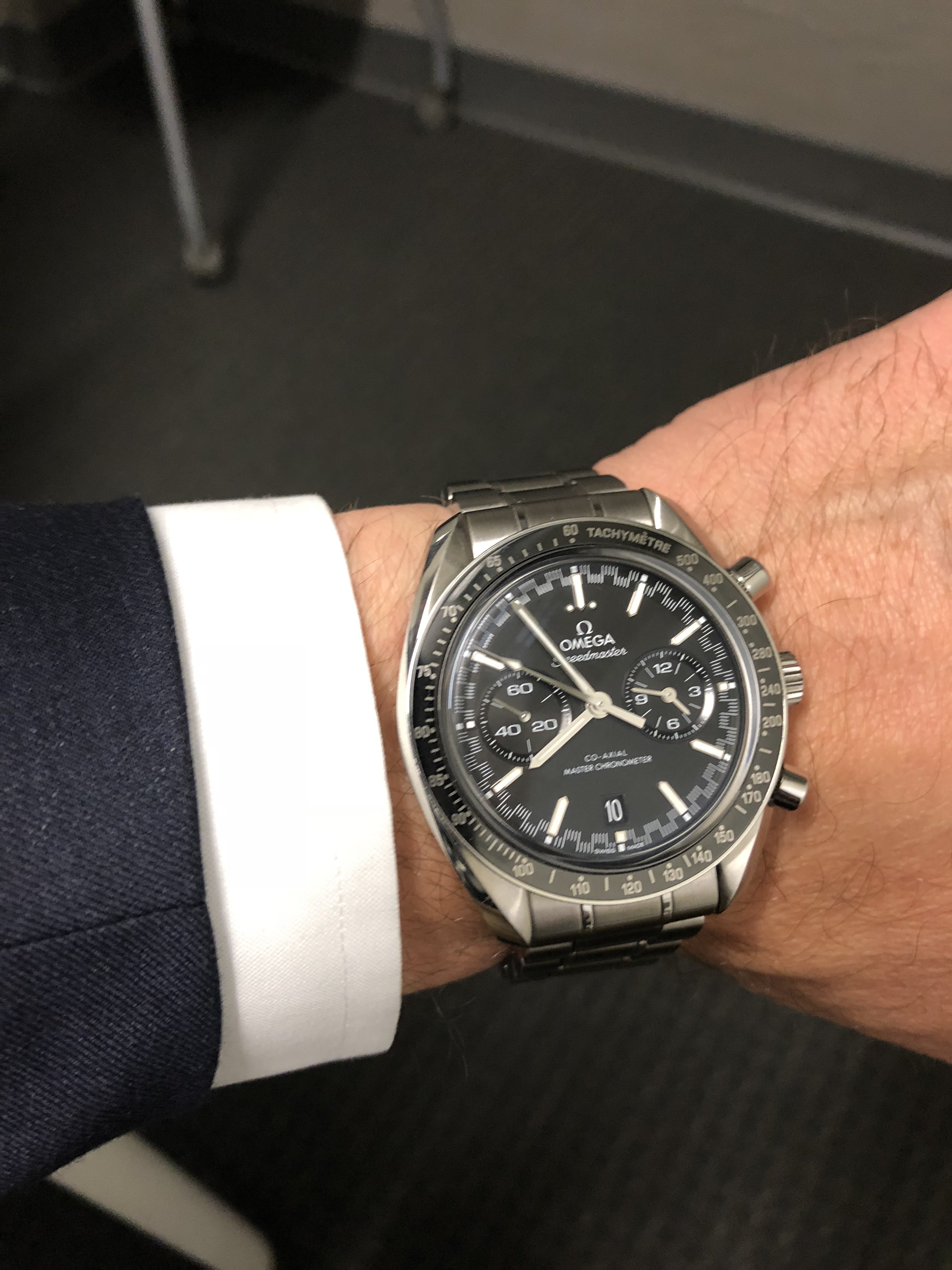 So, first, the aesthetics. I sometimes call this model (311.30.44.51.01.002) the "Steel Side of the Moon" (SSOTM) because it is more-or-less the same watch as the first edition of the ceramic Dark Side of the Moon, only constructed with different materials (https://www.hodinkee.com/articles/a-week-on-the-wrist-the-omega-speedmaster-dark-side-of-the-moon). Probably because the styling is so close to the traditional Speedmaster Professional, Omega chose to call this reference the "Moonwatch Co-axial Chronometer". This is a bit of a controversial choice because for Speedmaster officionados, the term moonwatch refers to a manually wound Speedmaster, with three sub-registers, no date, and typically a hesalite crystal (https://www.hodinkee.com/articles/understanding-the-omega-Speedmaster-professional). This watch has exactly none of those characteristics. Nevertheless, the look is unmistakably that of a Speedmaster. Because of that, the 9300 has the happy knack of being extremely versatile. For me, that's one of the factors that makes it a go-to traveling watch.
