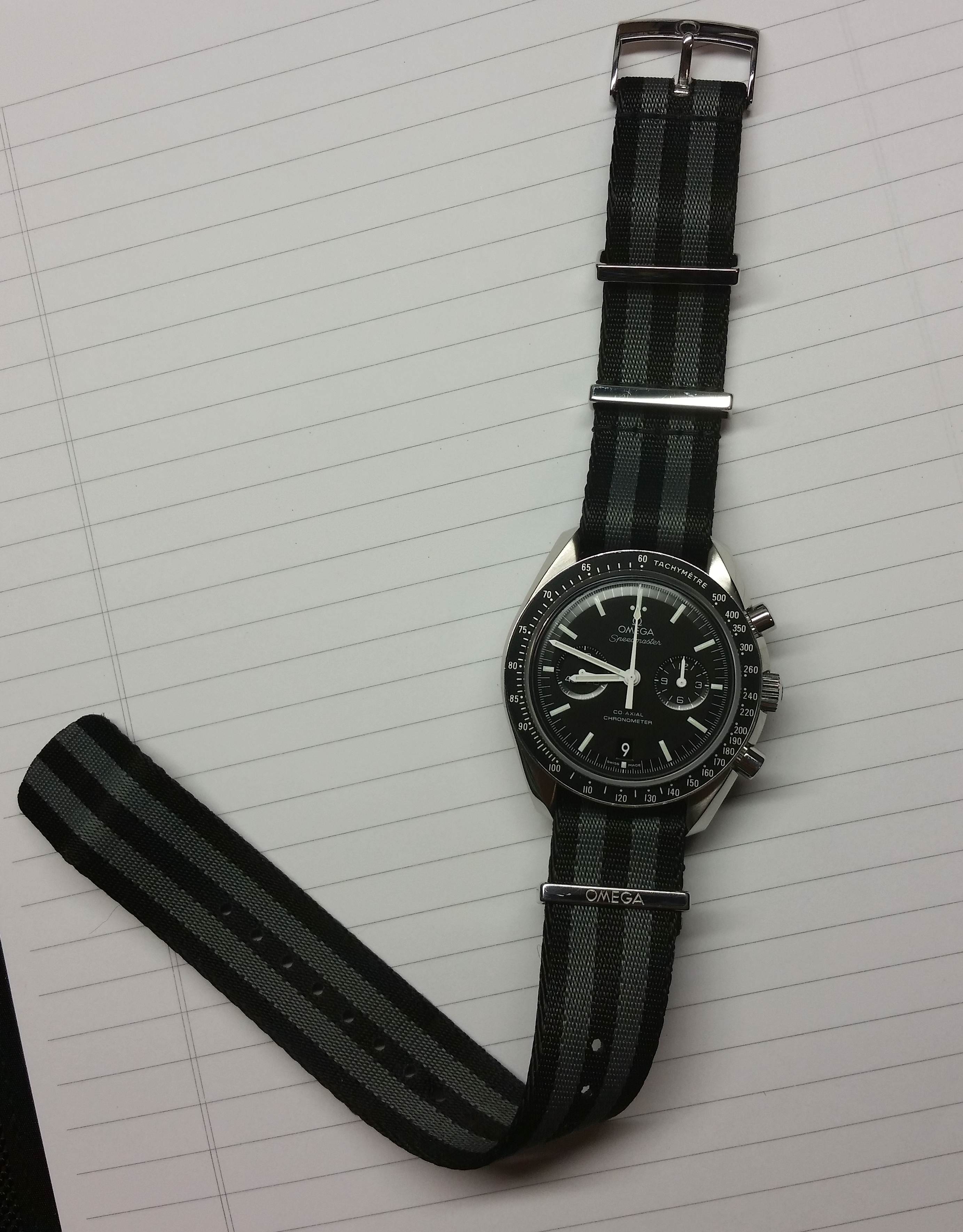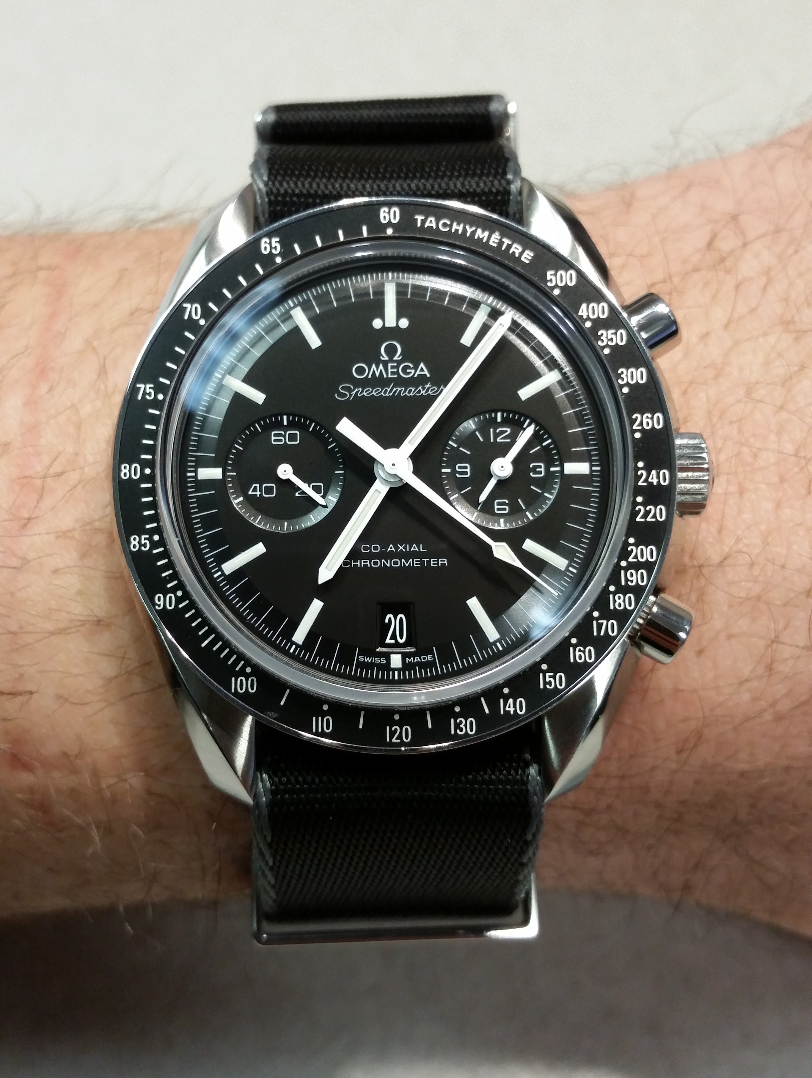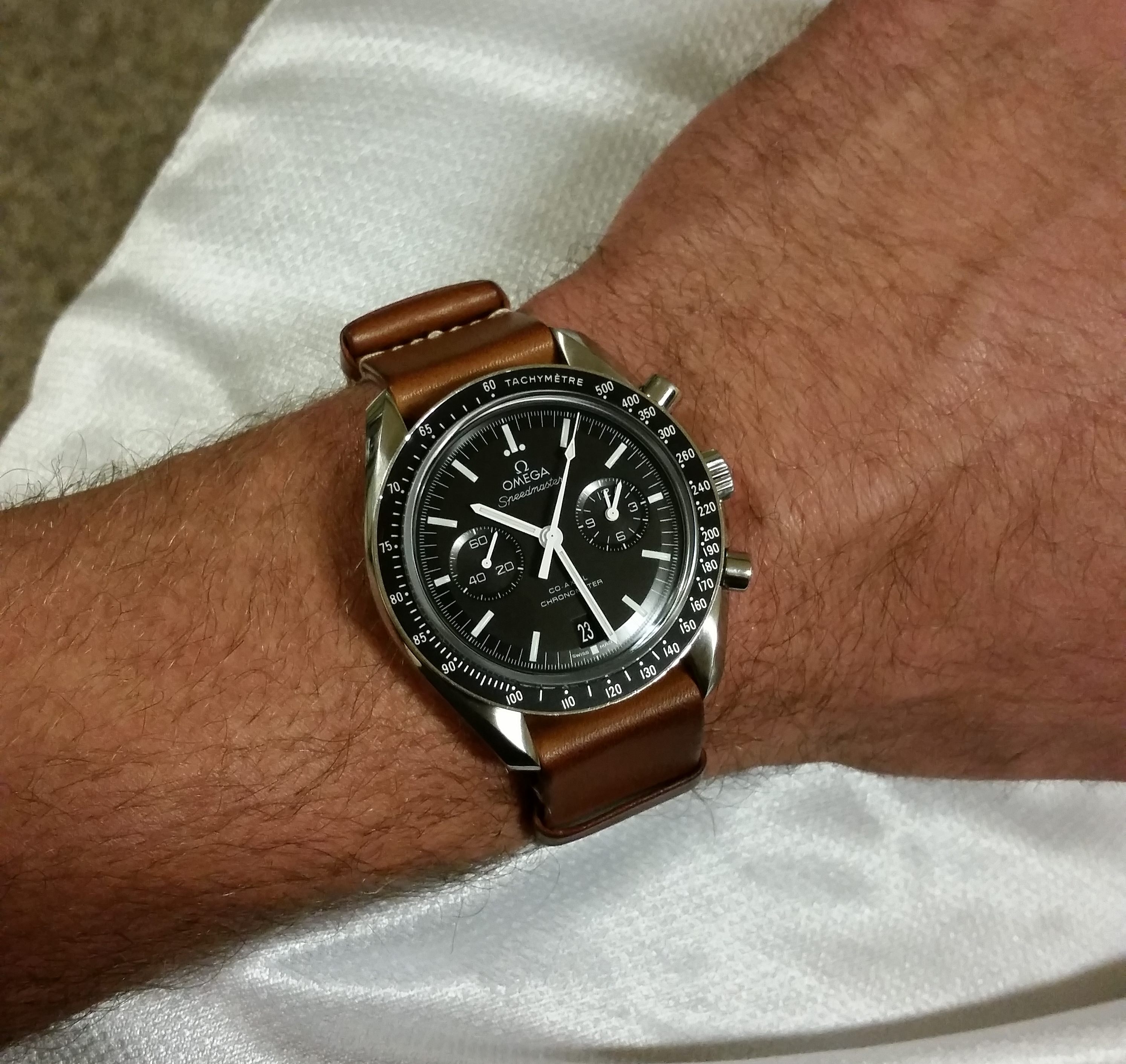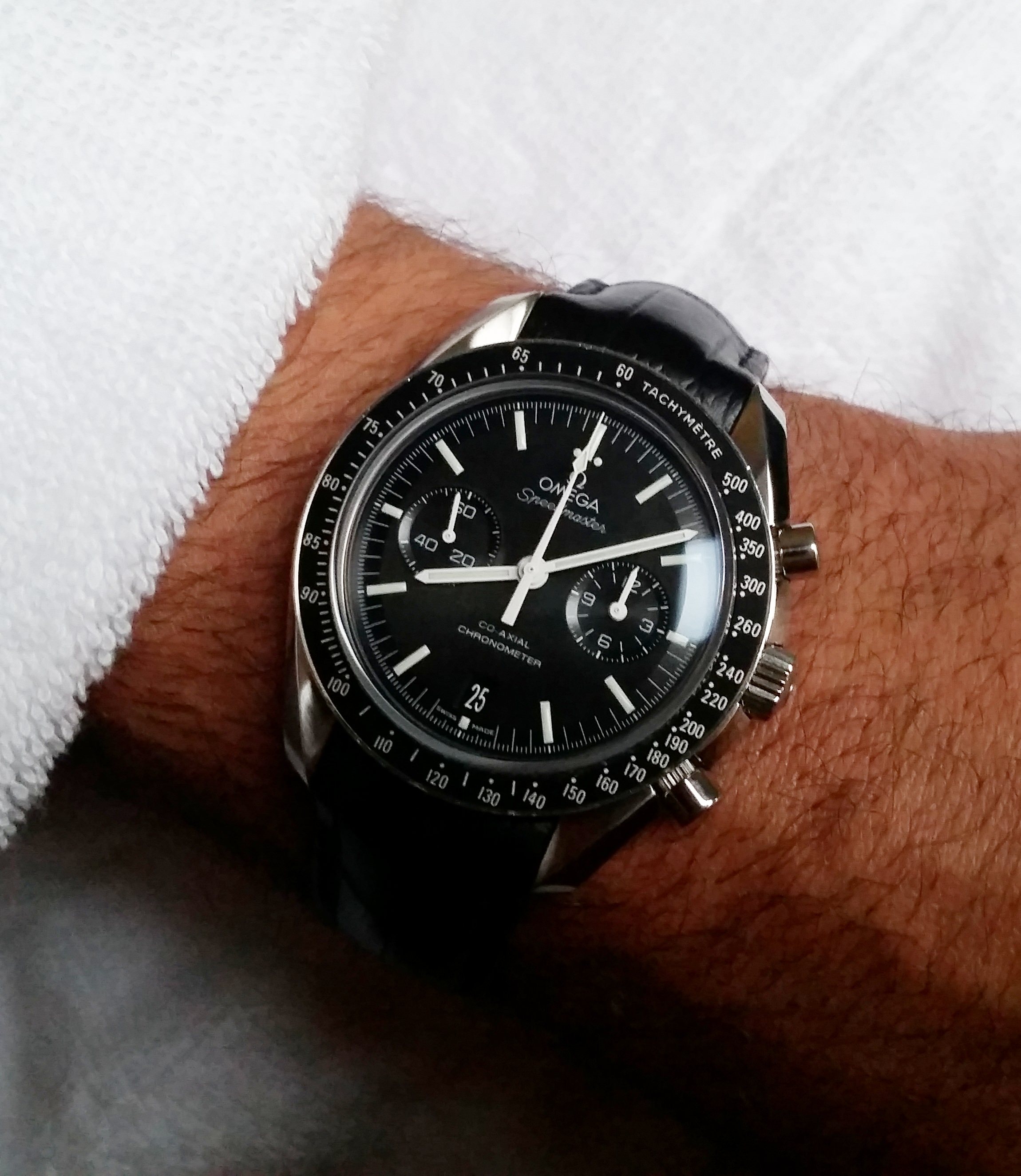 I've exclusively worn my SSOTM on its stainless steel bracelet, but the watch also looks great on a leather strap (https://omegaforums.net/threads/speedmaster-co-axial-chrono-44-25mm.8920/). Like other variations of the Speedmaster, this is a watch that can be dressed up or down. Although I would feel less inclined to put this model on a distressed leather strap or a NATO than I would an older Speedy.