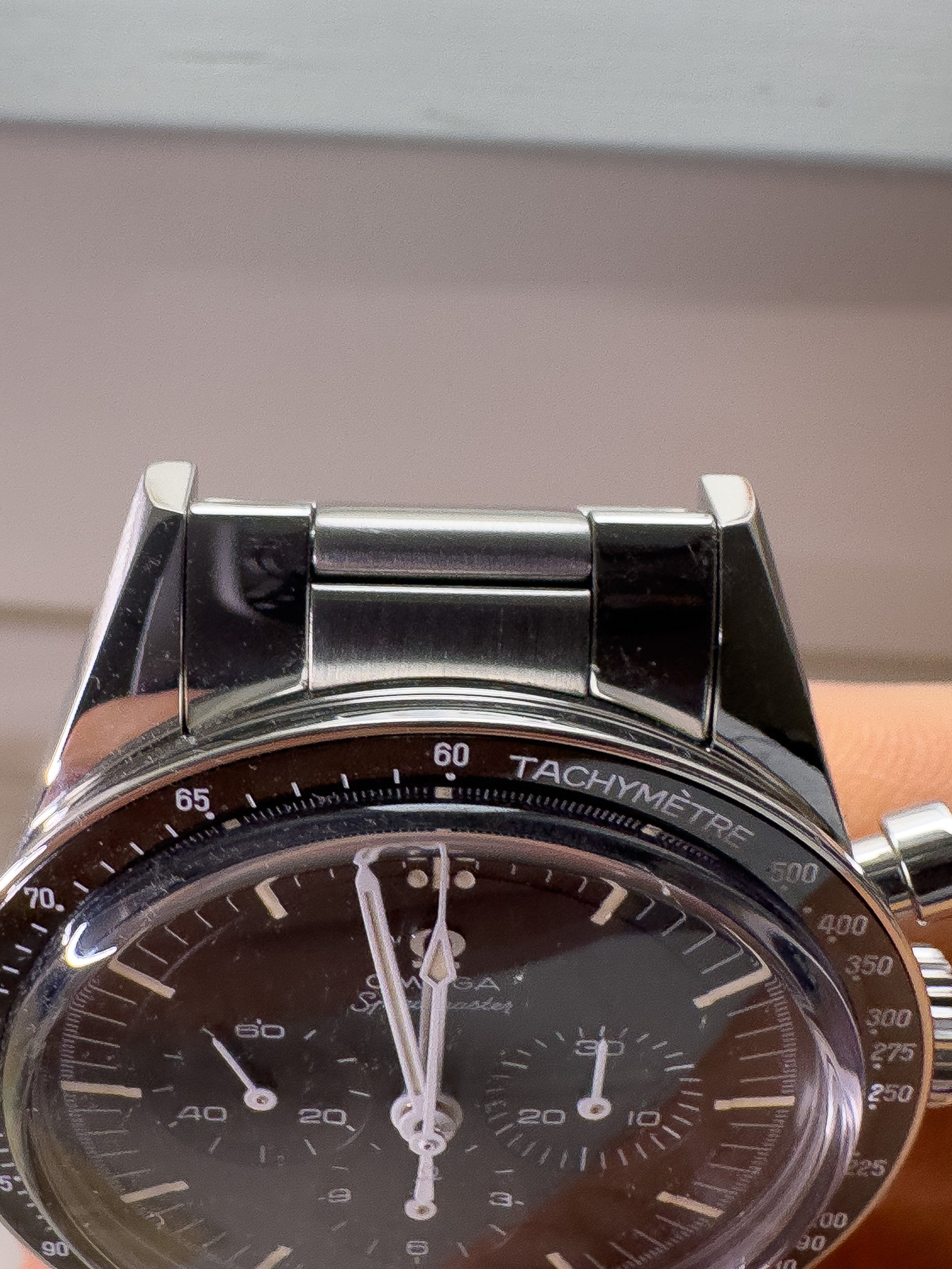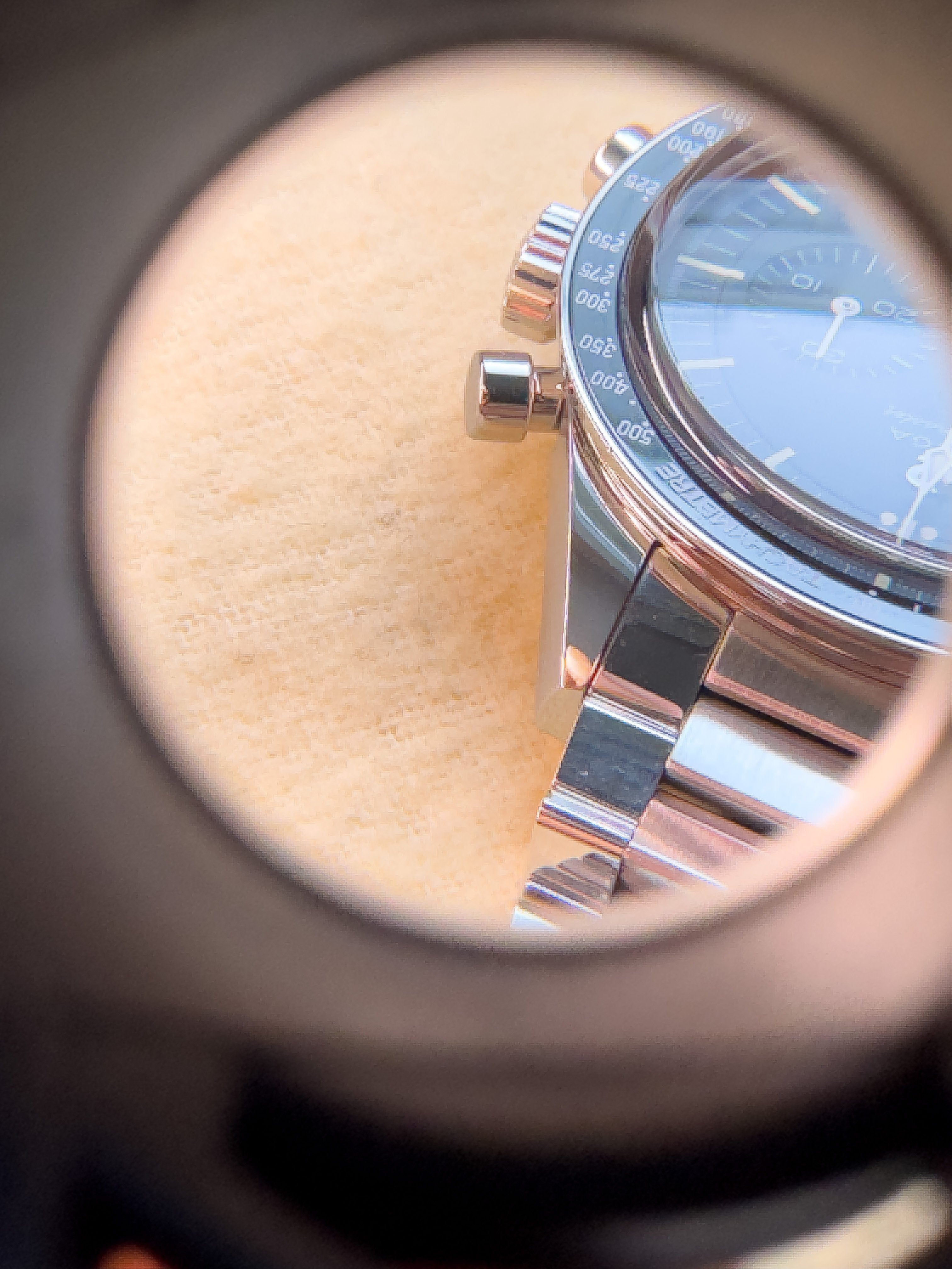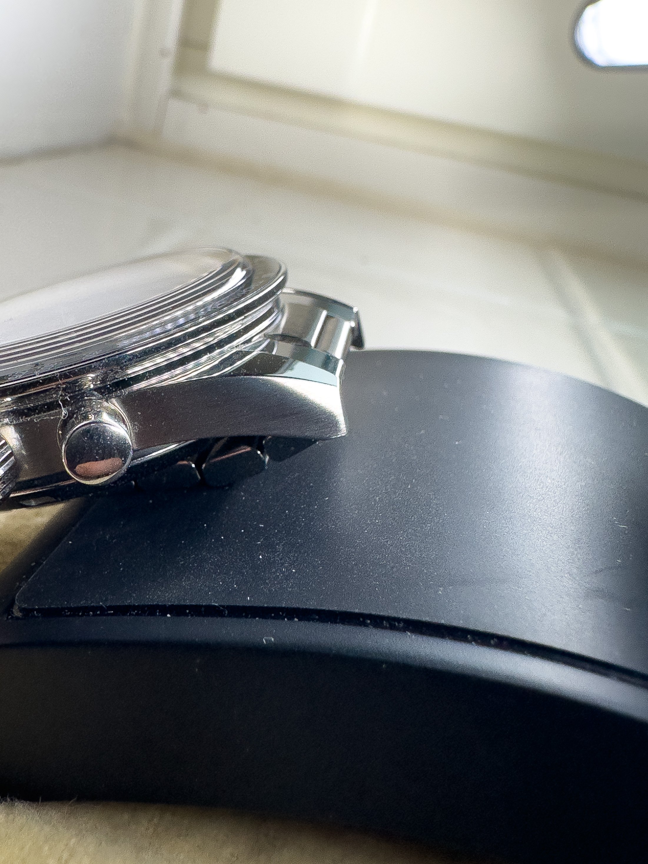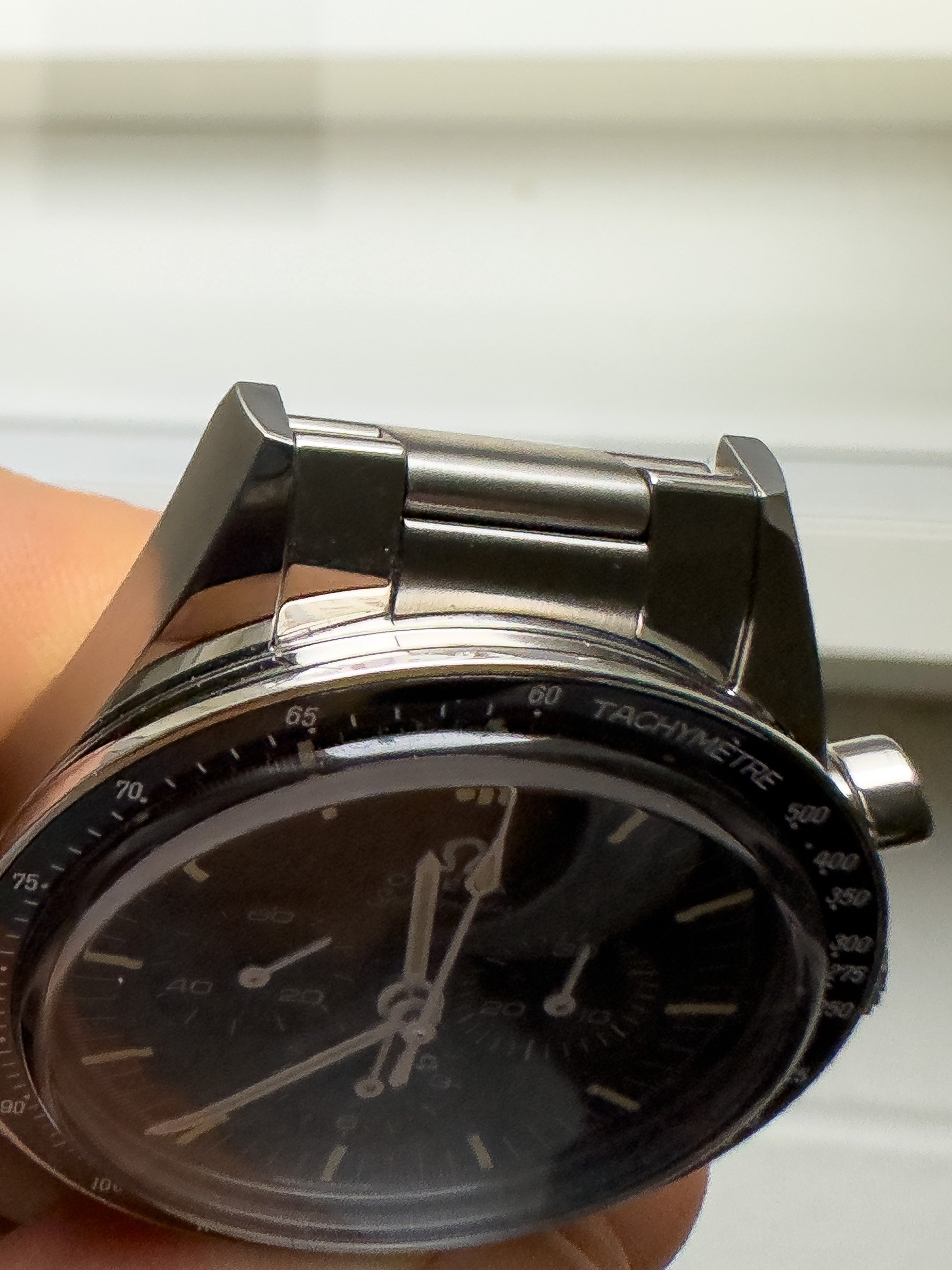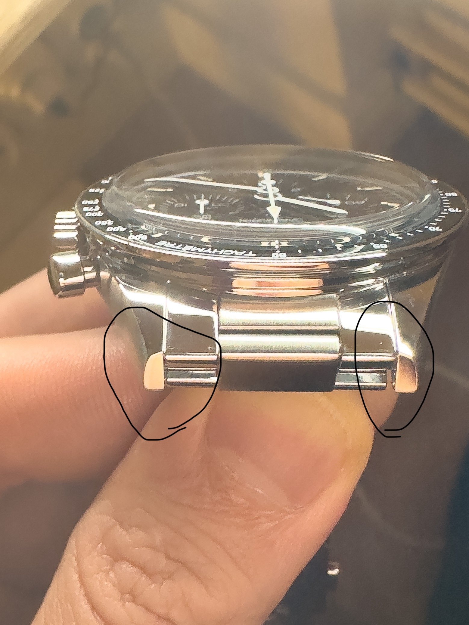 Not that it looks like polished, but the tips of the lugs just are not identical in each corner. The left lug (where the pushers are) looks it slightly leans more towards to bezel side.